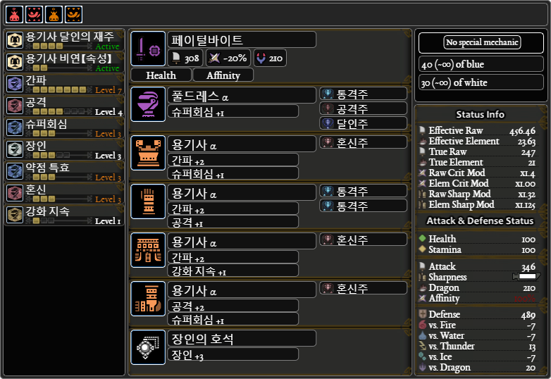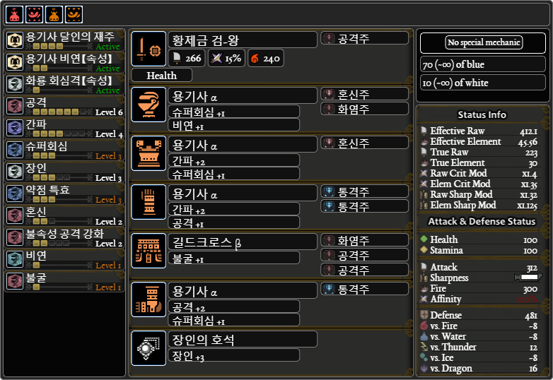 속성치 330이니까 유수주 3개 박고, 대충 회심땡기고(15+15+5+50+20=105) 장인은 대충 3 넣었습니다.