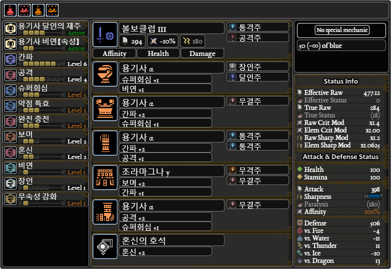 대충 간파1 빼면 딱 회심 100. 1레벨 슬롯 2개 남는건 체력주 2개 넣으면 살짝 올라가겠지만 392쯤 되겠죠.