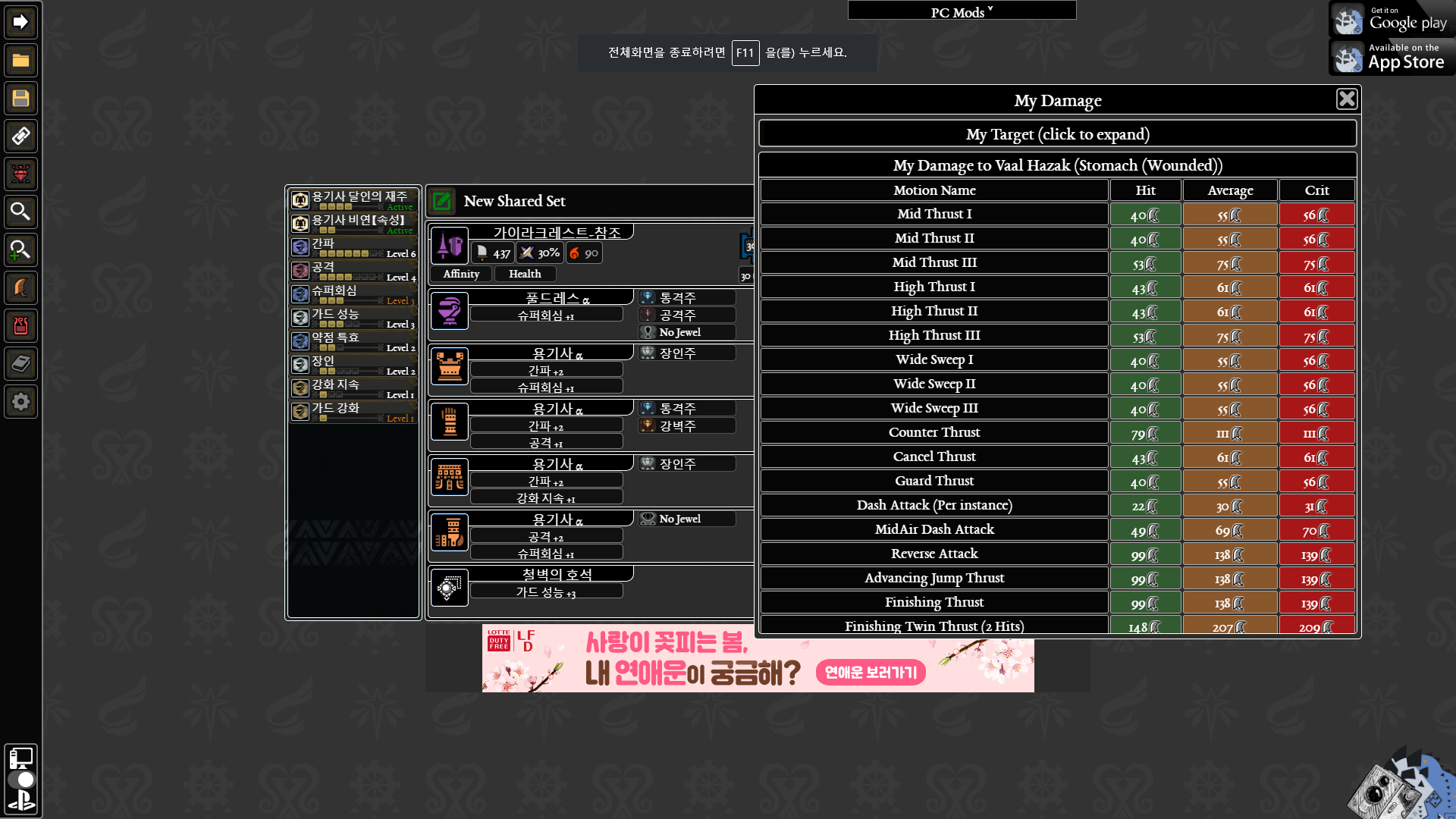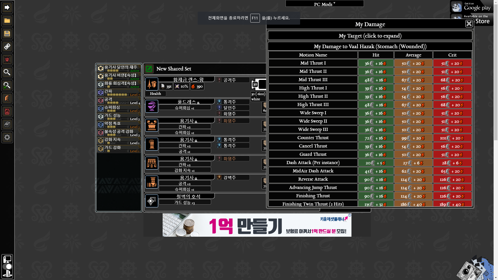 불속성 공격강화는 3이나 4나 상단찌르기 막타 기준 1이 차이나서 그냥 3만 넣었습니다.