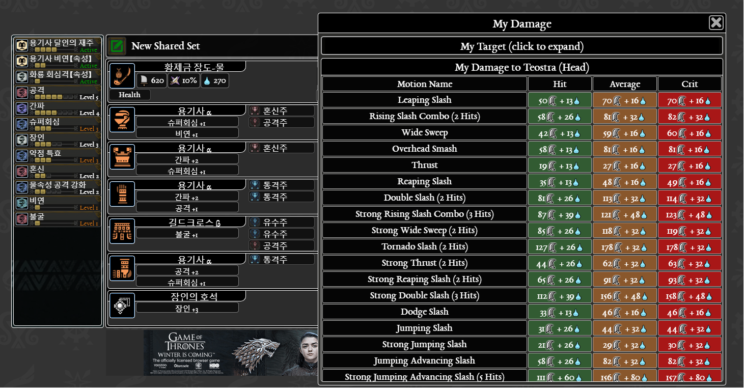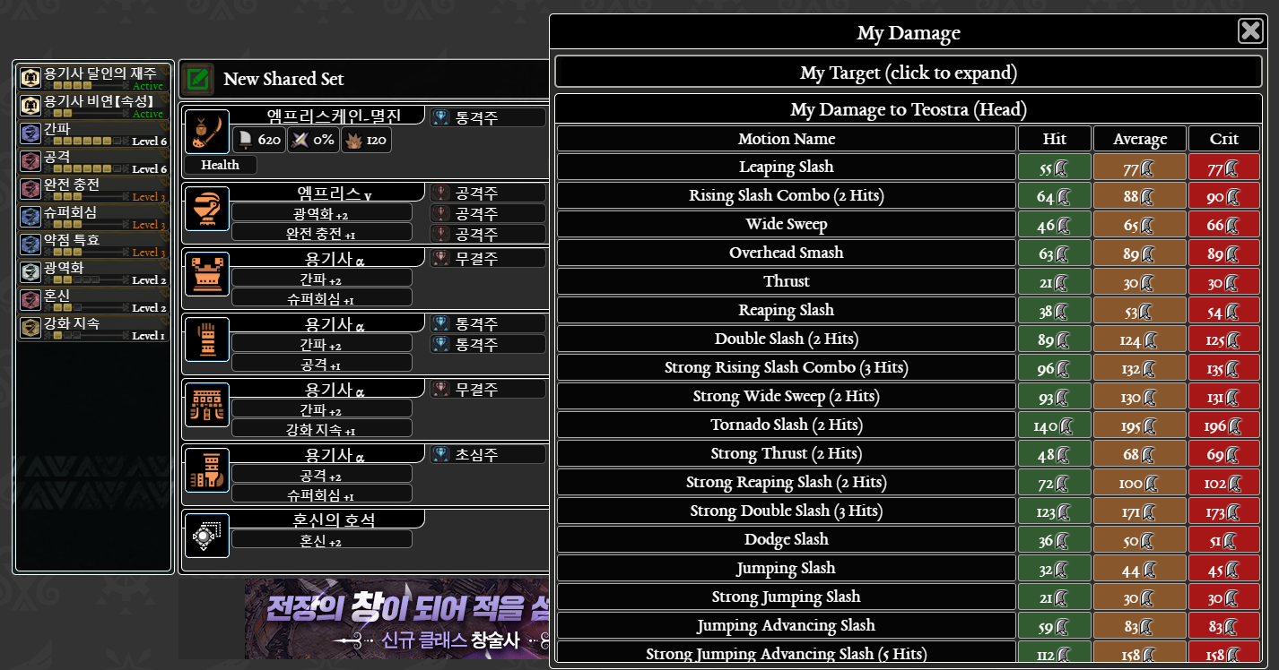 다시 본론으로 돌아가서 오른쪽 표의 데미지를 확인해보면 아시겠지만, 회심 기준 10~40정도까지 차이가 벌어집니다.