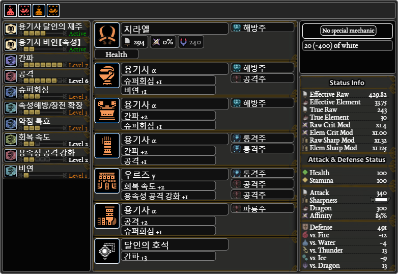 극 베히모스 쌍검 위키룰 1위에 등재된 분의 커스텀입니다. 무기 커강은 회복1은 맞는 것 같고, 나머지 하나는 회심이겠죠 설마 또 회복을 하진 않았을테니;