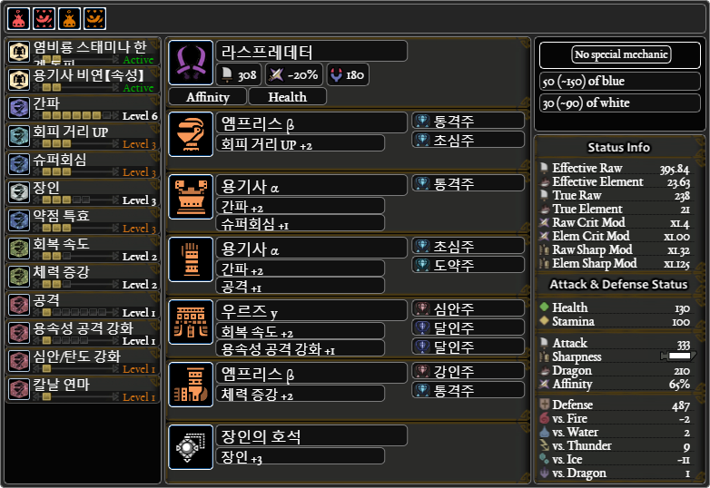 85%를 기본(?) 회심으로 갖고 가고, 달인의 재주나 염왕룡의 무예를 챙긴다면 흰예리도 관리가 꽤 편리해집니다. 쌍검은 타수가 많은 무기다보니 때리다보면 흰예리도가 슬슬 사라지긴 합니다만...