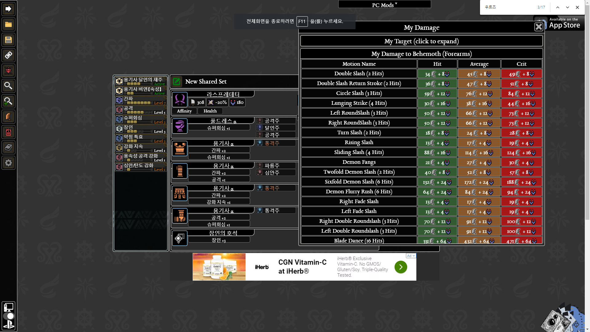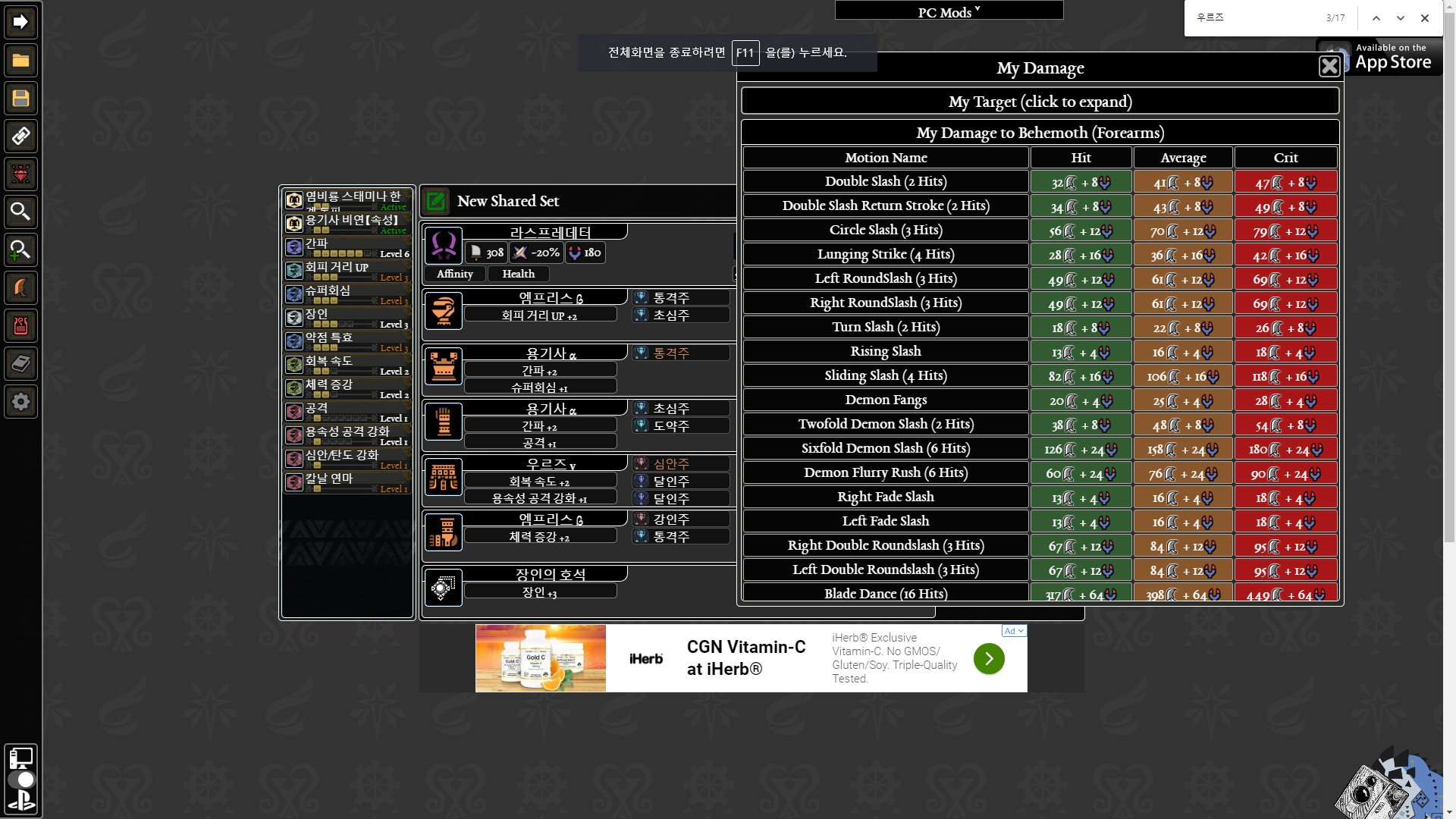 일반 베히모스 쌍검 위키룰 1위에 등재된 분의 커스텀입니다. 무기커강은 습관적으로 회복 설정 했는데 영상으로 봐선 회심으로 했을 것 같습니다.