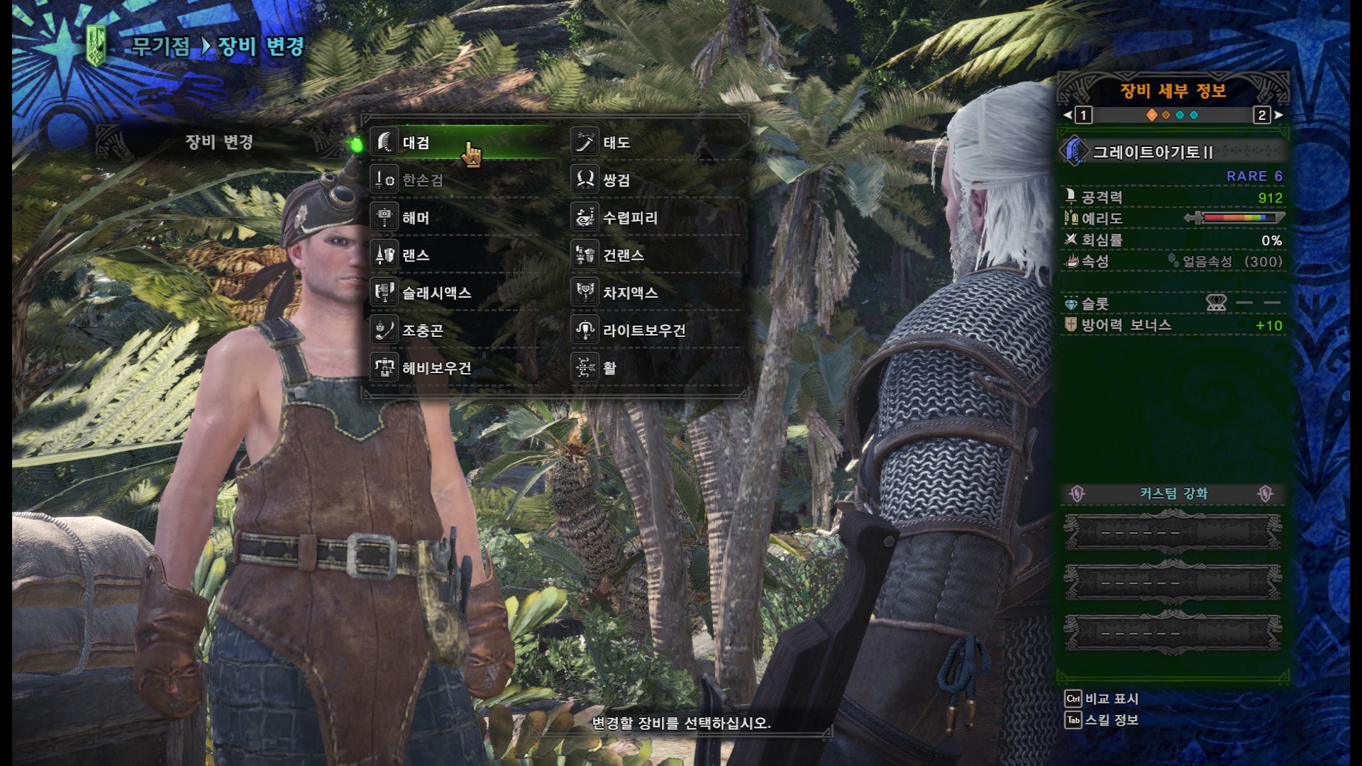 커스텀 강화가 안되어있고, 한손검 장비 외에는 구린 편이라 퀘스트가 조금 어려울 수도 있어요.