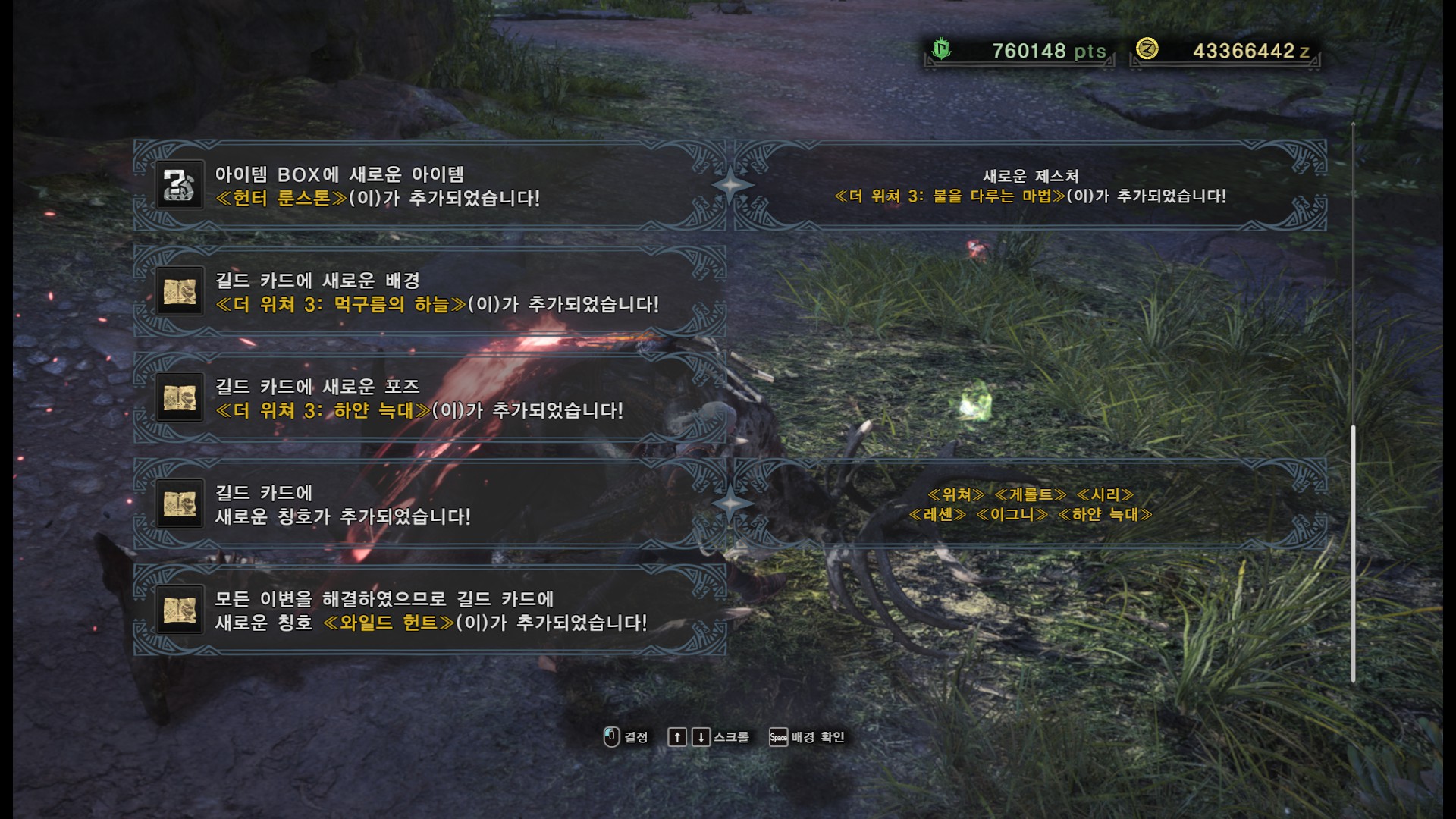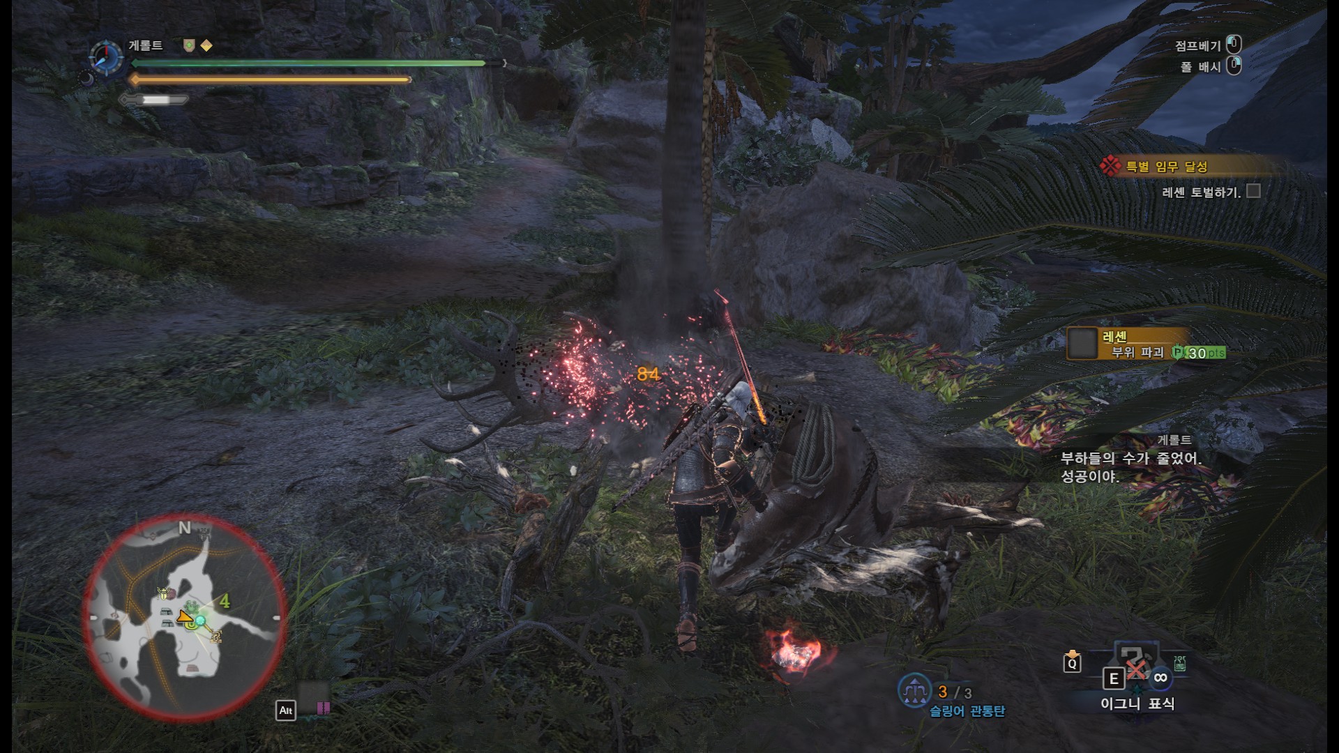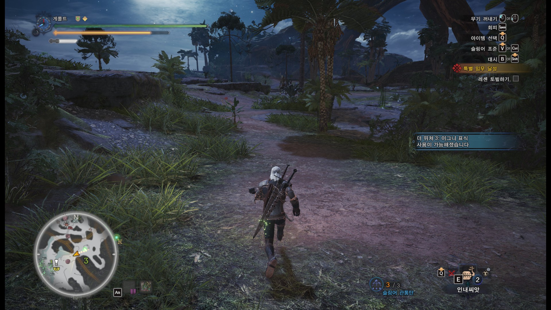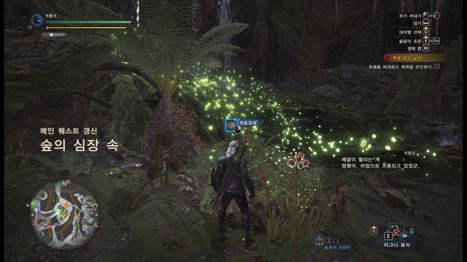 사견으로 메인 퀘스트와 두가지 부가 퀘스트를 한꺼번에 진행하면 시간이 오래 걸리기도 하고, 여러번 깨야 하는 퀘스트기 때문에 처음에는 메인퀘스트와 부가 퀘스트 한개만 진행하시는게 좋을 것 같습니다.(단, 부가퀘스트 2개를 한꺼번에 클리어 할 시에만, "와일드 헌트" 칭호를 받을 수 있습니다)