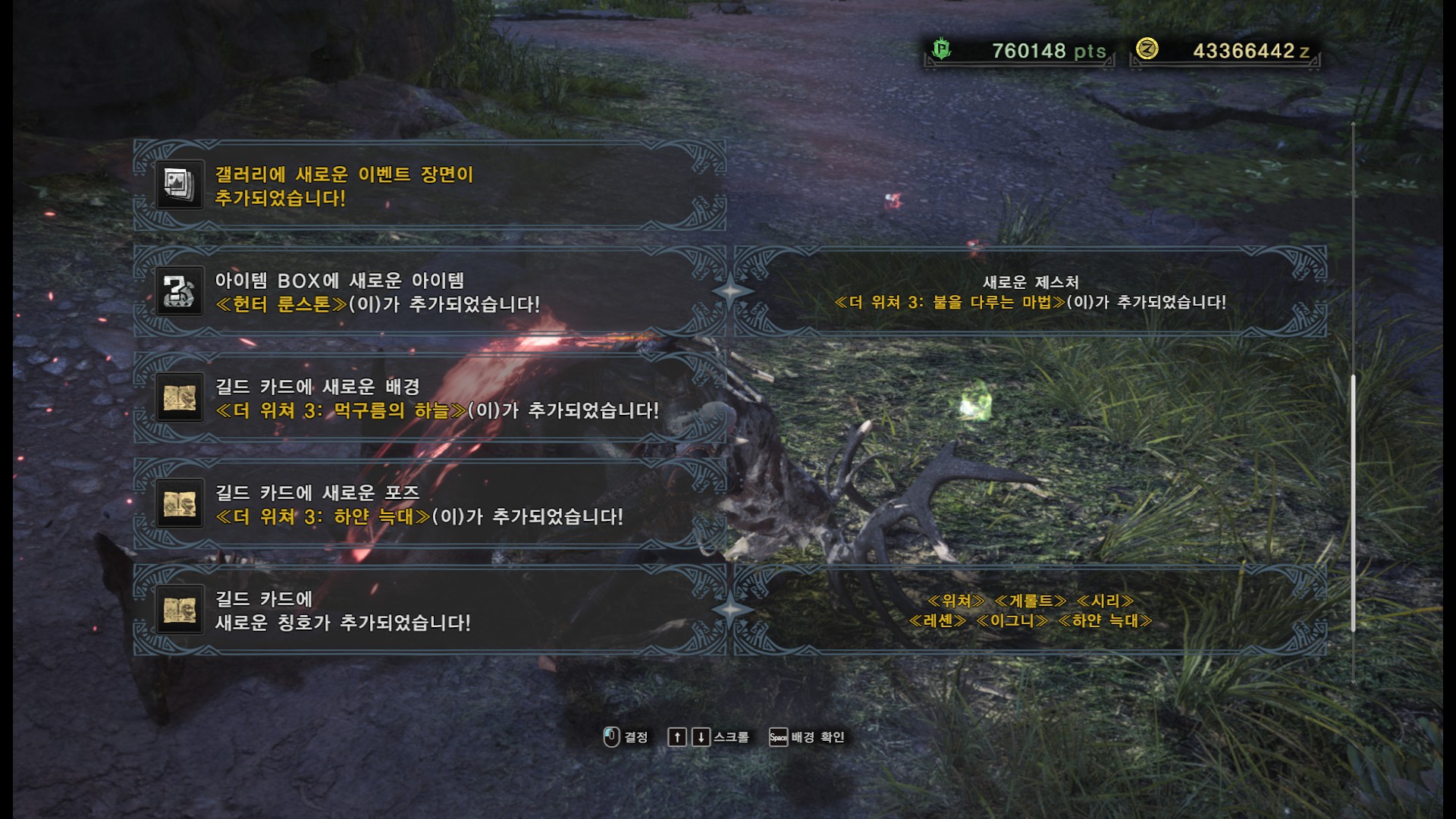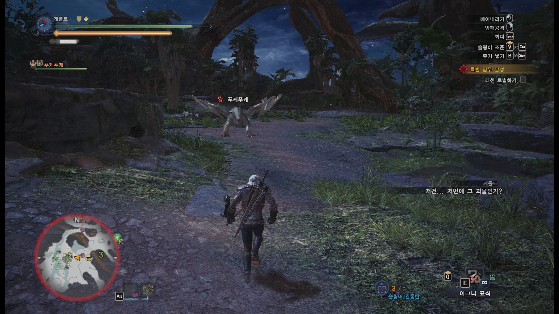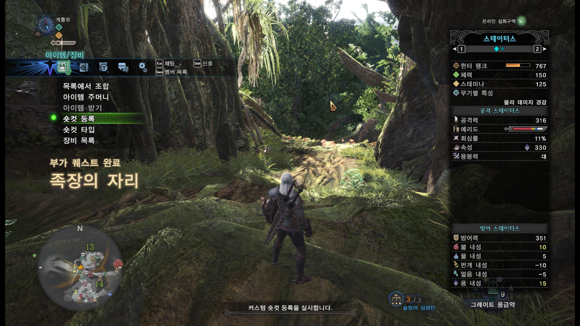 사견으로 메인 퀘스트와 두가지 부가 퀘스트를 한꺼번에 진행하면 시간이 오래 걸리기도 하고, 여러번 깨야 하는 퀘스트기 때문에 처음에는 메인퀘스트와 부가 퀘스트 한개만 진행하시는게 좋을 것 같습니다.(단, 부가퀘스트 2개를 한꺼번에 클리어 할 시에만, "와일드 헌트" 칭호를 받을 수 있습니다)