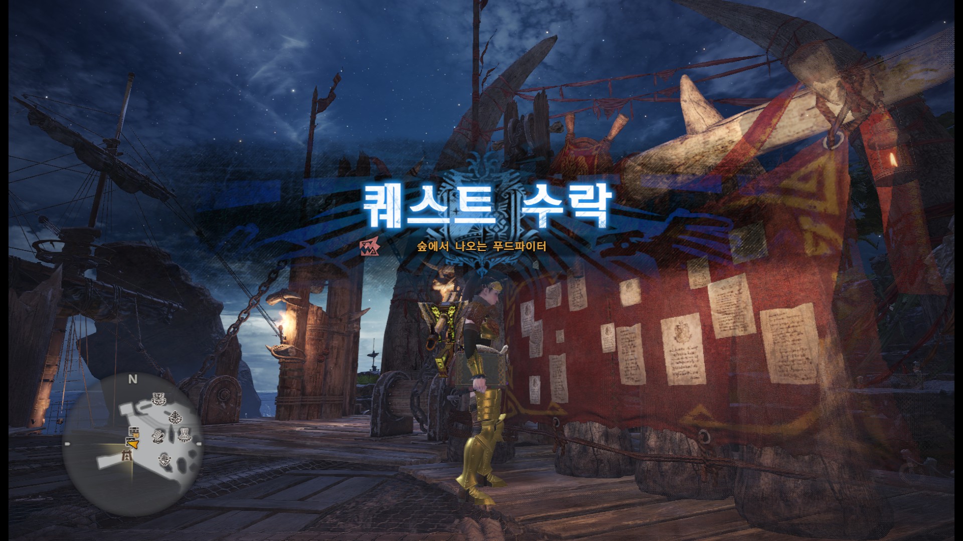 넥커는 밤에만 나오기 때문에, 아무 지역이나 탐색가서 시간을 좀 보내다가 밤시간대로 바뀌면 귀환. 조사거점 배경 확인. 밤이라면 2성 자유퀘 "숲에서 나오는 푸드파이터" 수주. 1번 캠프로 출발.