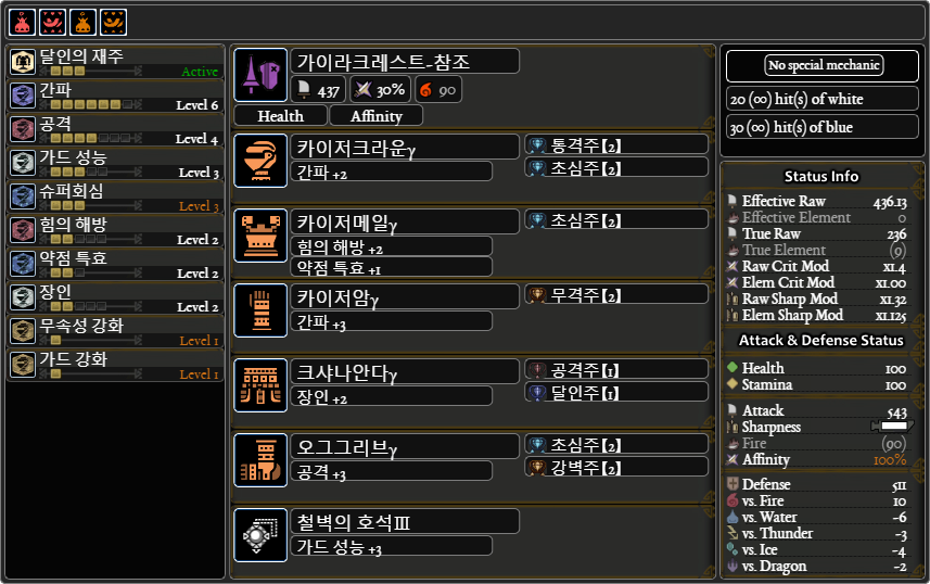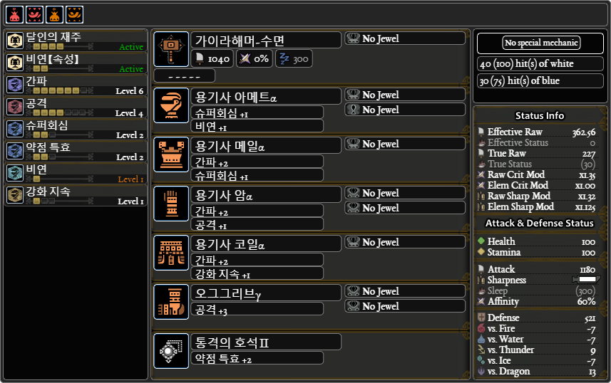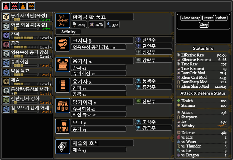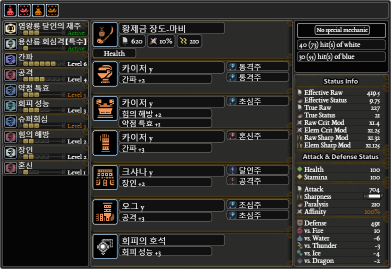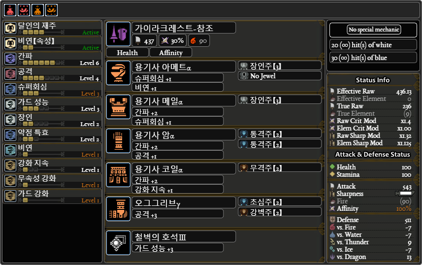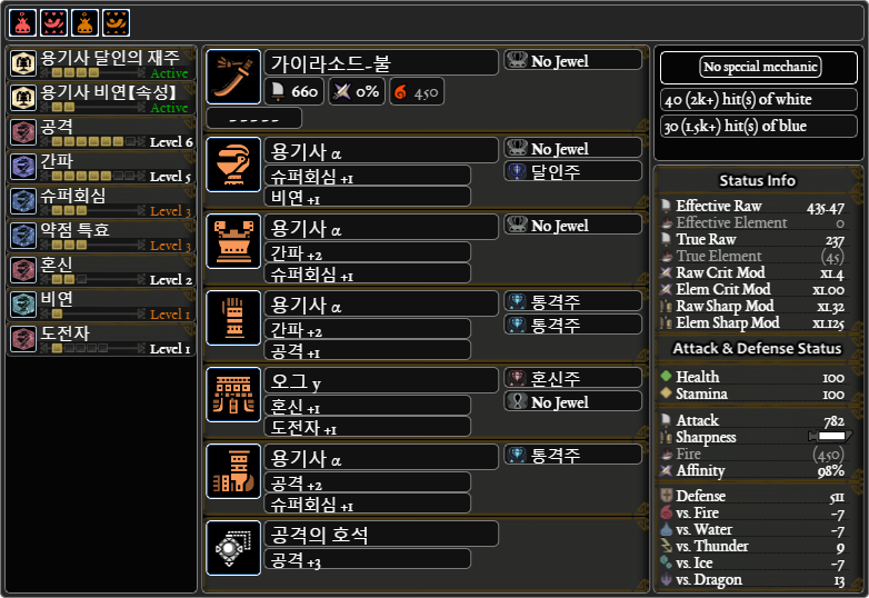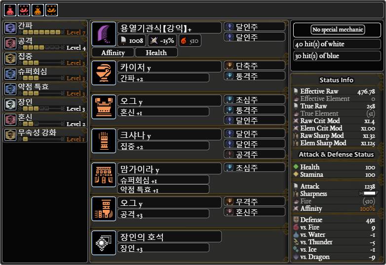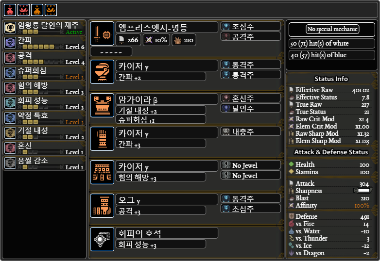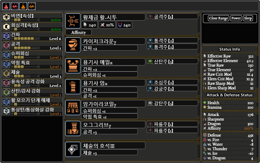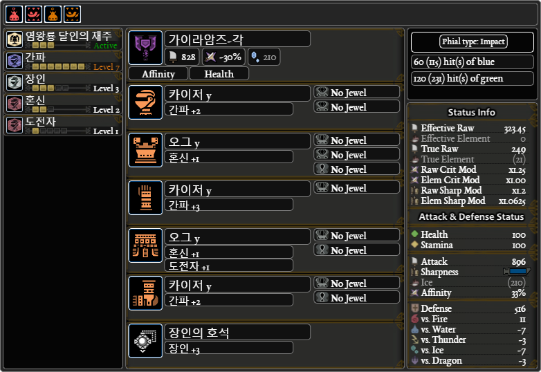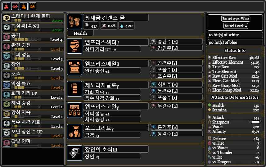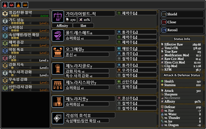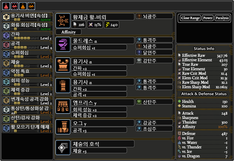 완전충전을 배제하고 도전자나 도전자+약점특효1을 혼용해서 회심100%를 채우는 커스텀도 있긴한데, 오그 감마 없이도 만들 수 있는 커스텀이라서 생략합니다.