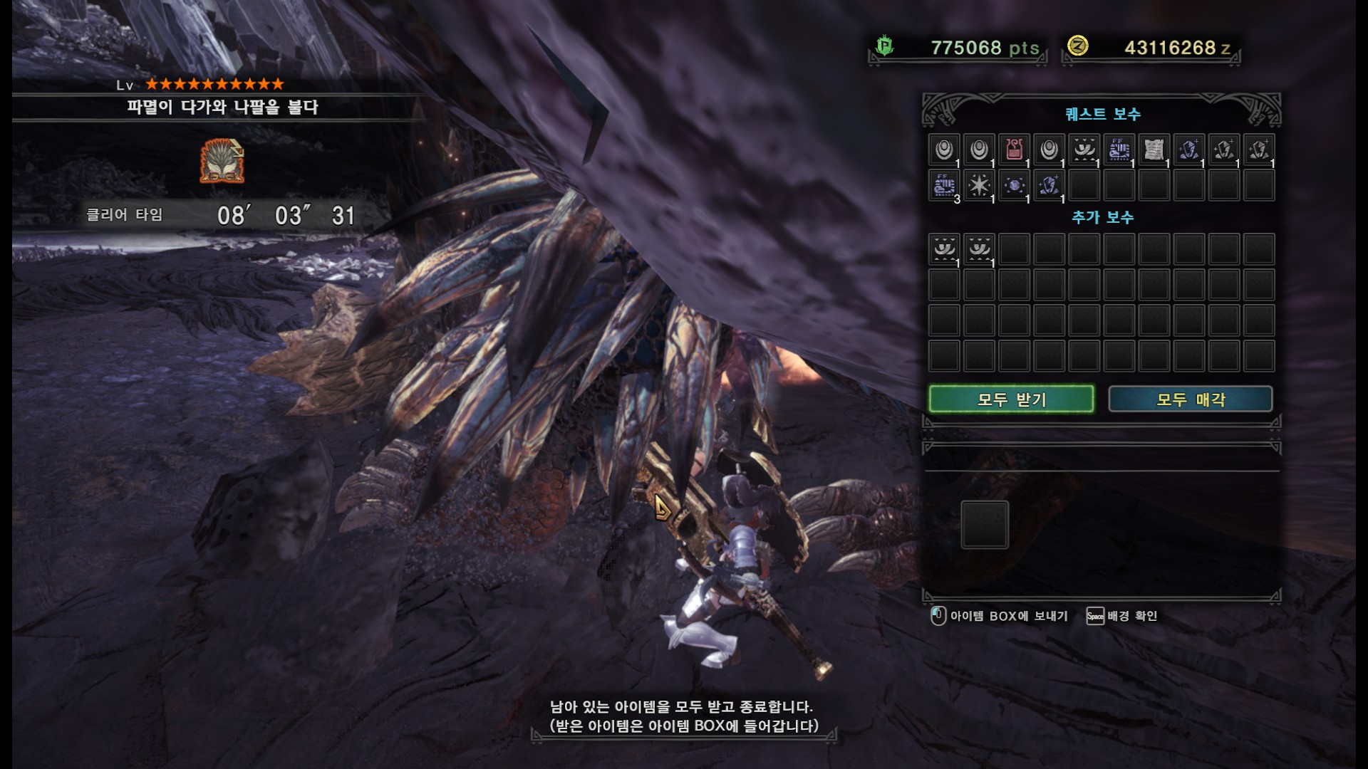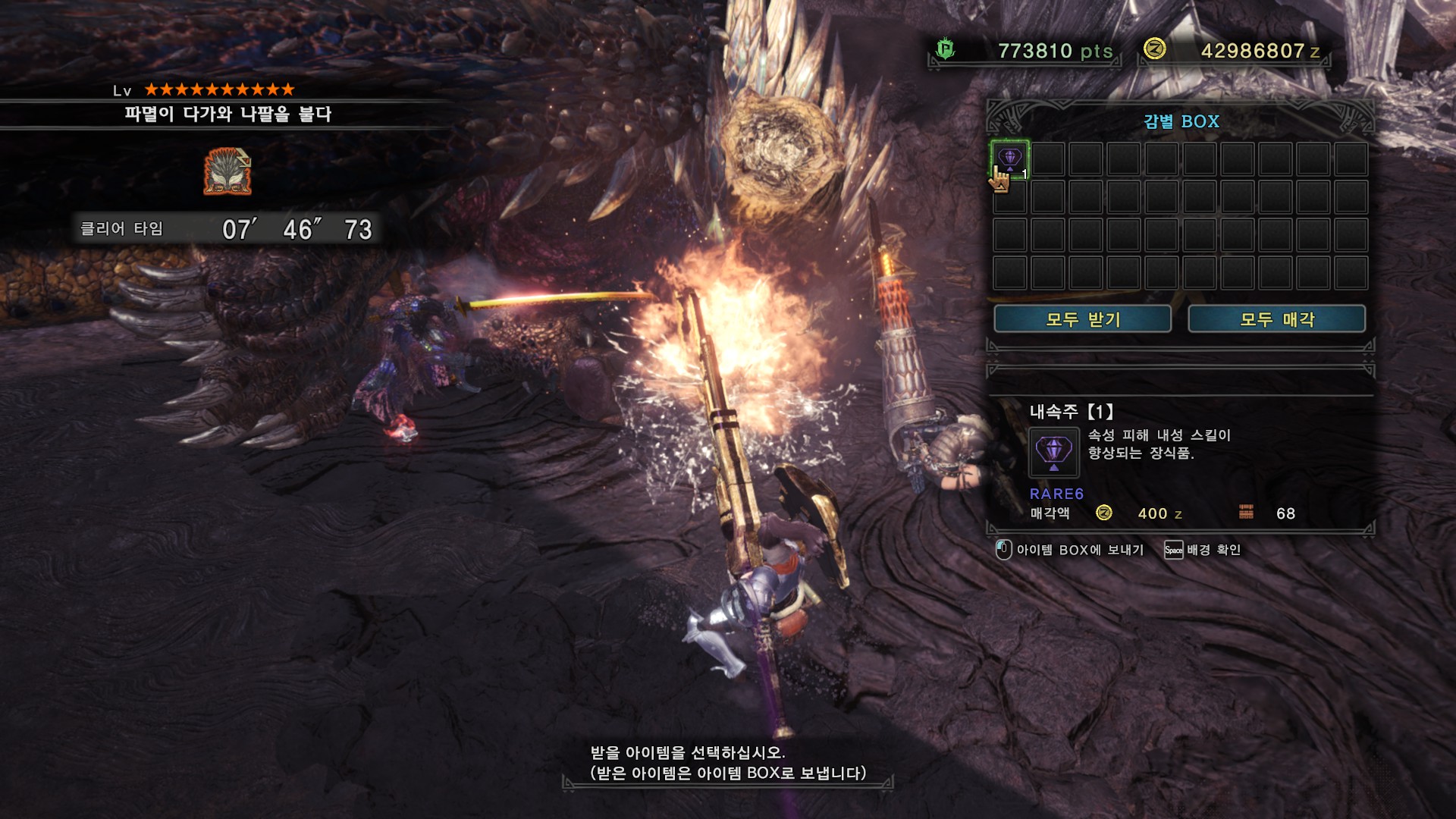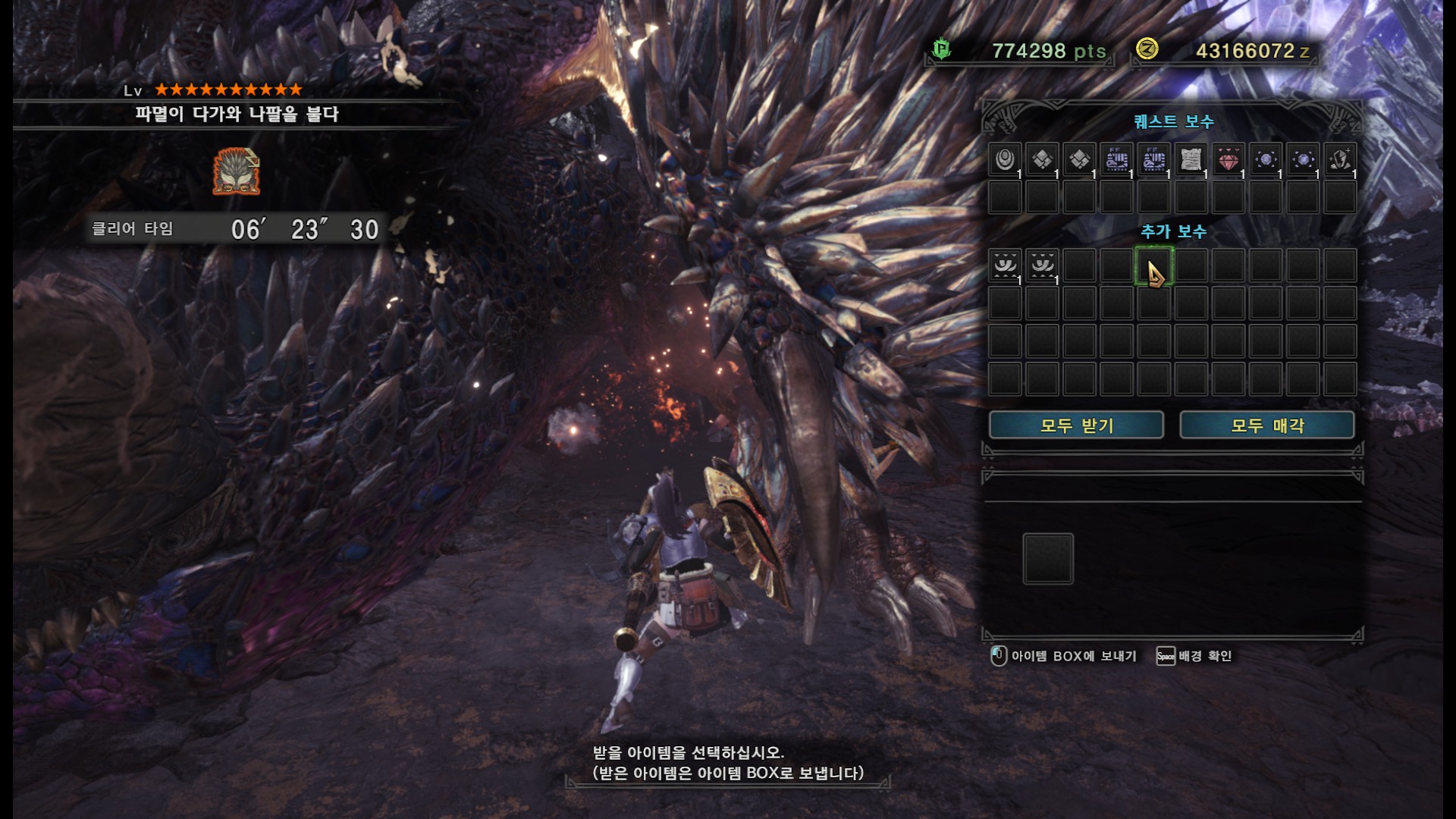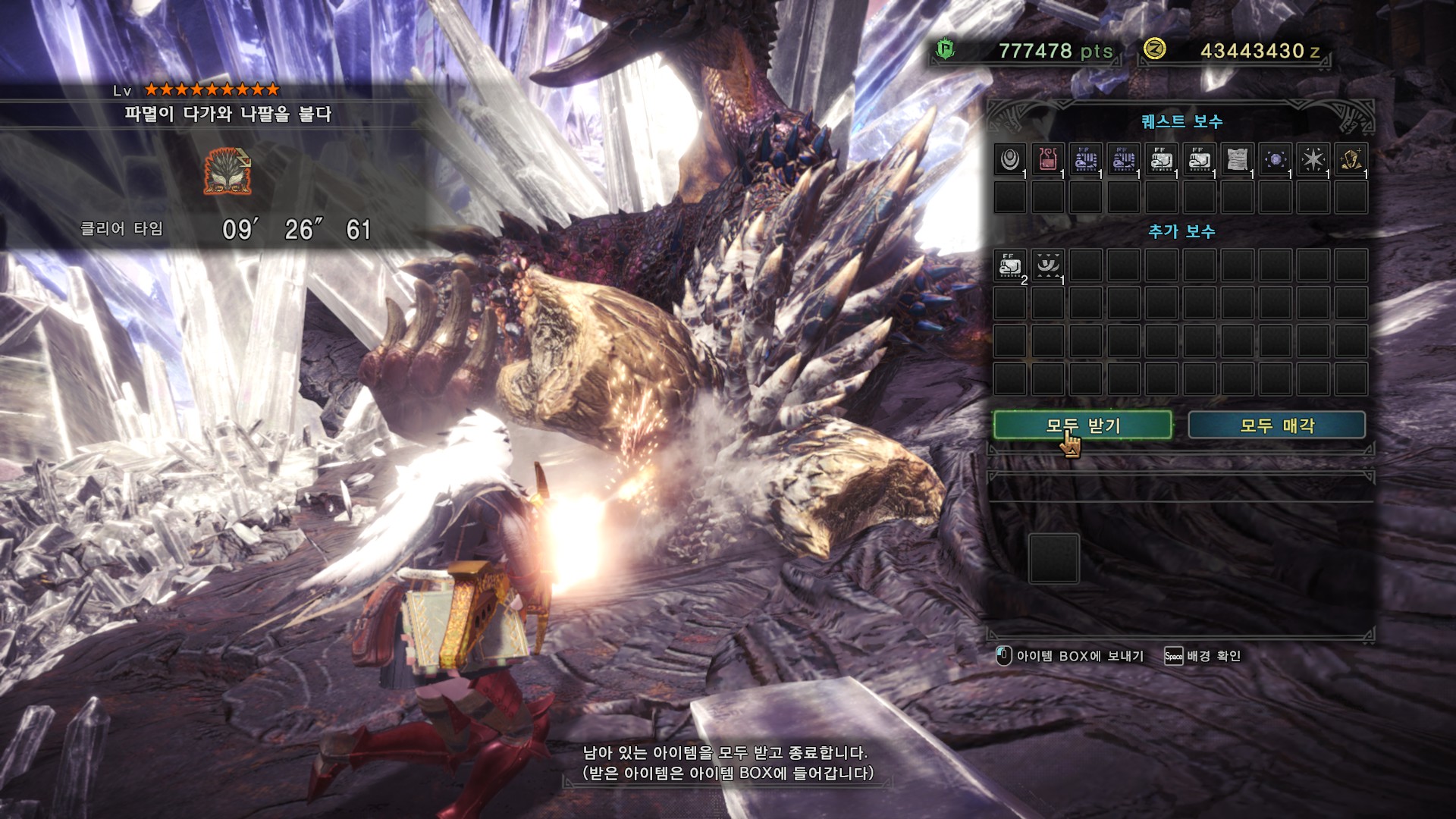 가시가 전부 경화된다면 길게 포효 후 파극멸진선-천을 씁니다. 그런데 머리, 양발, 꼬리, 날개의 가시가 전부 경화되지 않더라도 쓸 때도 있기 때문에 2페이즈 이후로는 긴장하시는게 좋습니다.