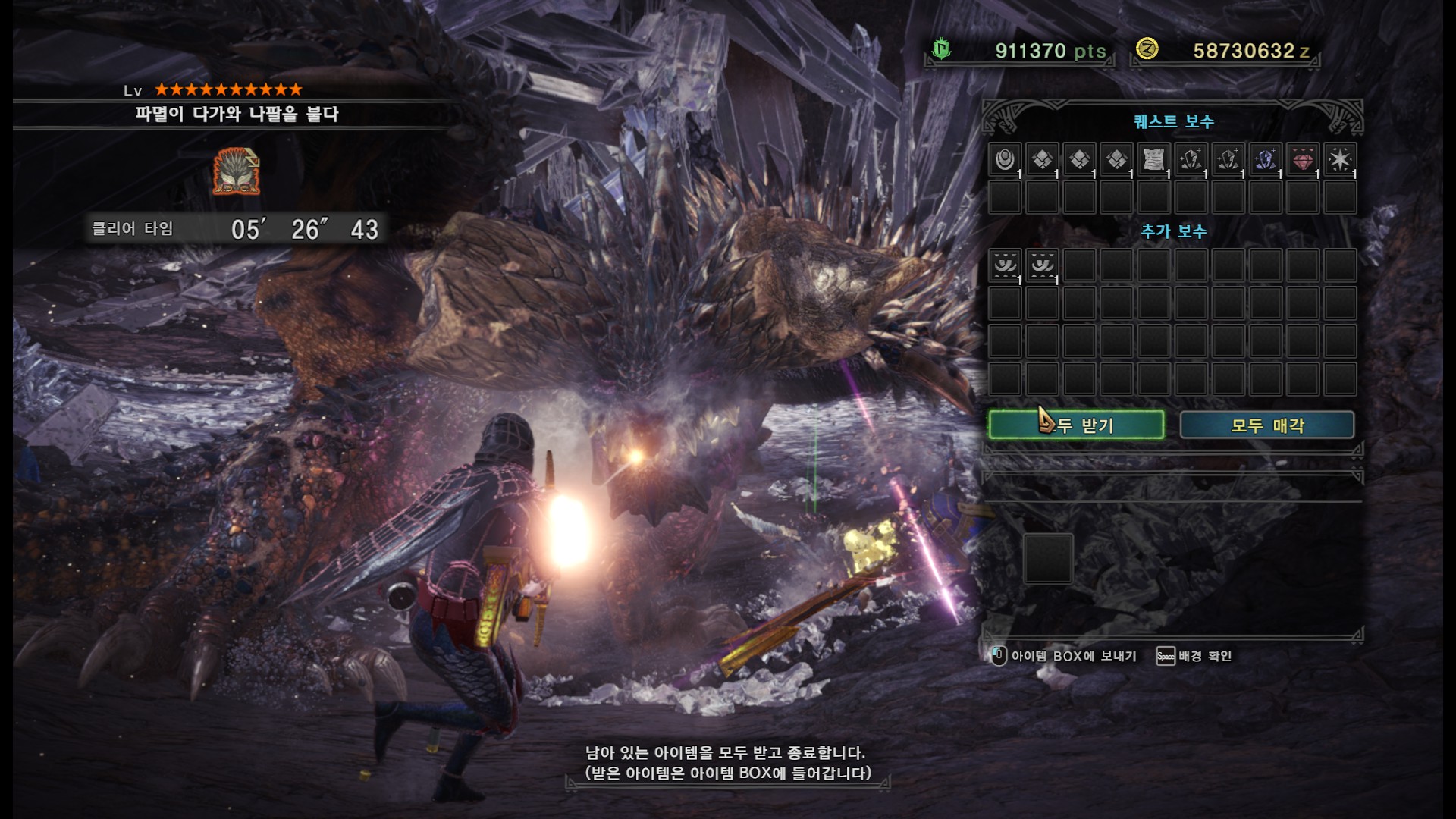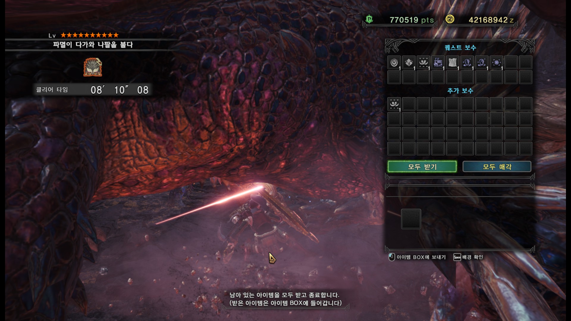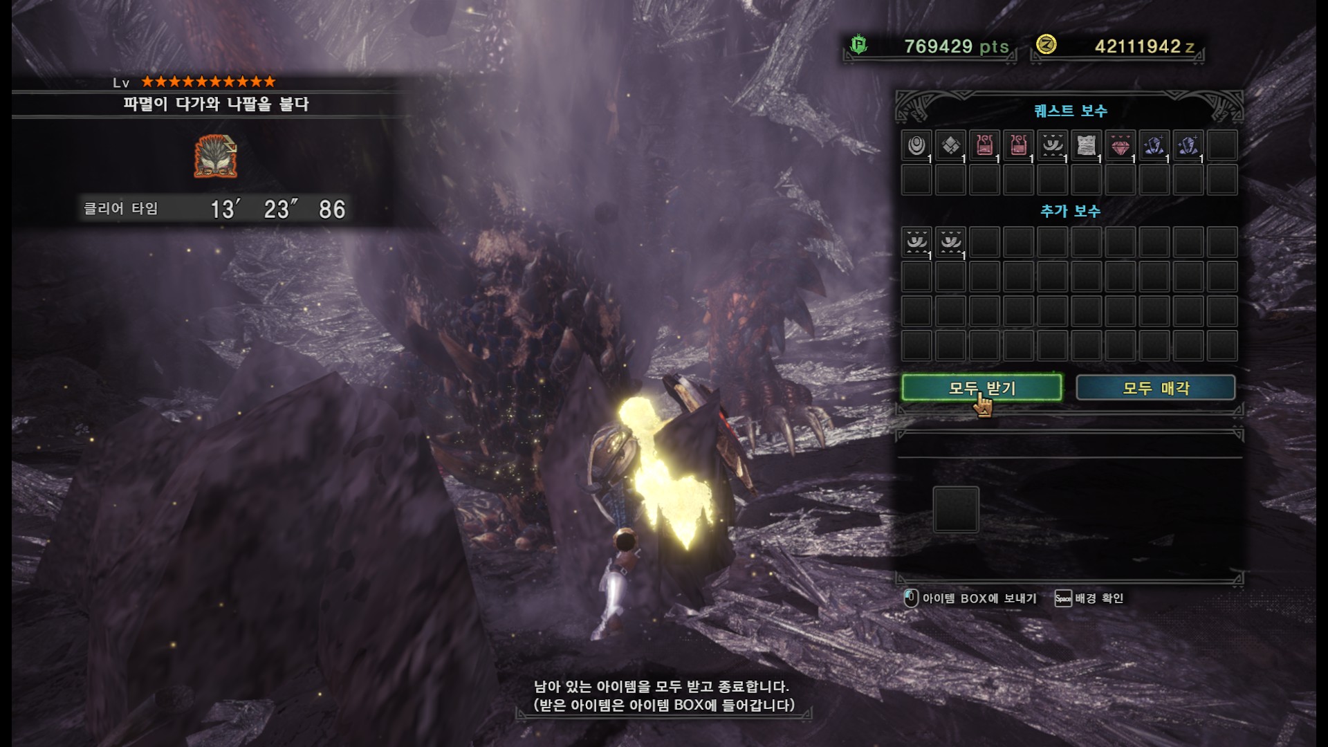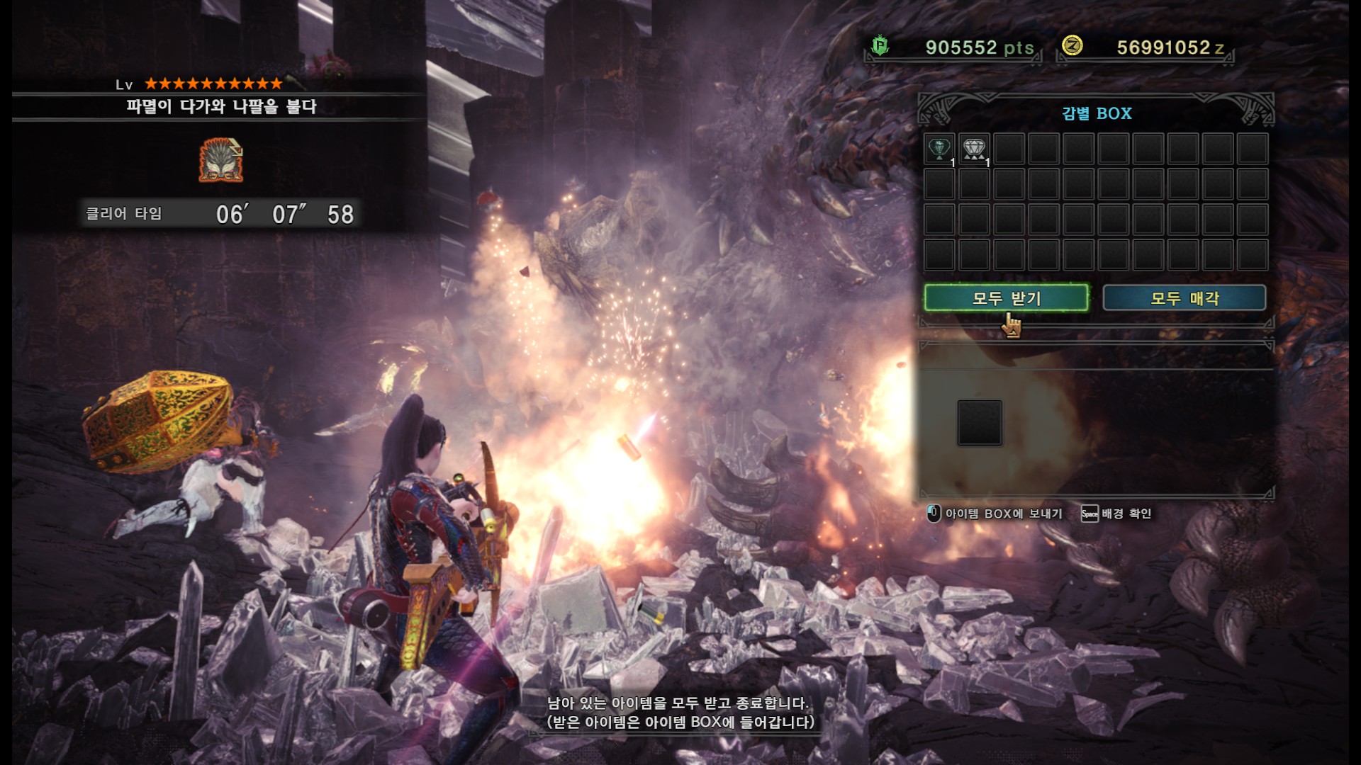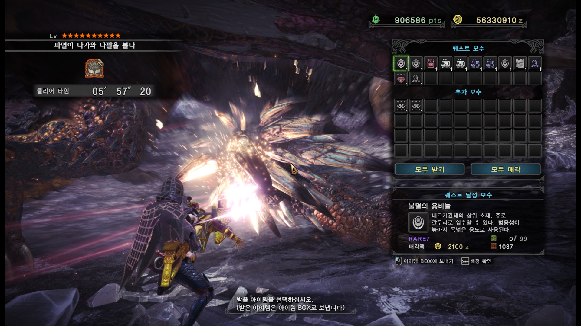 가시가 전부 경화된다면 길게 포효 후 파극멸진선-천을 씁니다. 그런데 머리, 양발, 꼬리, 날개의 가시가 전부 경화되지 않더라도 쓸 때도 있기 때문에 2페이즈 이후로는 긴장하시는게 좋습니다.