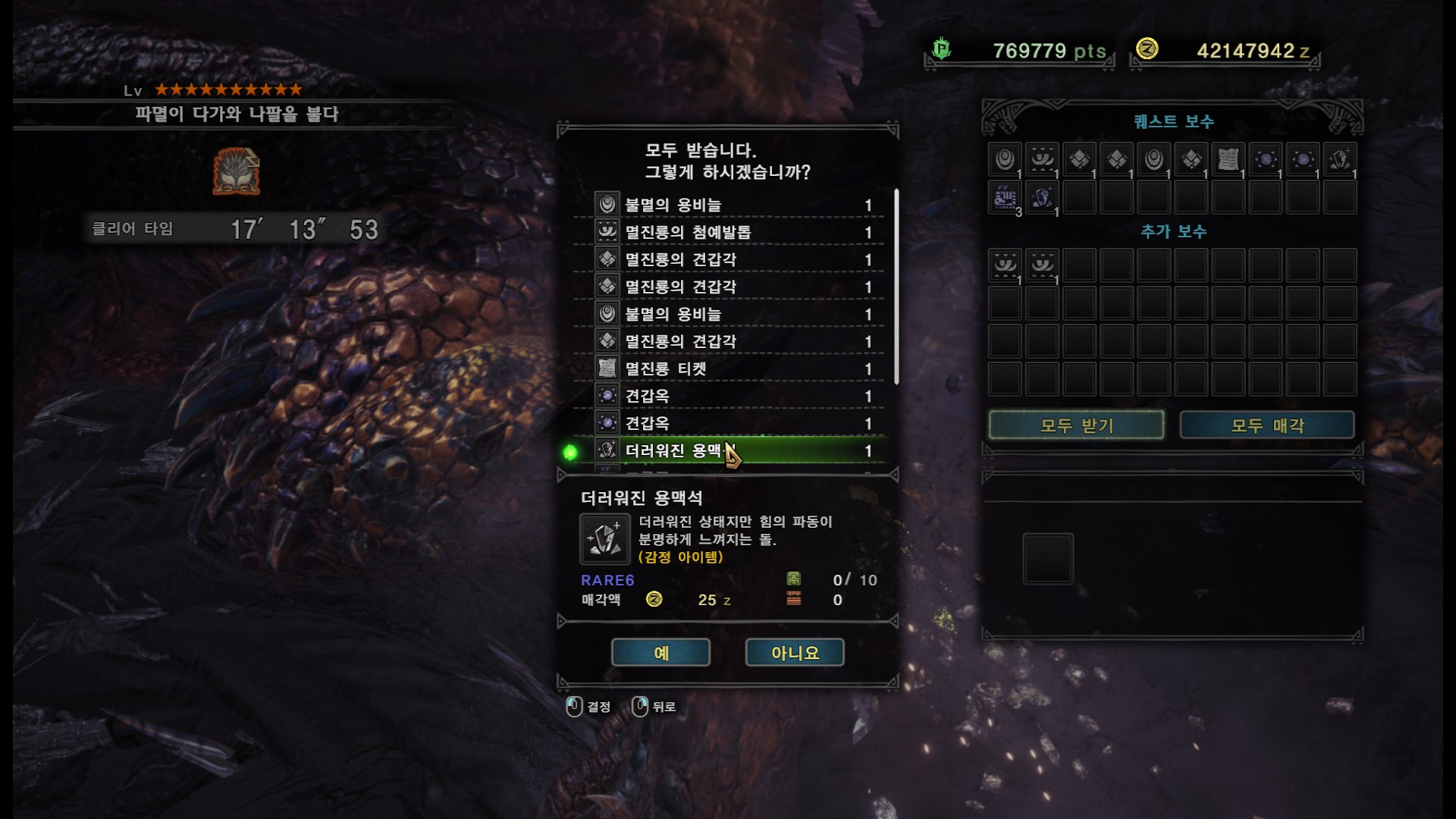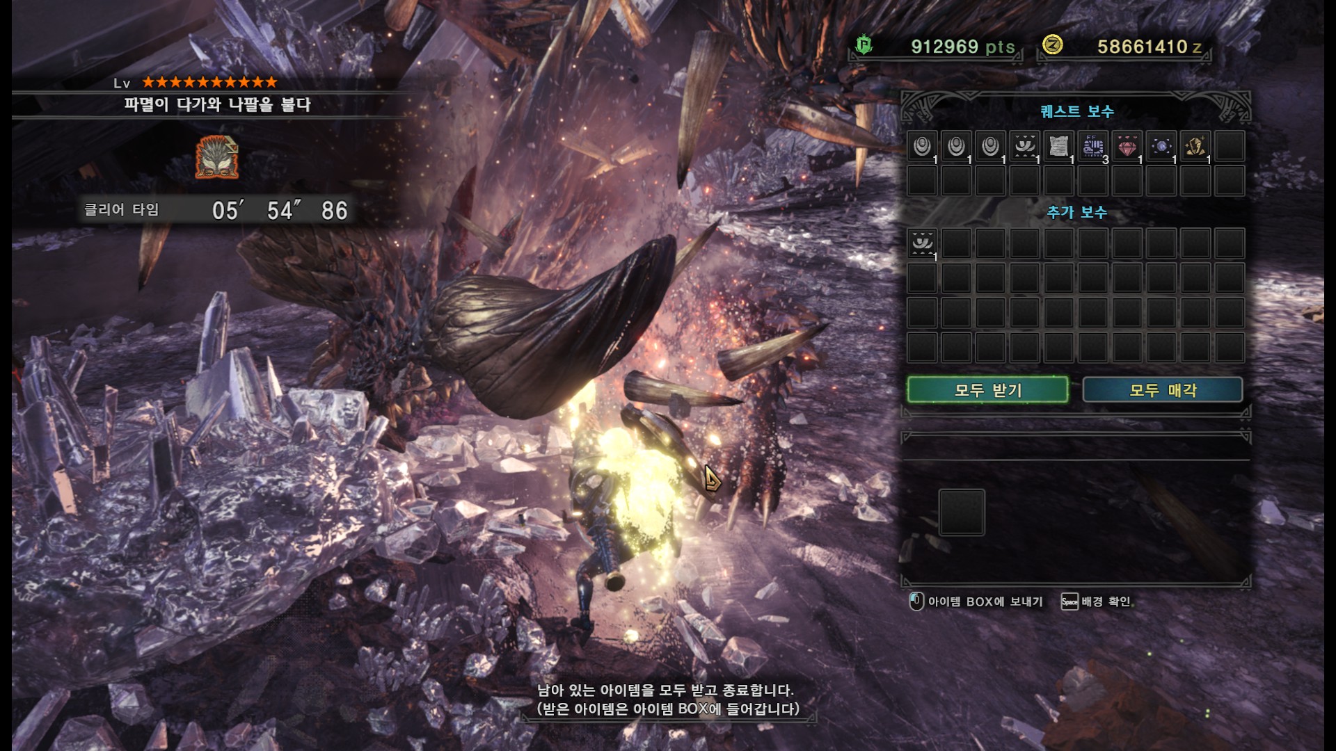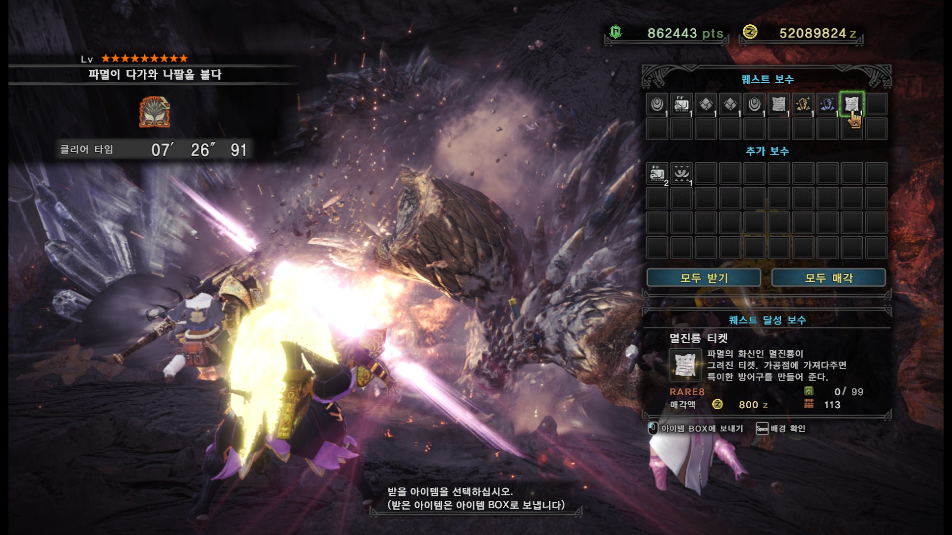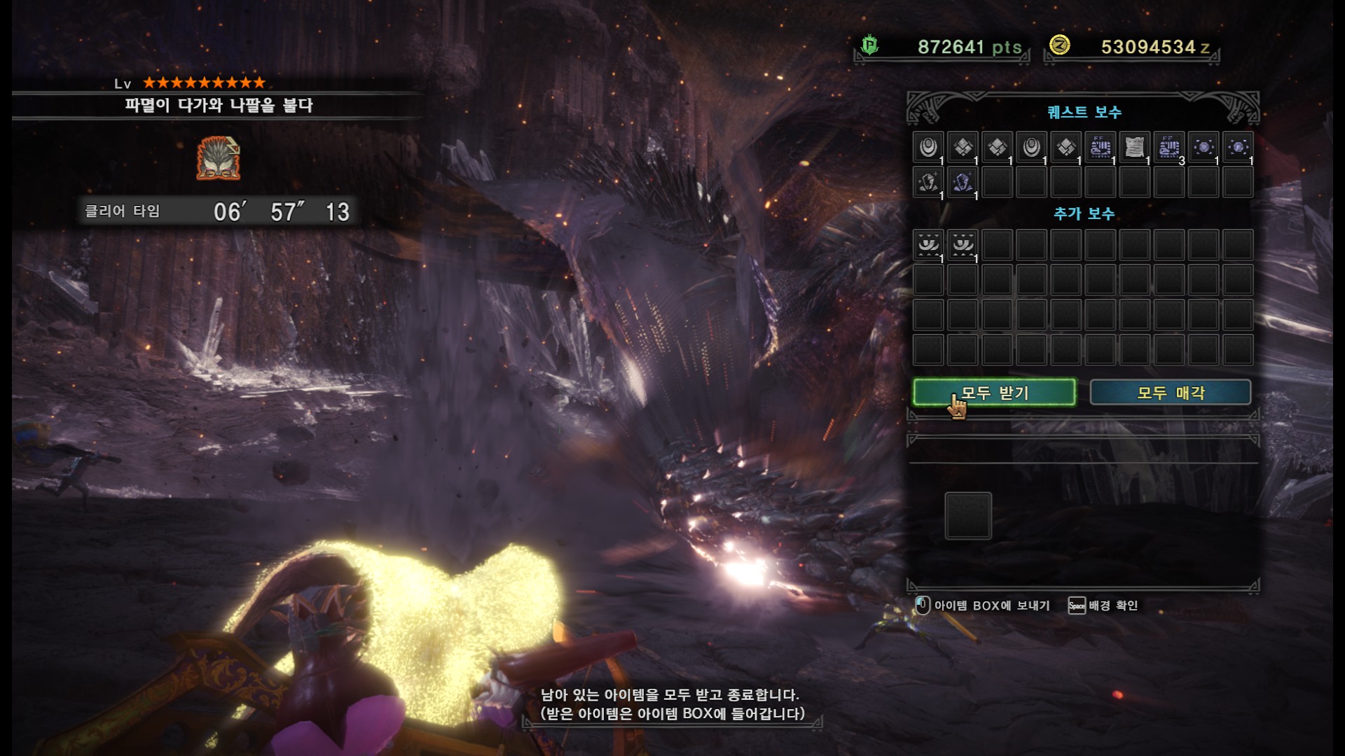 가시가 전부 경화된다면 길게 포효 후 파극멸진선-천을 씁니다. 그런데 머리, 양발, 꼬리, 날개의 가시가 전부 경화되지 않더라도 쓸 때도 있기 때문에 2페이즈 이후로는 긴장하시는게 좋습니다.