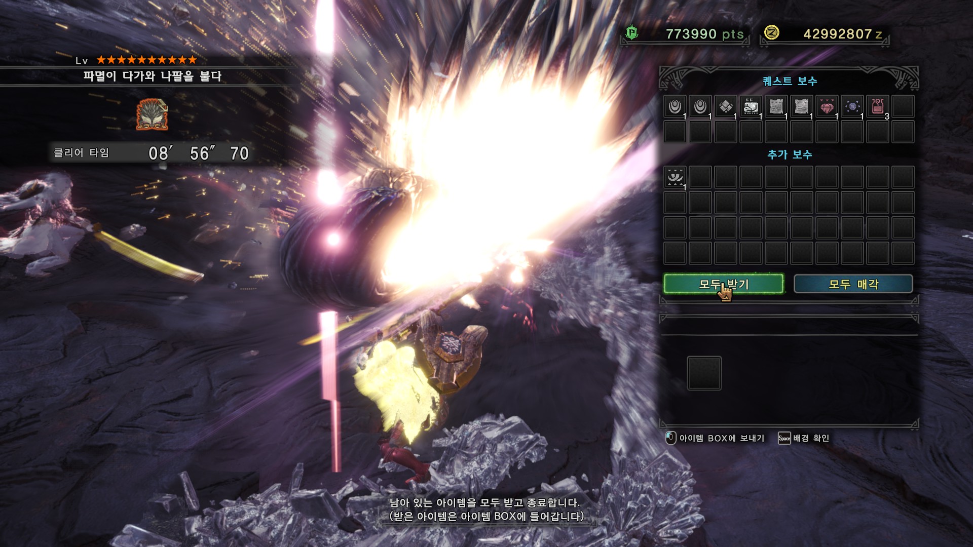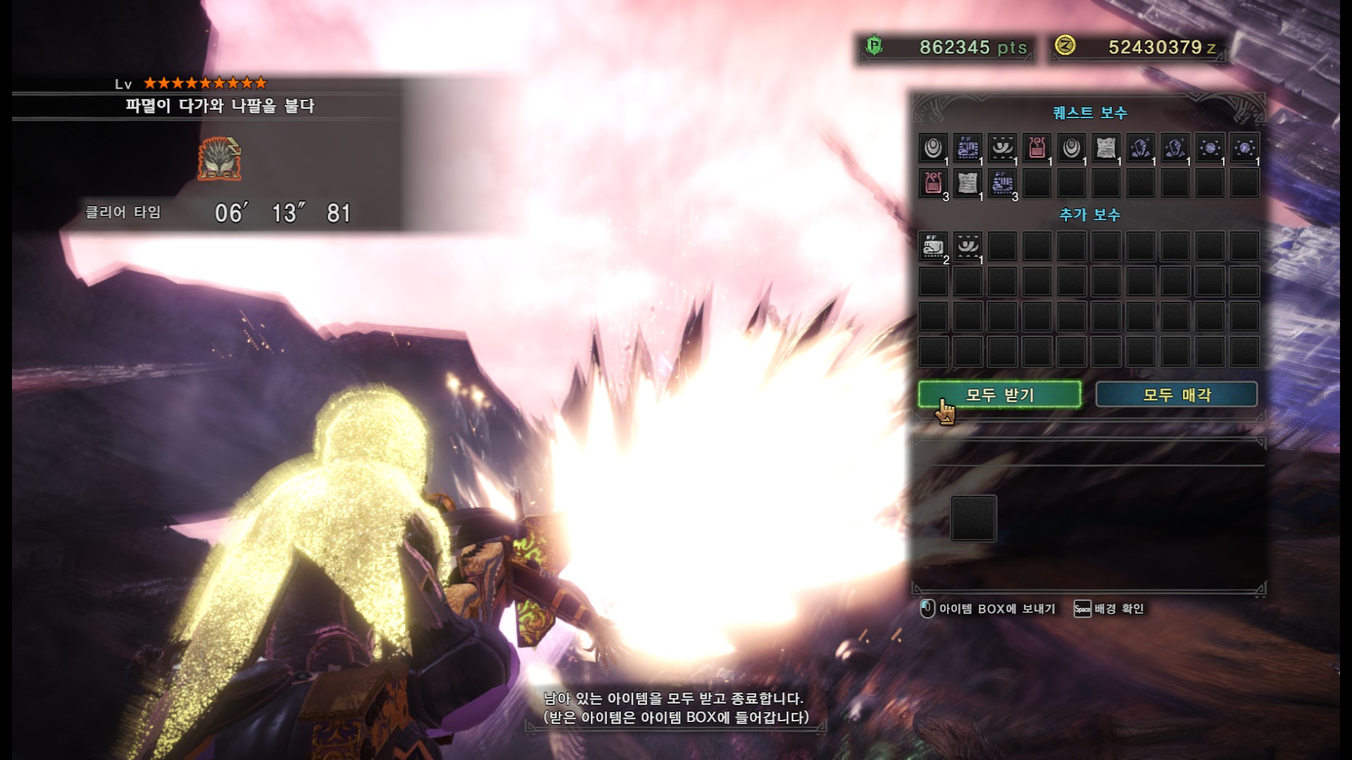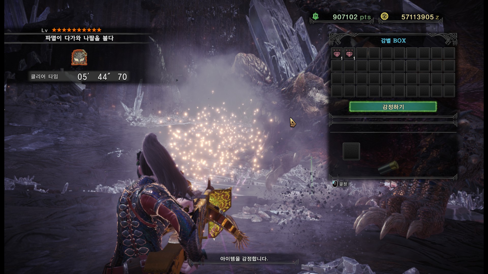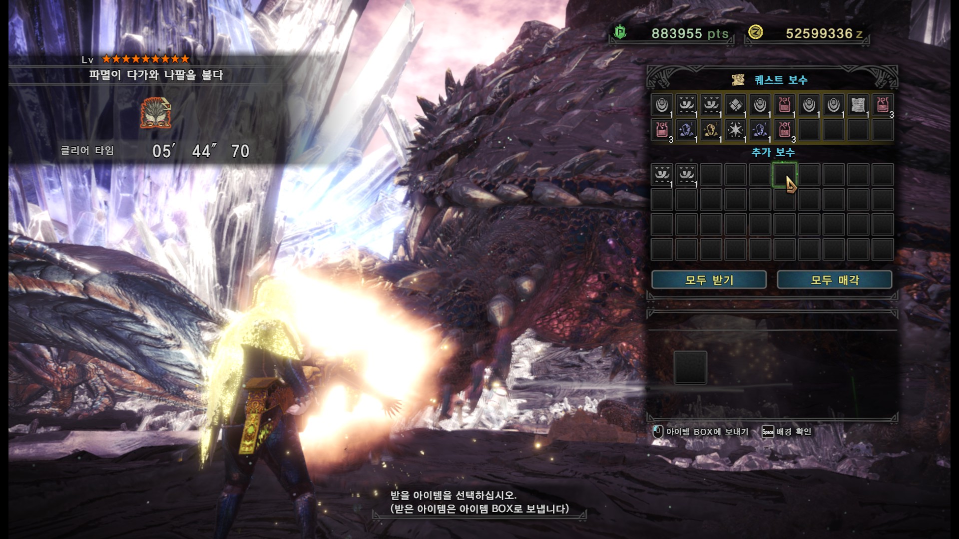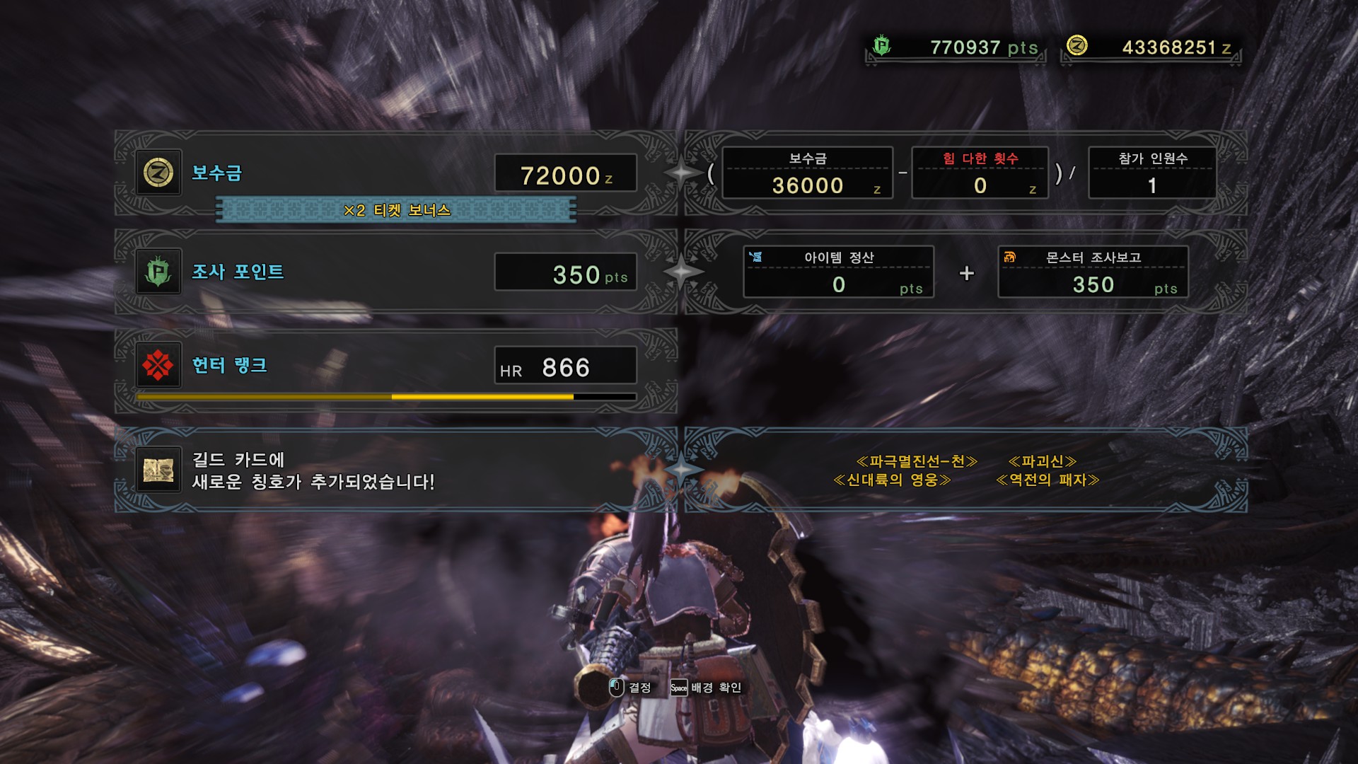 가시가 전부 경화된다면 길게 포효 후 파극멸진선-천을 씁니다. 그런데 머리, 양발, 꼬리, 날개의 가시가 전부 경화되지 않더라도 쓸 때도 있기 때문에 2페이즈 이후로는 긴장하시는게 좋습니다.