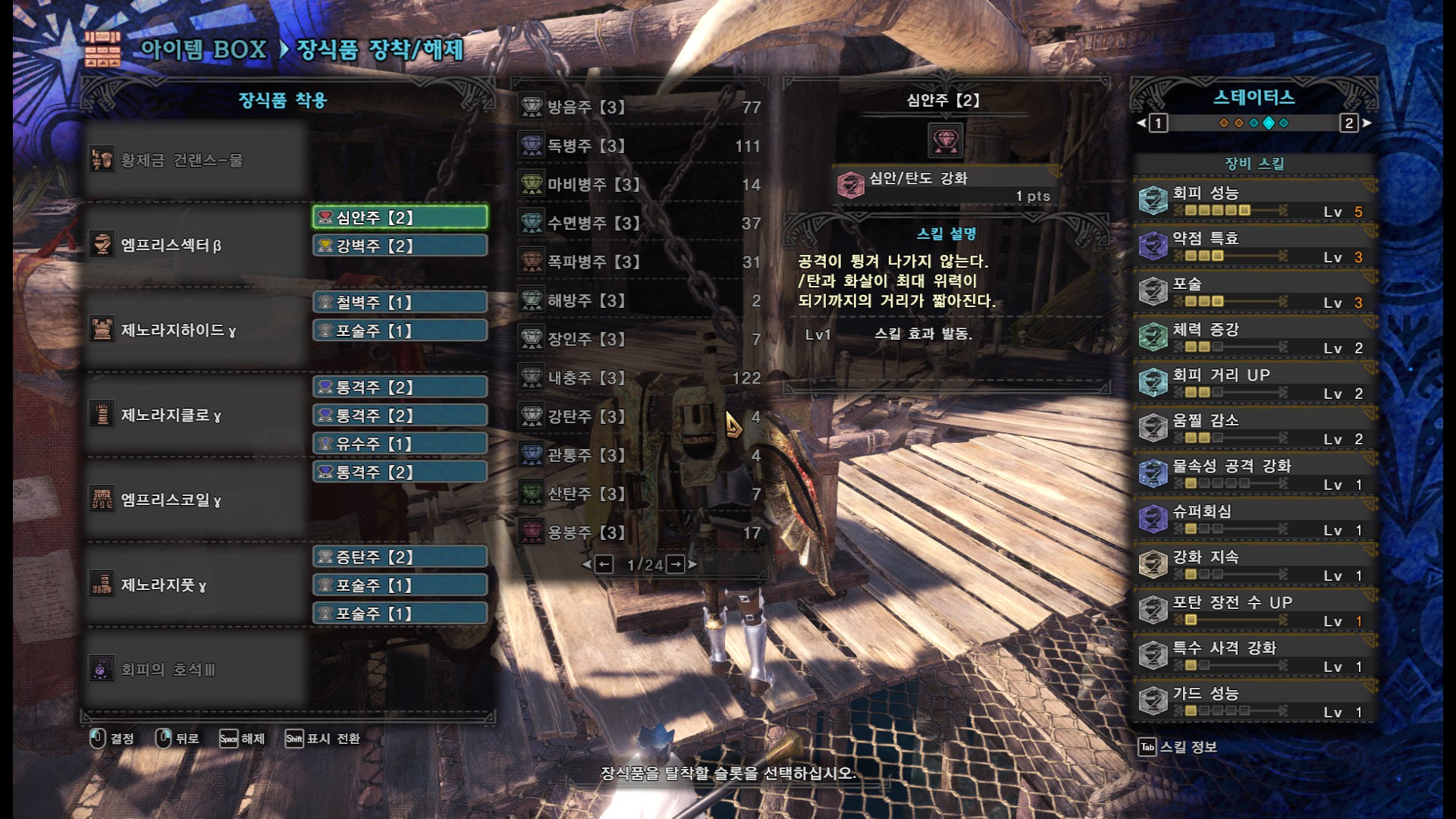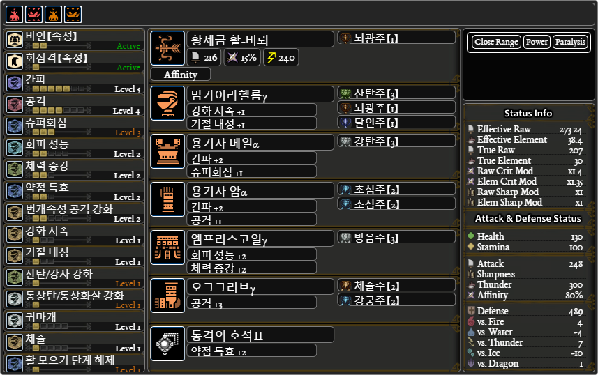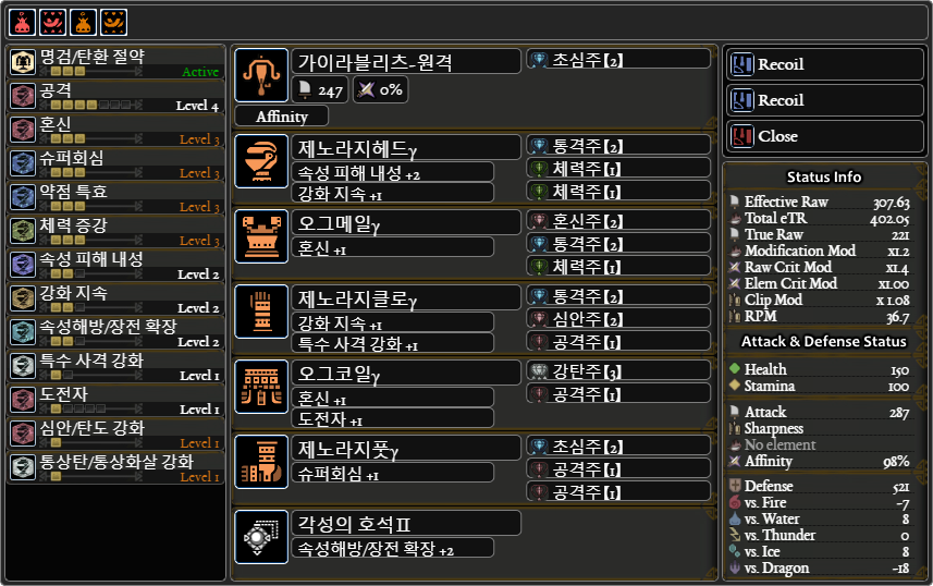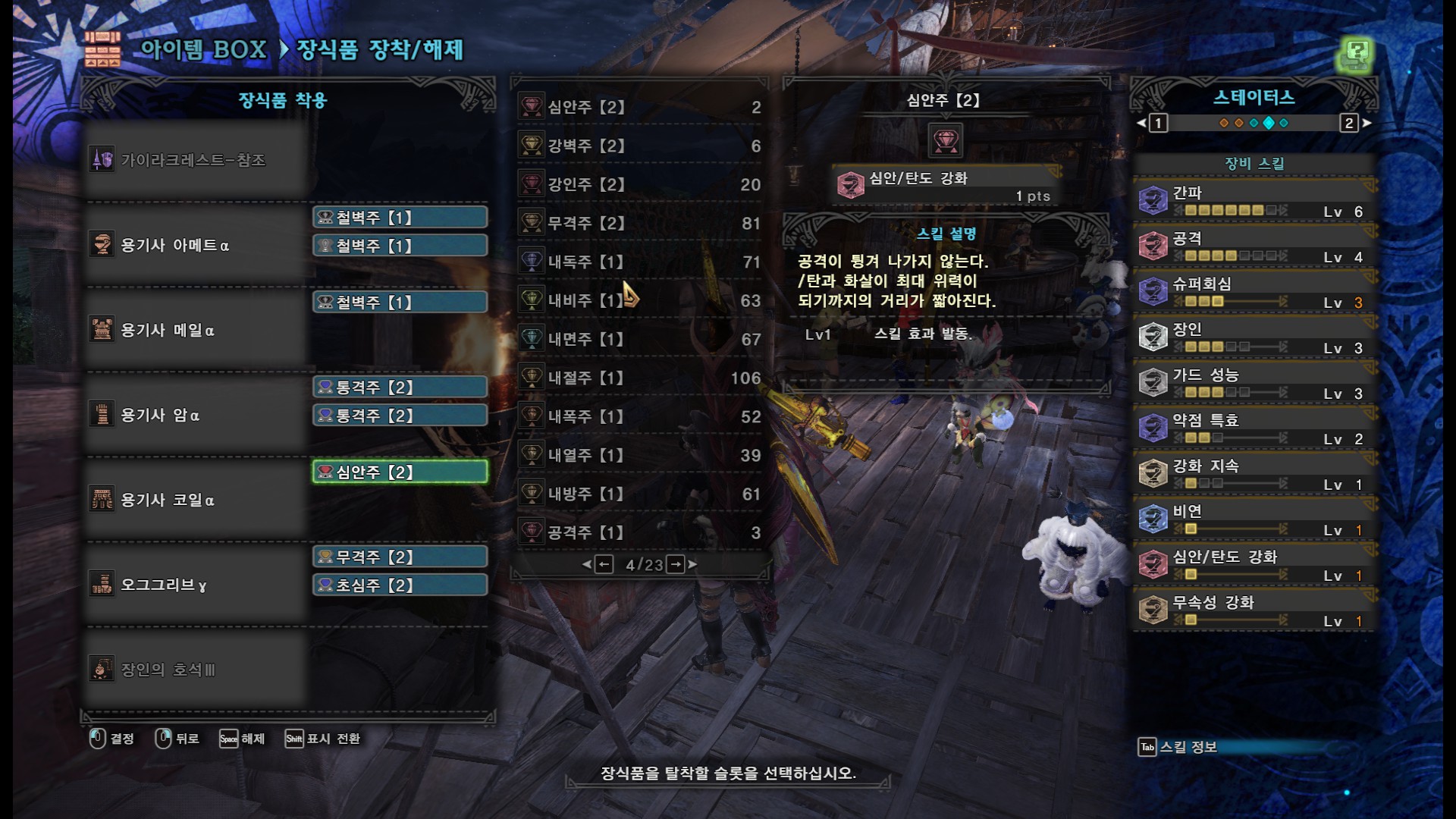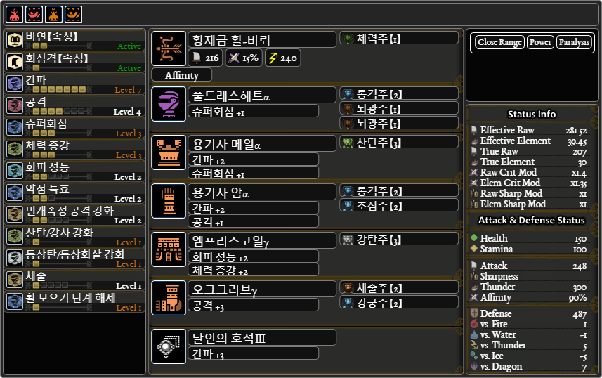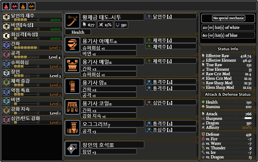 용용용크용+달인의 호석(방어력461), 풀용용용용+장인의 호석(방어력 459)으로 동일 스킬을 맞출 수 있습니다.