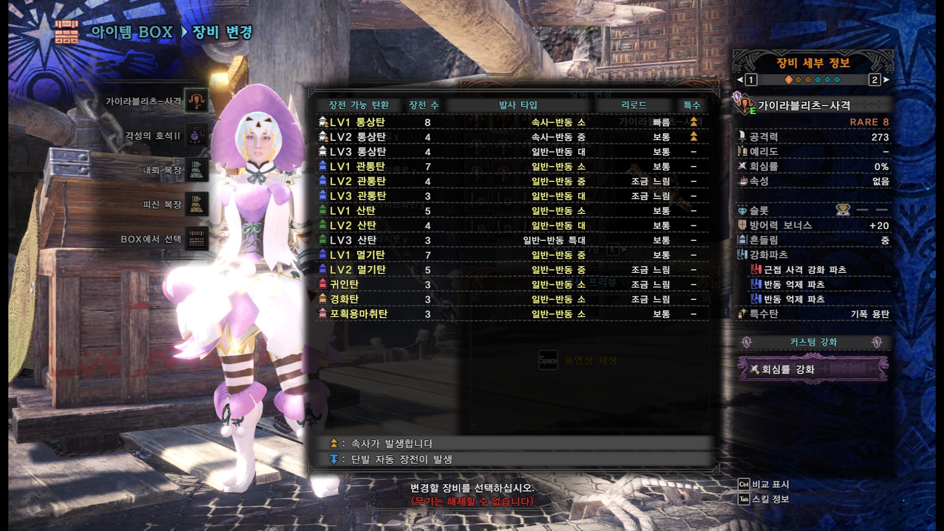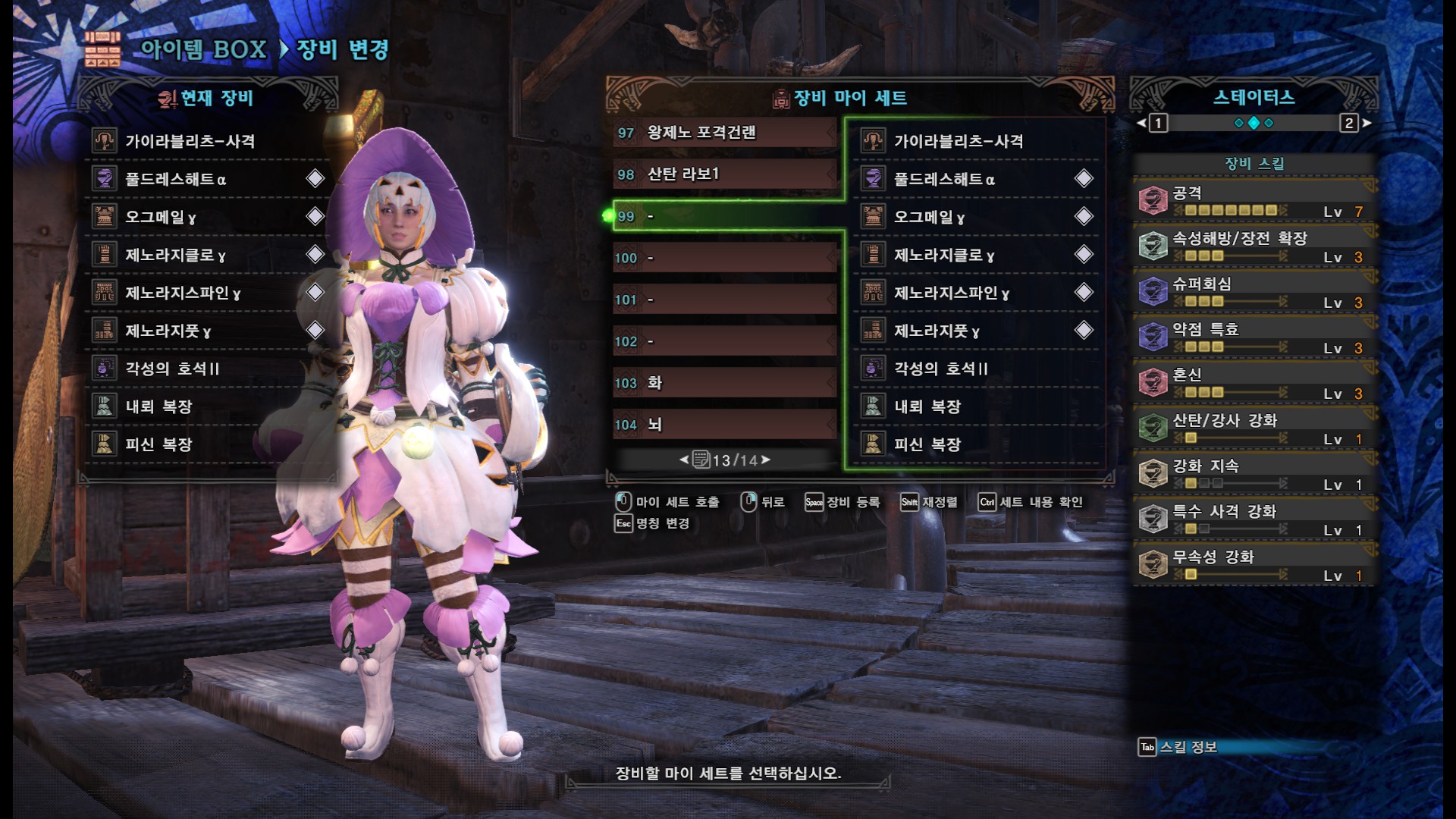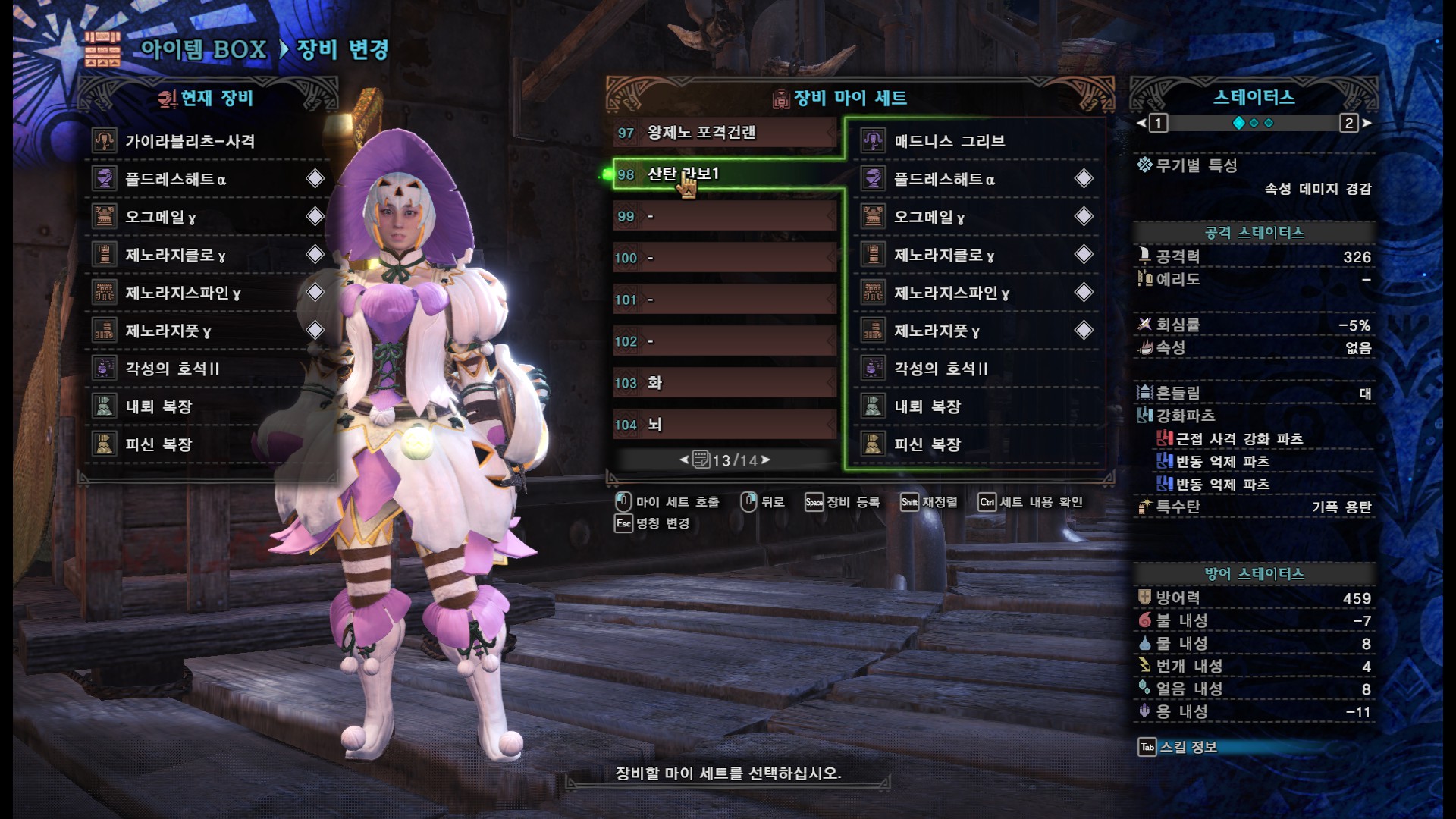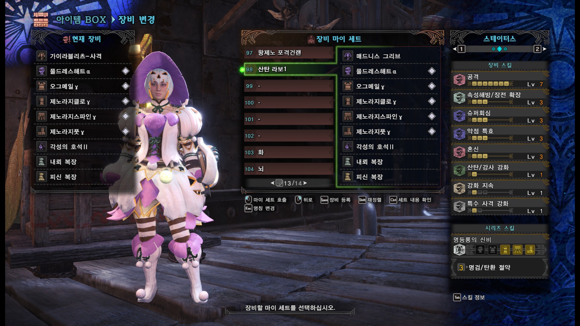 간파 7, 장전확장3(+명등룡의 신비 3셋 효과), 슈퍼회심3, 약점특효3, 혼신3, 산탄 강화, 강화지속, 특수사격강화1 입니다.