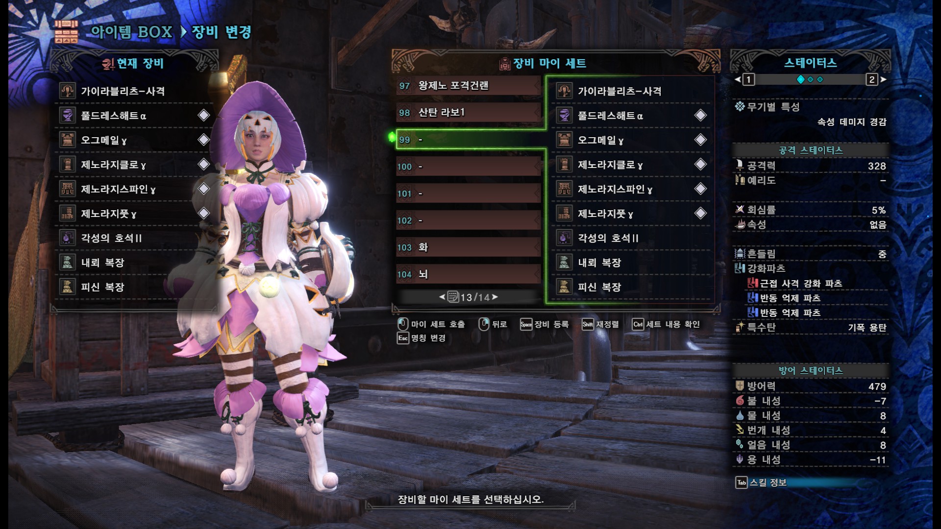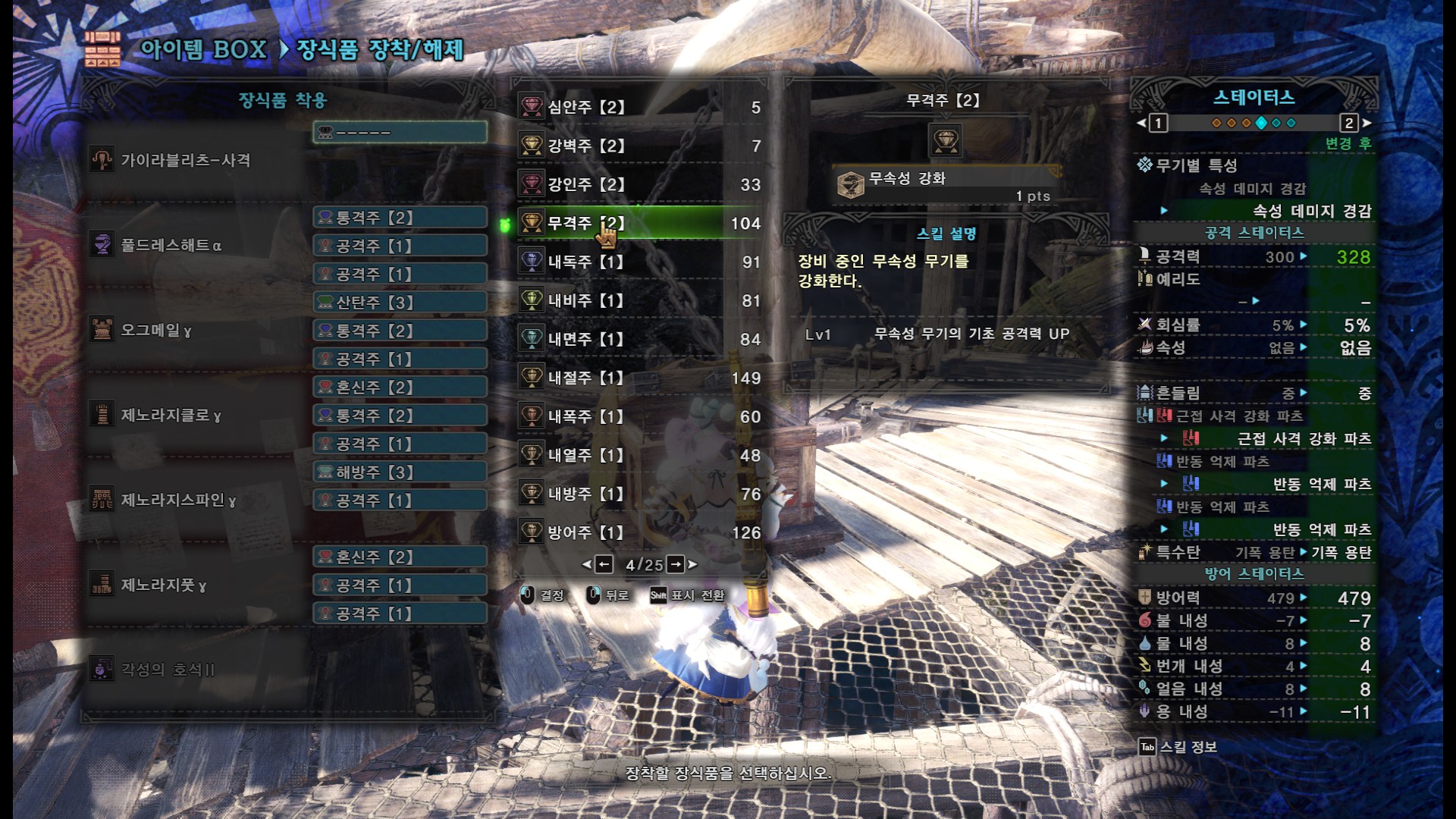 위 영상의 세팅은 무기부터 호석까지 순서대로...