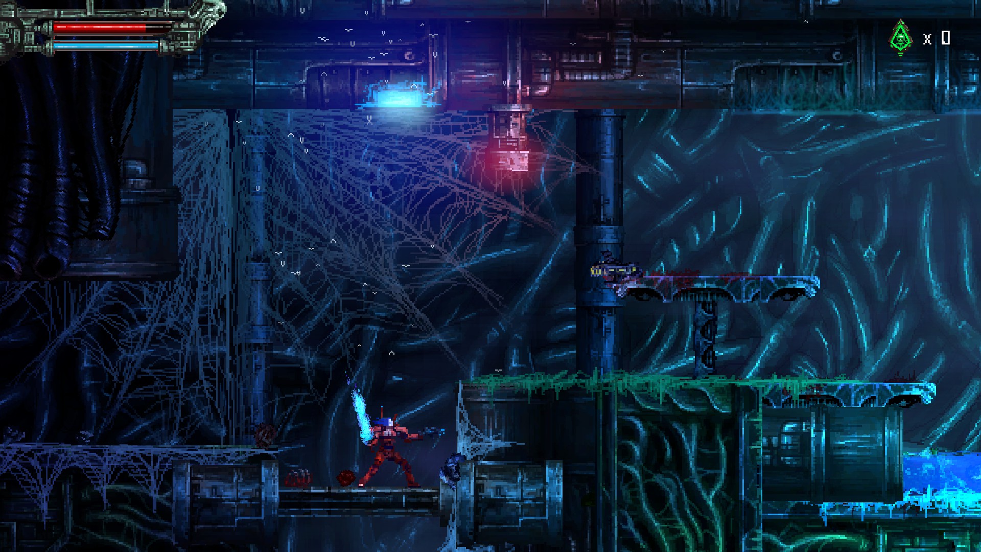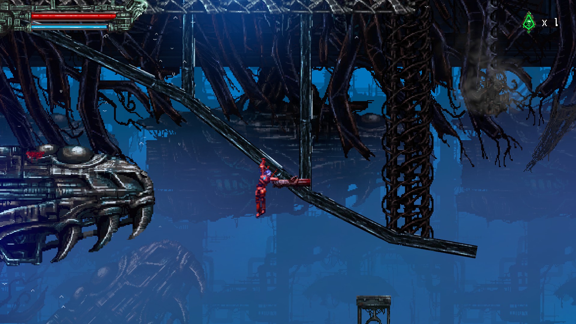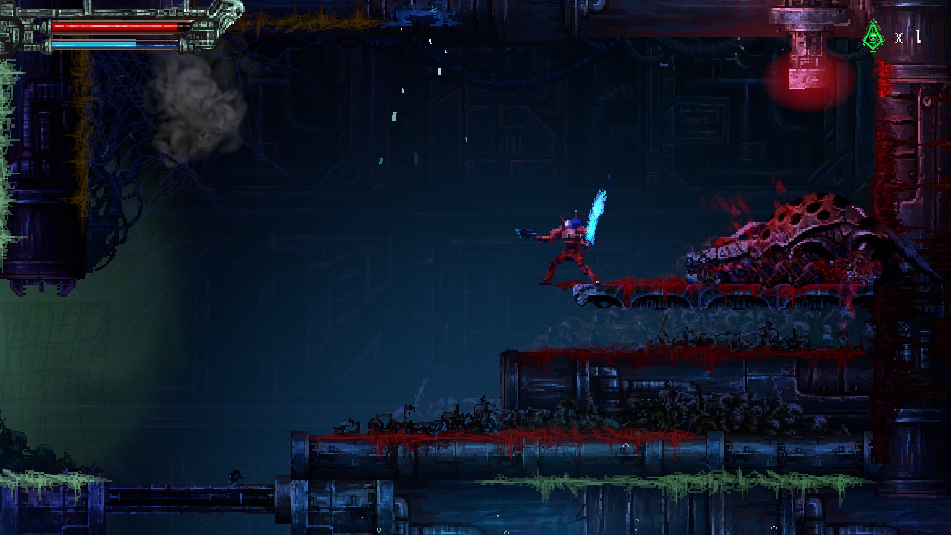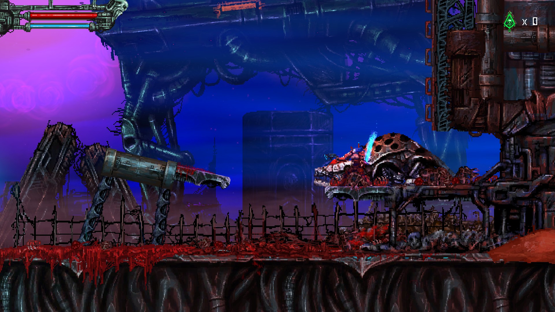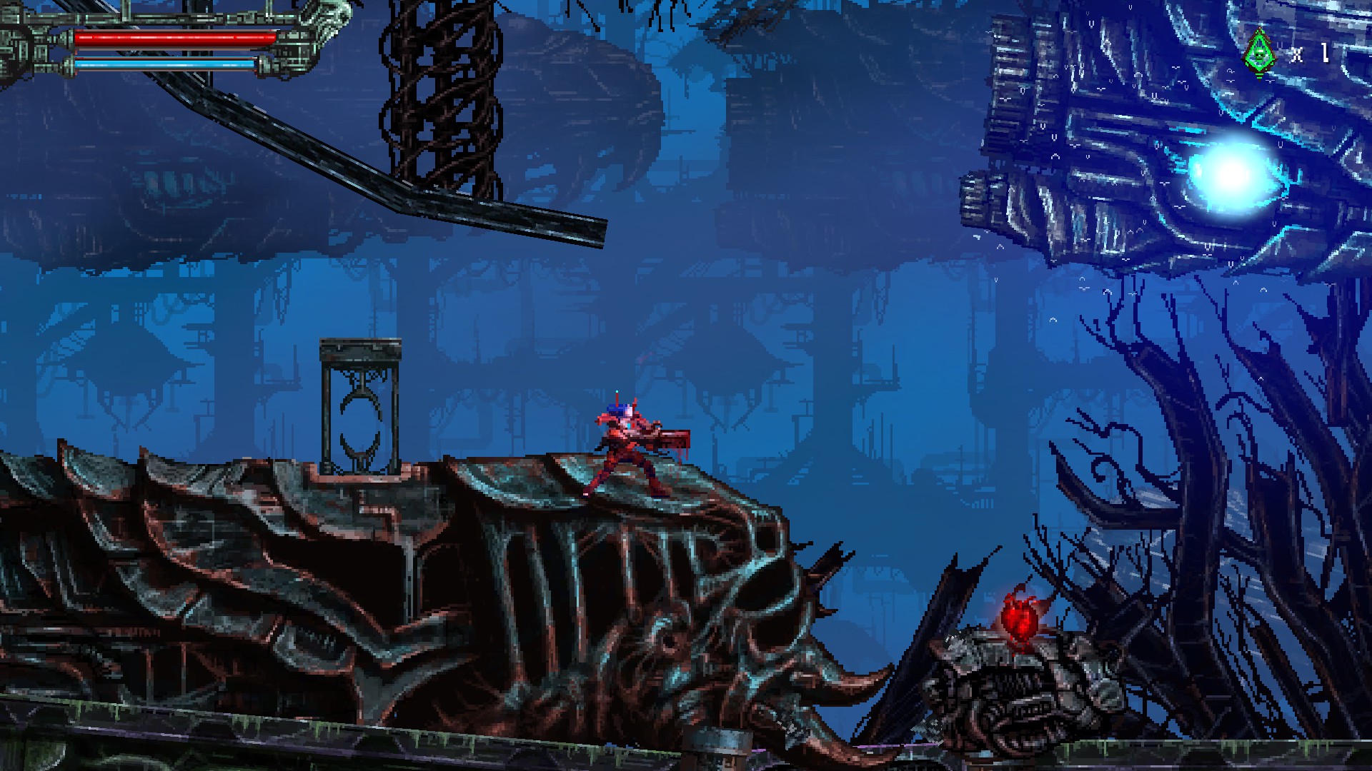 재활용된 고철멍멍이를 또 죽이고, 오른쪽 위에 보이는 빨간 구조물을 쏘면, 아랫쪽으로 가는 문이 열립니다.