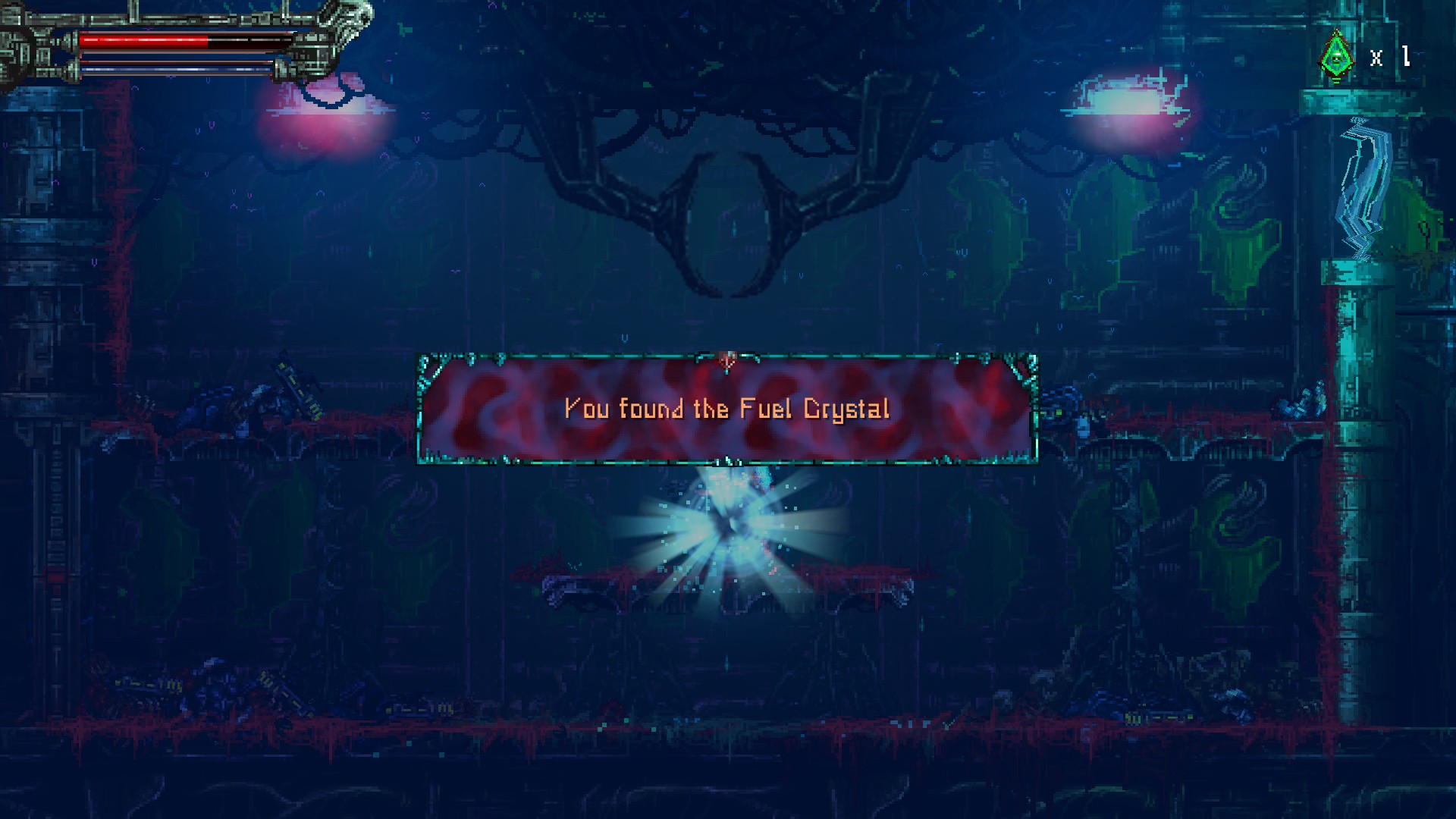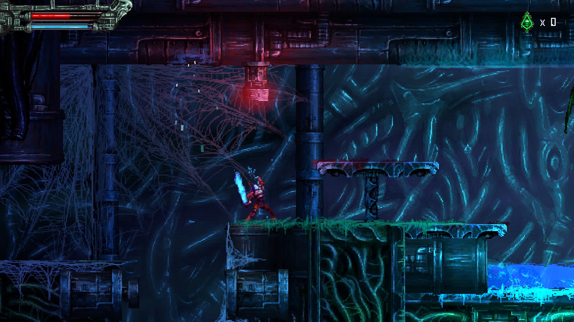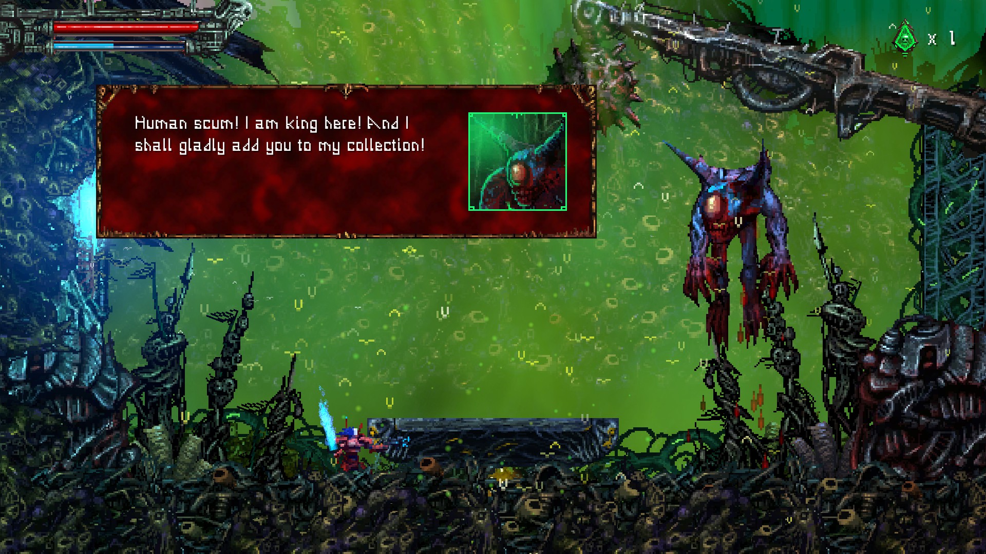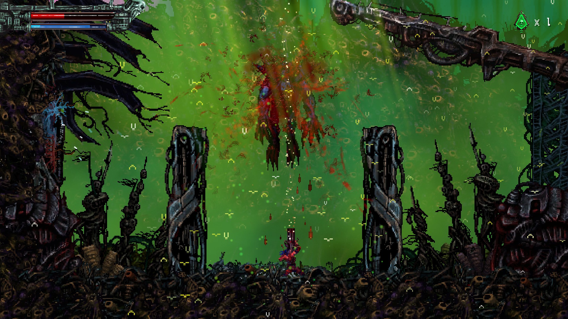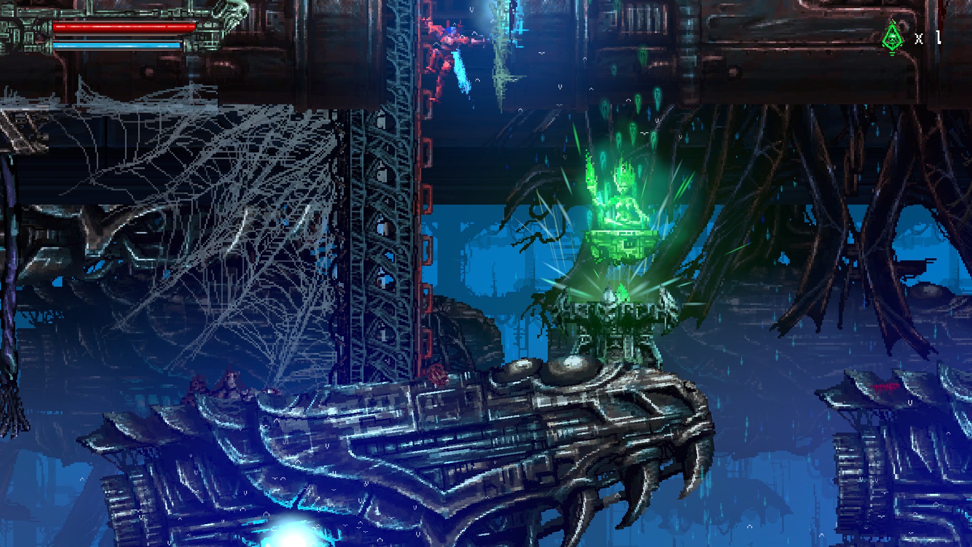 재활용된 고철멍멍이를 또 죽이고, 오른쪽 위에 보이는 빨간 구조물을 쏘면, 아랫쪽으로 가는 문이 열립니다.