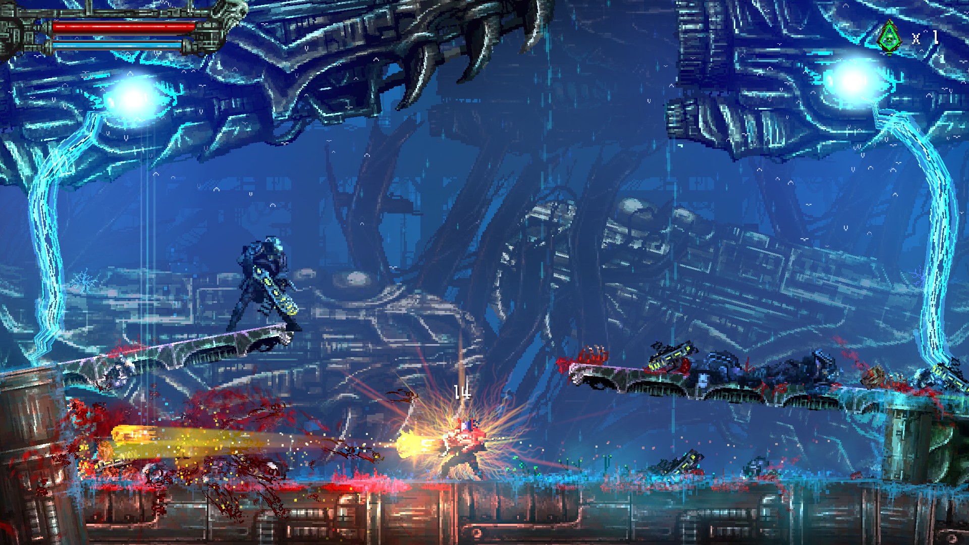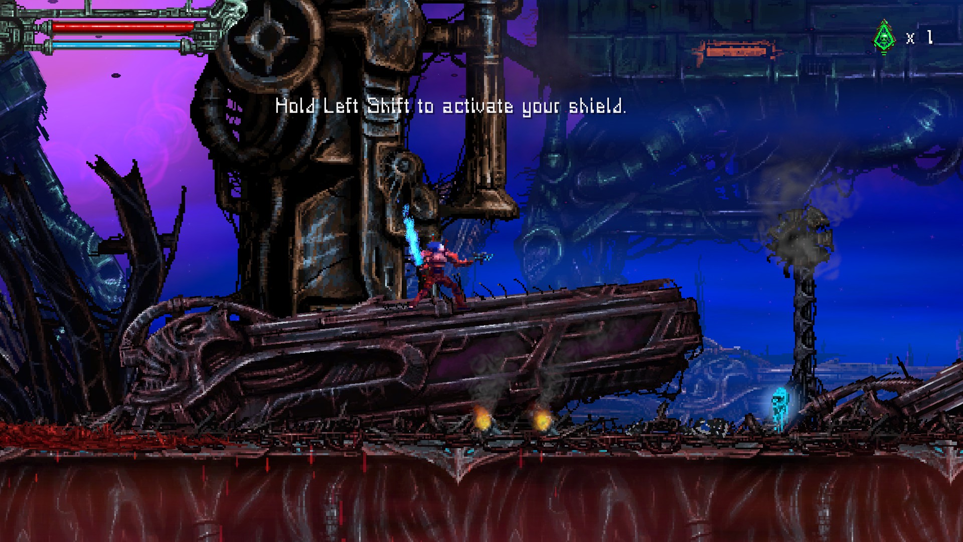 빨간색 바는 체력, 파란색 바는 쉴드나 특수무기 사용시 소모됩니다. 게임을 진행함에 따라서 조금씩 증가가 가능했습니다.