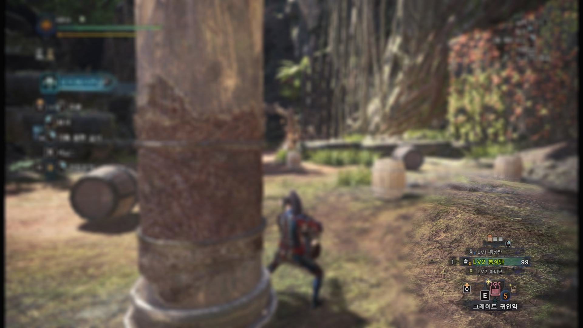 위의 캡쳐에서 봐야 할것은 두가지. 아이템 주머니 위쪽에 표시된 탄약 종류 3가지 중에 가운데에 위치한 것이 유저가 발사하는 탄환이고, 그 위에 있는 탄피는 기폭용탄의 가용 여부이다. 기폭용탄 사용이 가능하다면 탄두가 달려있는 주황색 탄환으로 표시가 되고, 사용을 했다면 위에서 보시다시피 탄두가 없는 회색탄피로 표시가 된다. 기폭용탄은 사용후 40초쯤 지나면 자동으로 장전이 되기 때문에 몹이 대경직에 걸려 있거나, 소경직이나 부위파괴를 노리고 경로에 깔아놓는 플레이를 하는 것이 좋다.