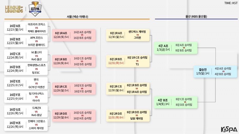 2019 LoL KeSPA Cup ULSAN 첫 날 경기는 아프리카 프릭스와 락헤드의 대결로 시작하여, APK 프린스와 브리온 블레이드 경기가 각 오후5시와 8시에 진행된다. 8강 2라운드 시드를 획득한 T1, 그리핀, 담원 게이밍, 샌드박스 게이밍은 30일(월)부터 경기를 시작한다. 30일(월) 1경기에는 샌드박스 게이밍과 그리핀의 경기가 진행되며, 이날 2경기에는 8강 1라운드 A, B조 승자 팀이 맞붙게 된다.