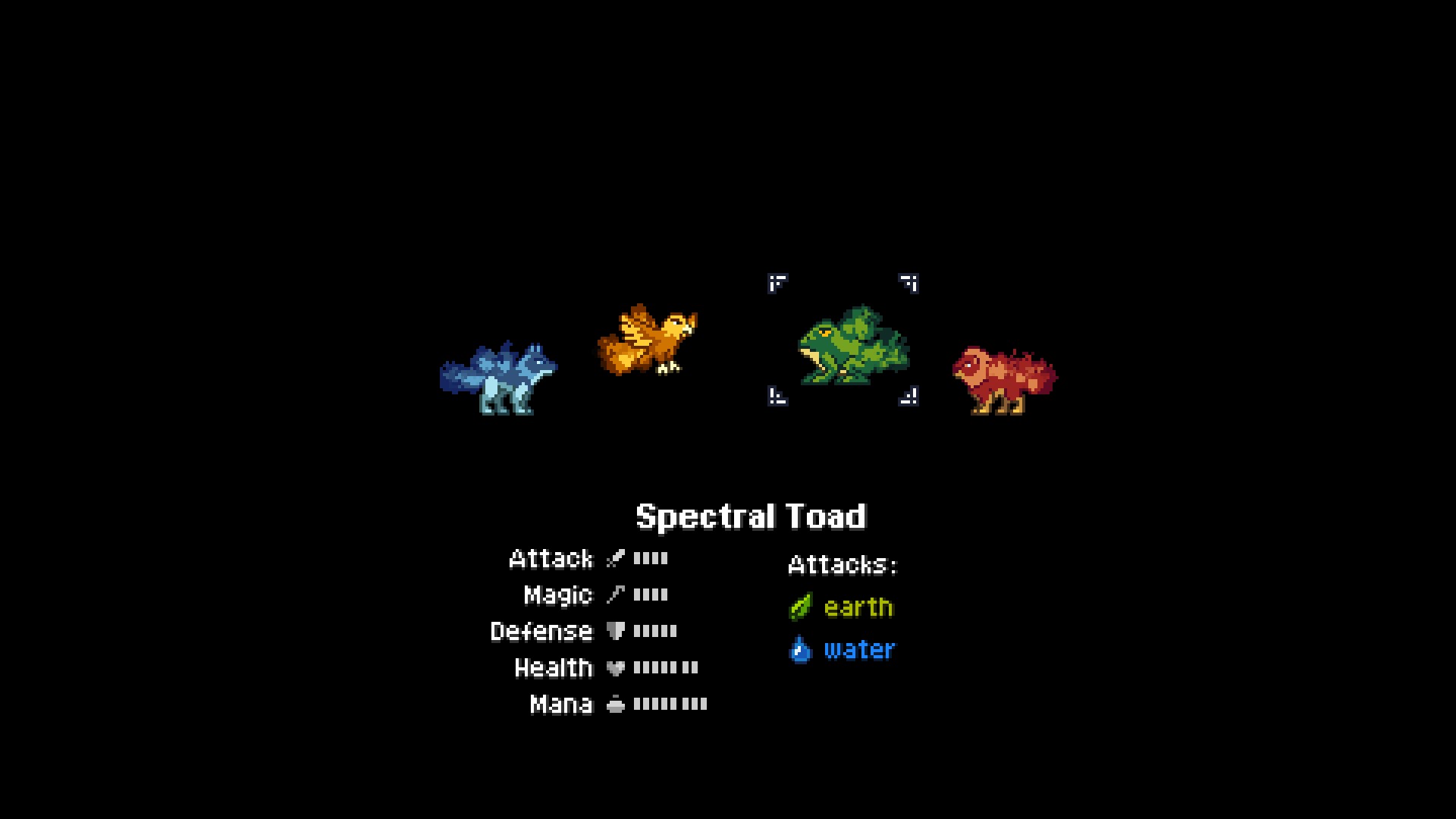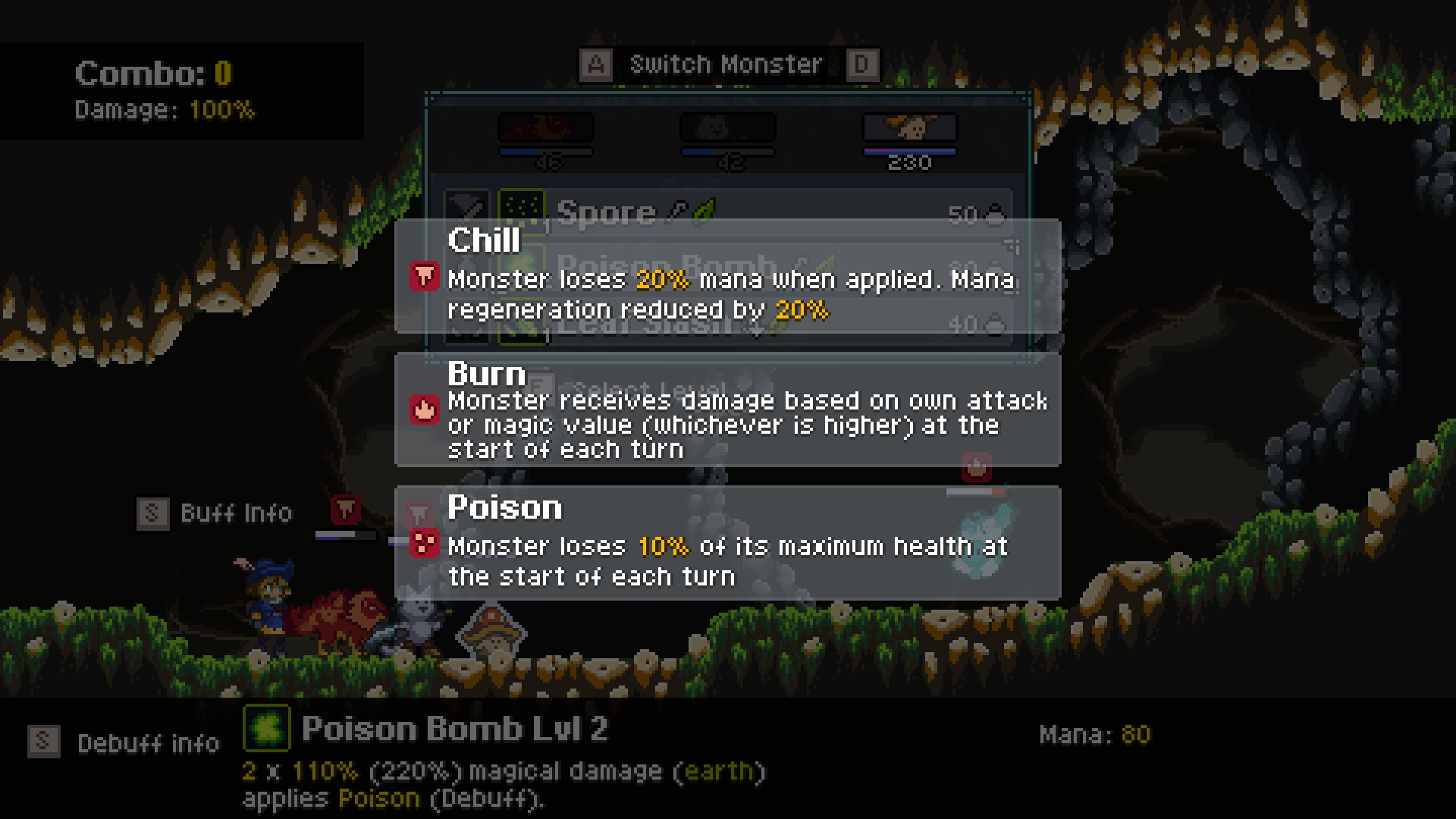 몬스터의 명령에는 공격유형(물리, 마법), 속성(불, 전기, 얼음 등), 마나소모량이 표기됩니다.