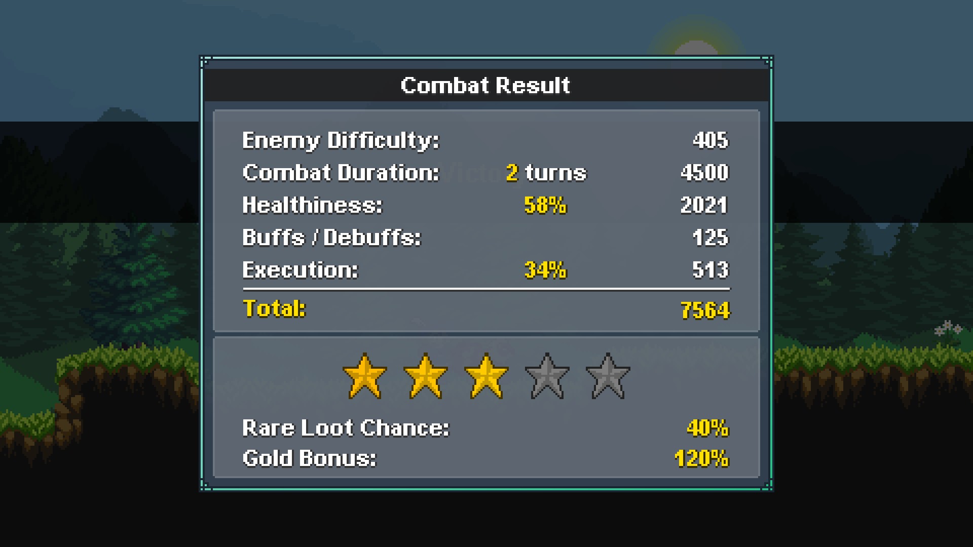 전투를 이기게 되면 바로 결과창이 뜹니다. 잘하면 잘할수록 별이 많이 뜨게 되며, 별이 많을수록 좋은 아이템을 얻을 확률과 골드 보너스가 높아집니다.