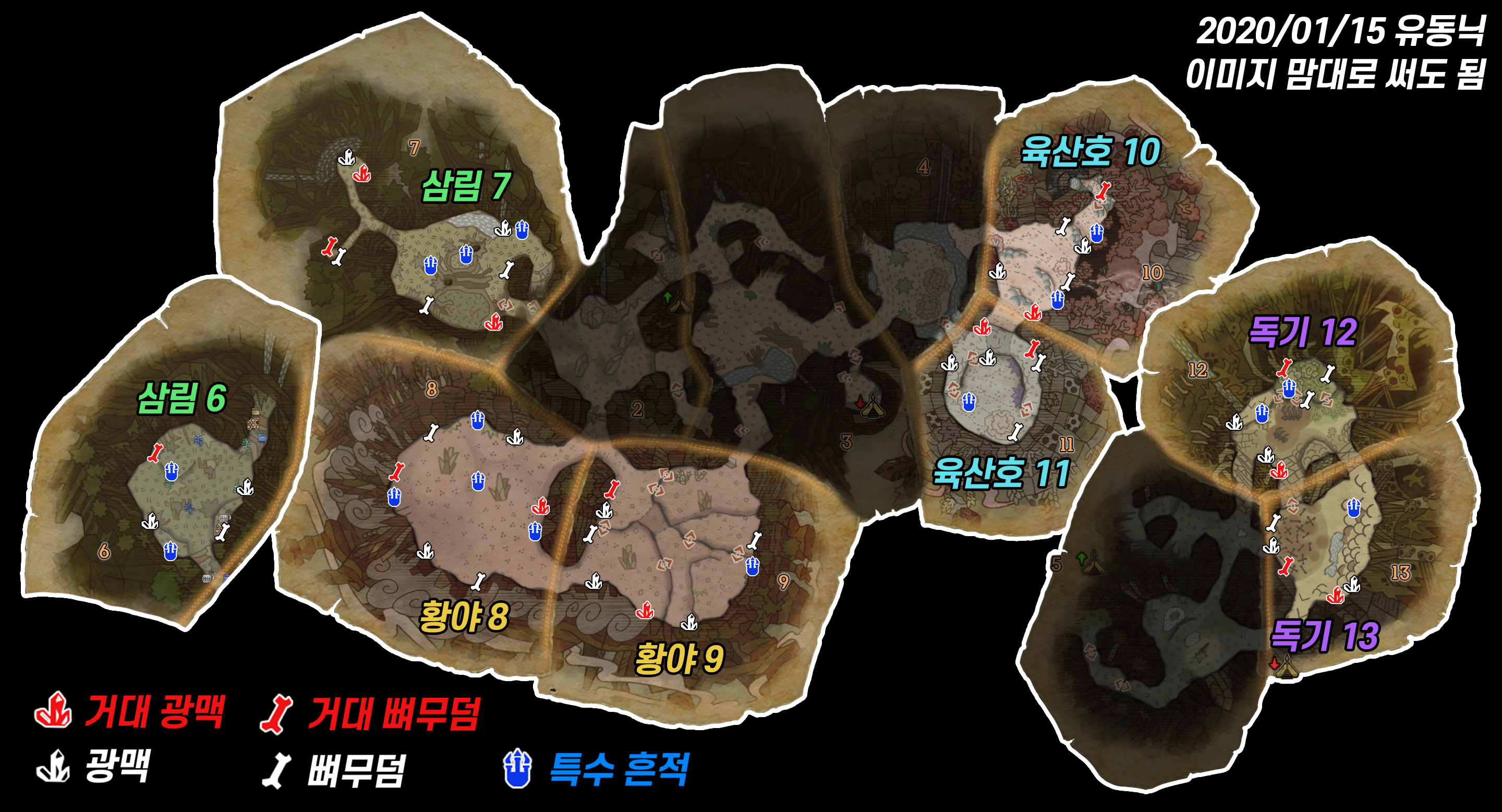 거대광맥, 거대뼈무덤 등은 채광,채집을 하다보면 "XX 지대에 거대광맥/거대뼈무덤 생성" 메시지가 뜬 후에 리젠됩니다.