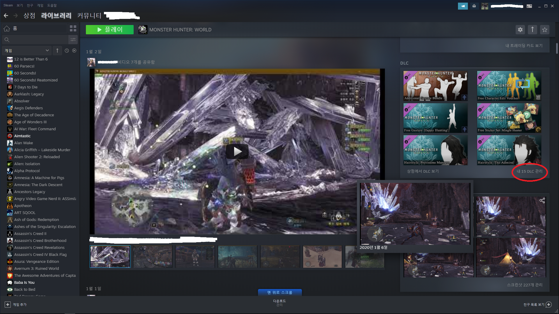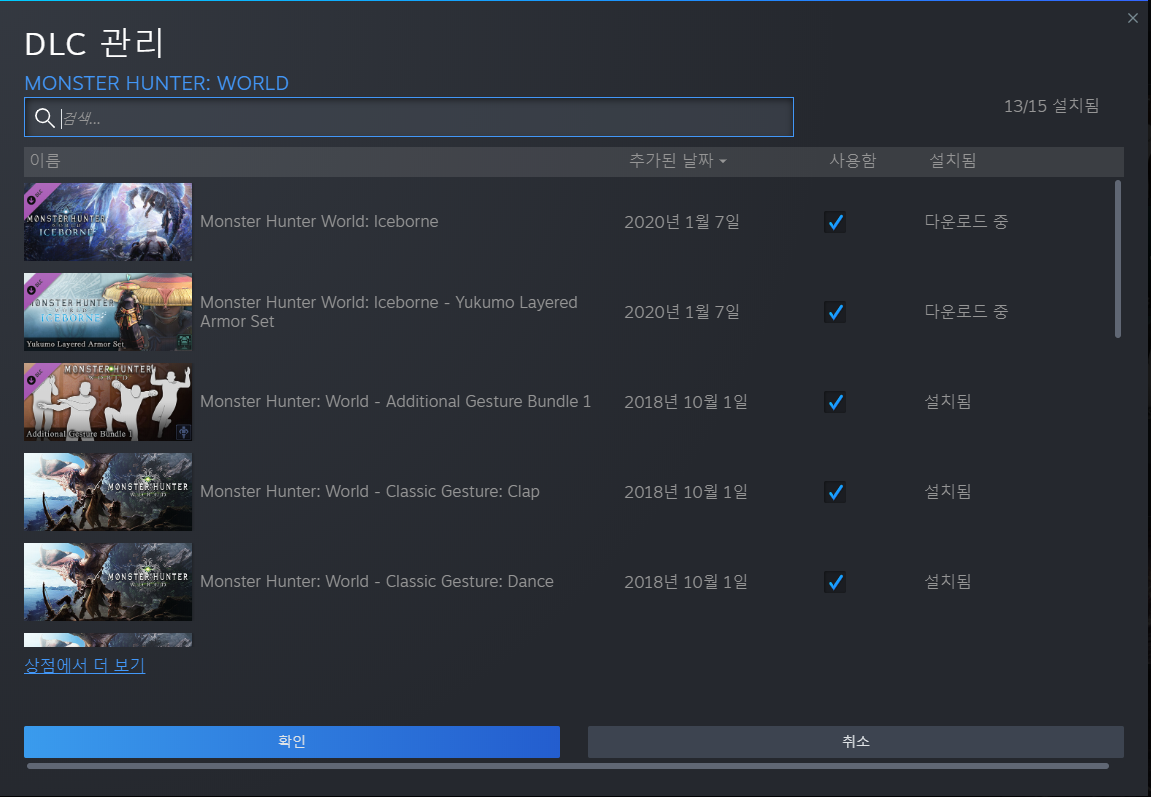 코드 등록 후 라이브러리에서 몬스터 헌터 월드 클릭, 스크롤을 약간 내리면 dlc목록이 뜹니다.