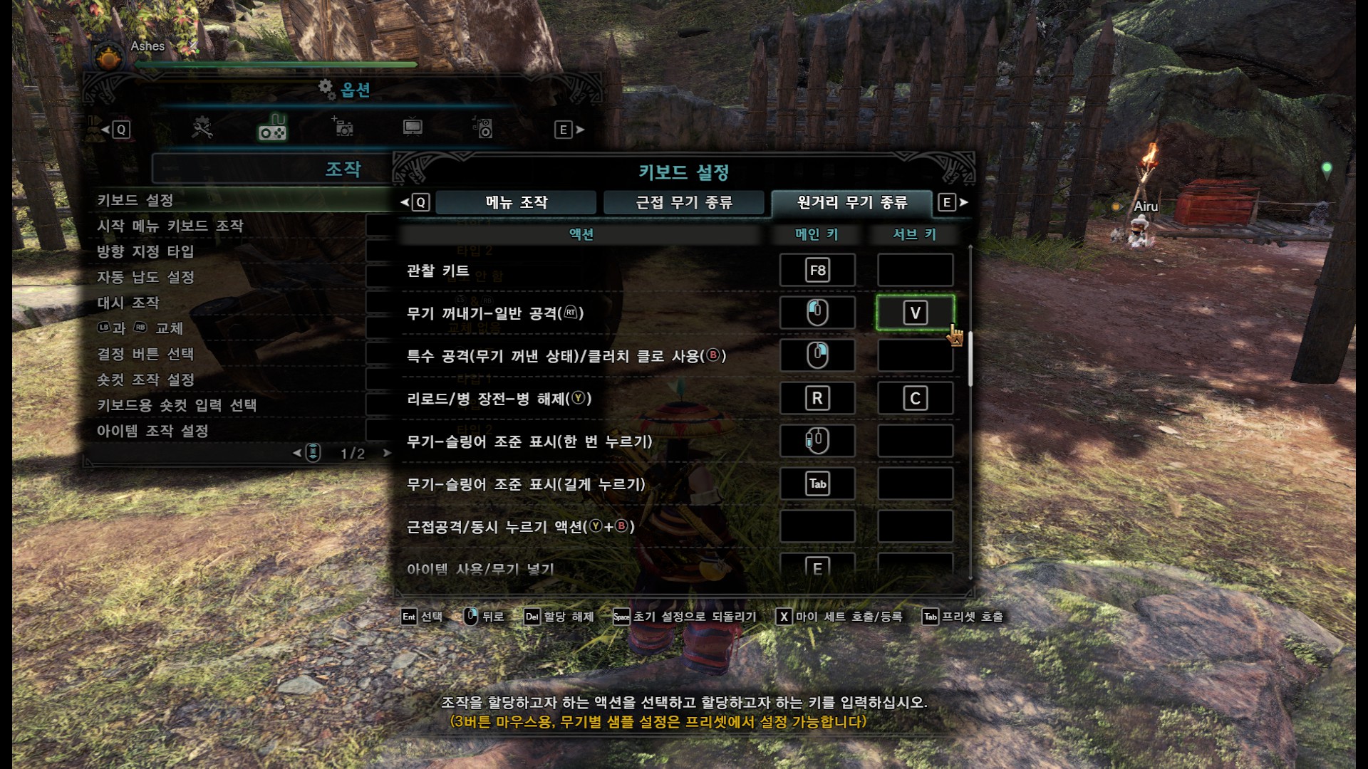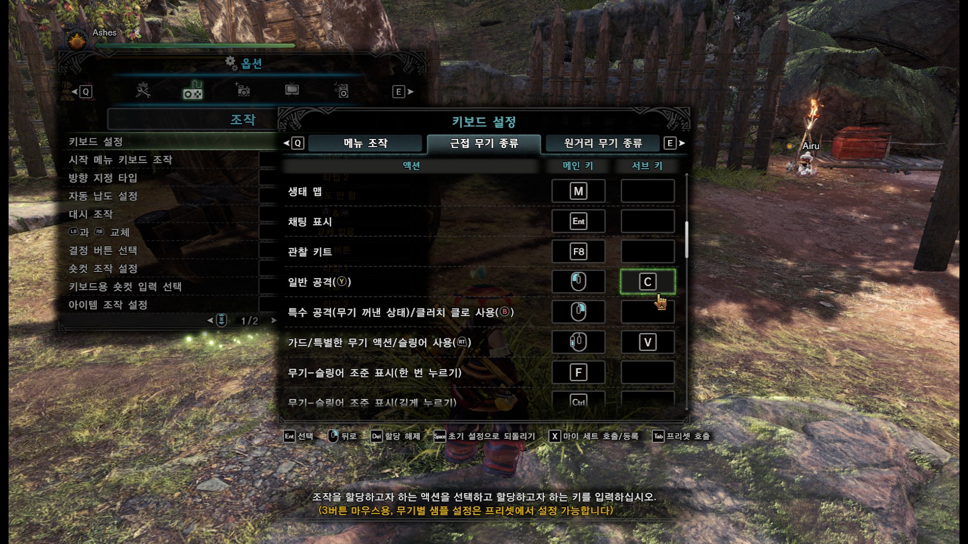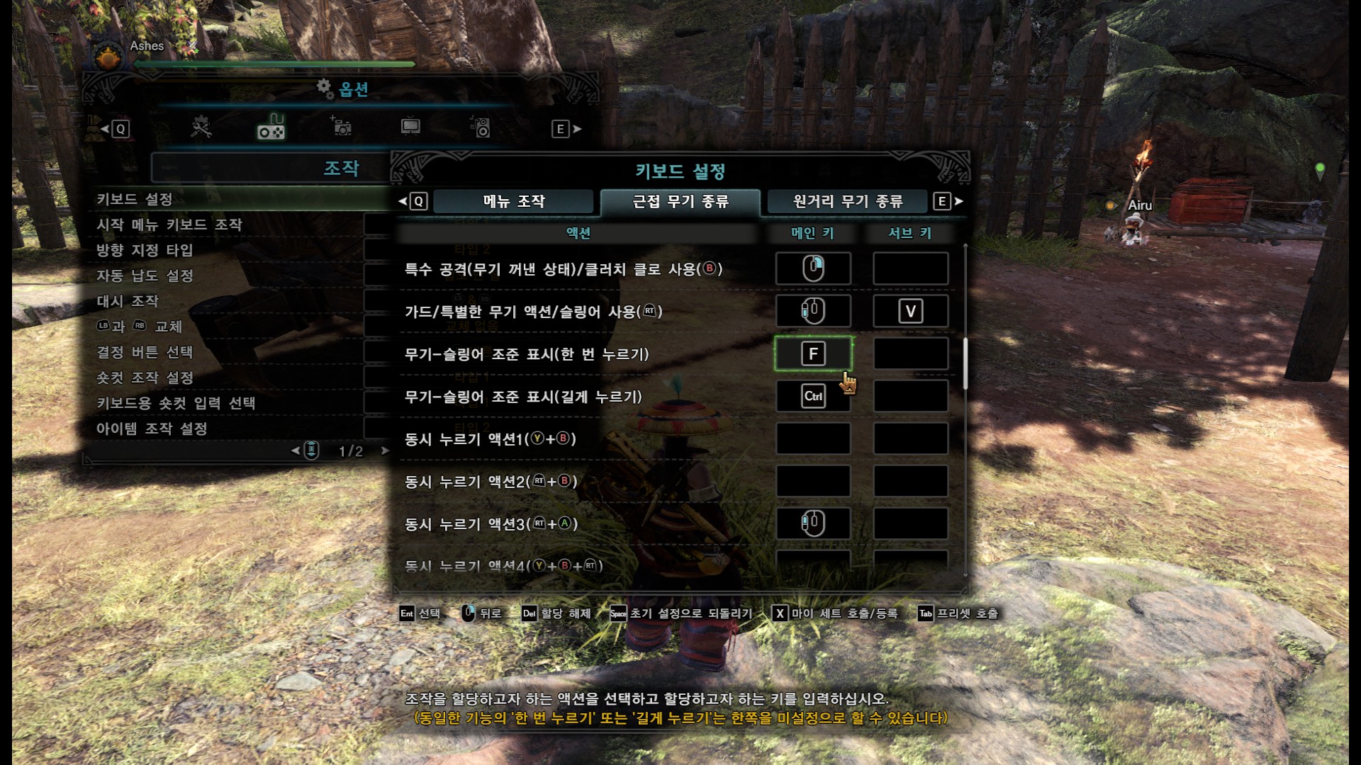 그런데 기본 설정은 원거리 무기의 경우 R이 기본공격, 전탄발사가 좌클릭이라서 무기를 섞어쓰다보면 탈 때마다 헷갈립니다. 따라서 위 스샷처럼 서브키를 배정해주세요. 그러면 원거리/근거리 모두 클러치 상태에서 C로 일반공격, V로 전탄발사를 할 수 있습니다. 핵심은 근거리 무기의 일반공격 서브키=원거리 무기의 리로드/병 장전-병 해제 동일한 서브키 배정, 근거리 무기의 가드/특별한 무기 액션/슬링어 사용= 원거리 무기의 무기 꺼내기-일반공격 동일한 서브키 배정입니다. C와 V가 불편하다면 참고해서 키 설정을 해주세요. 클러치 상태에서 원근거리 둘다 좌클로 기본공격 마우스 사이드 버튼으로 전탄발사는 안되는 것 같습니다.