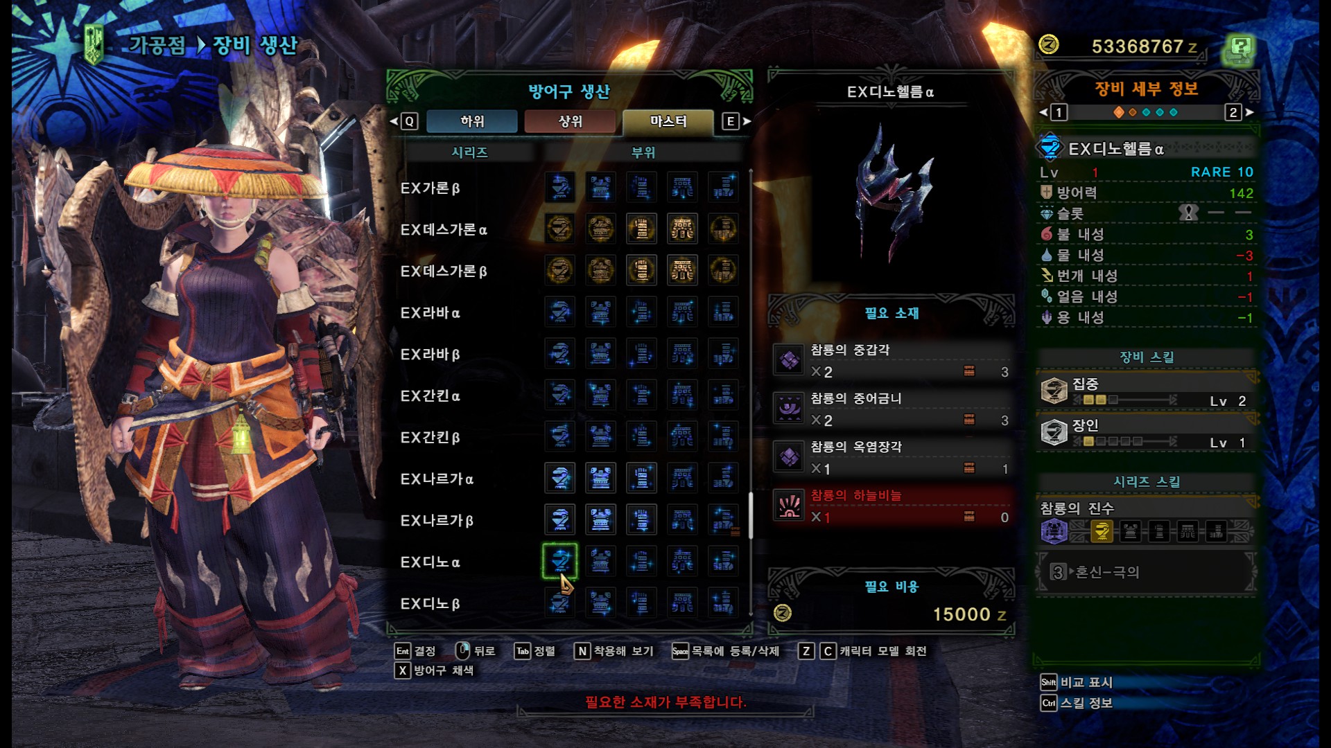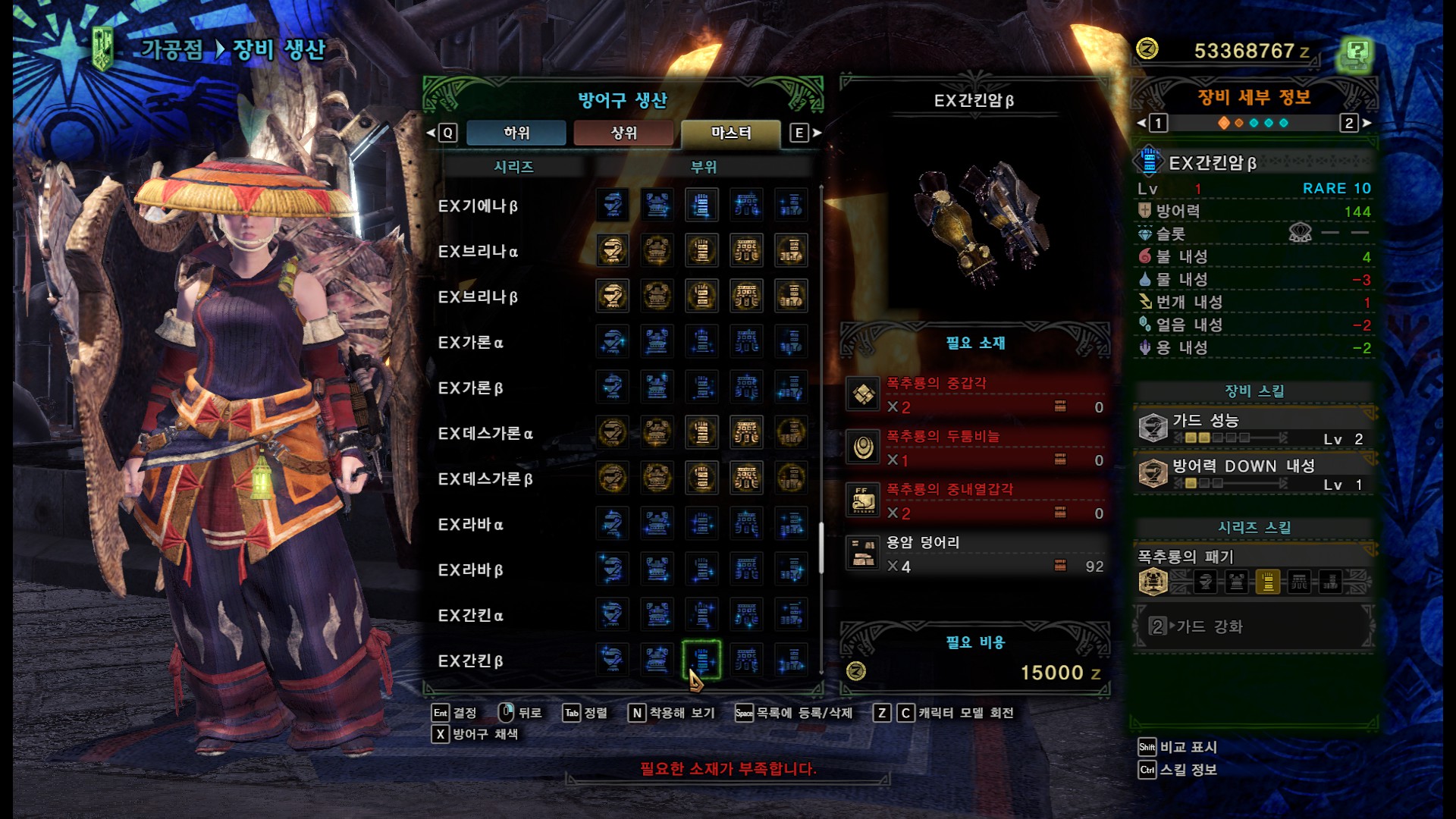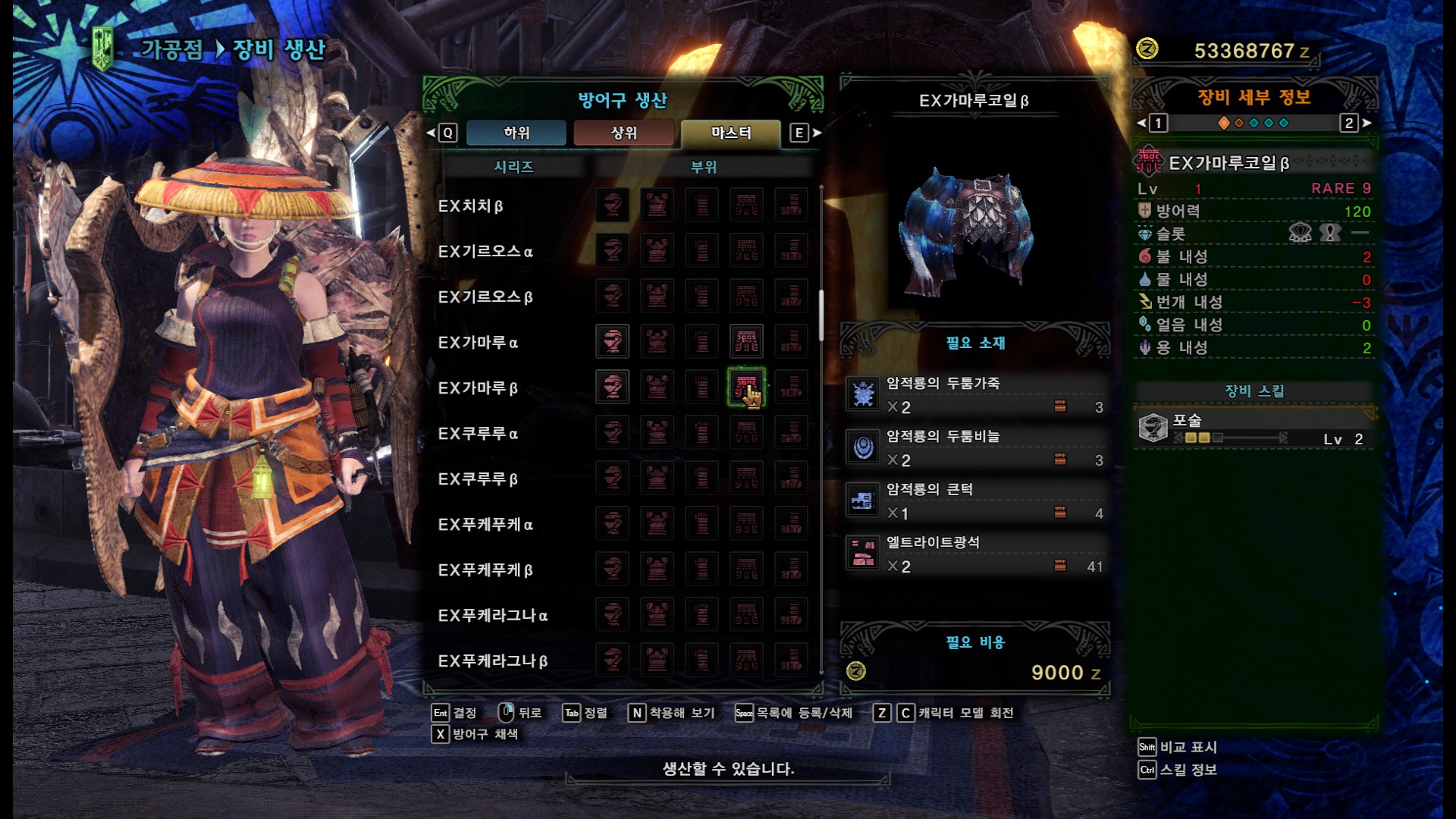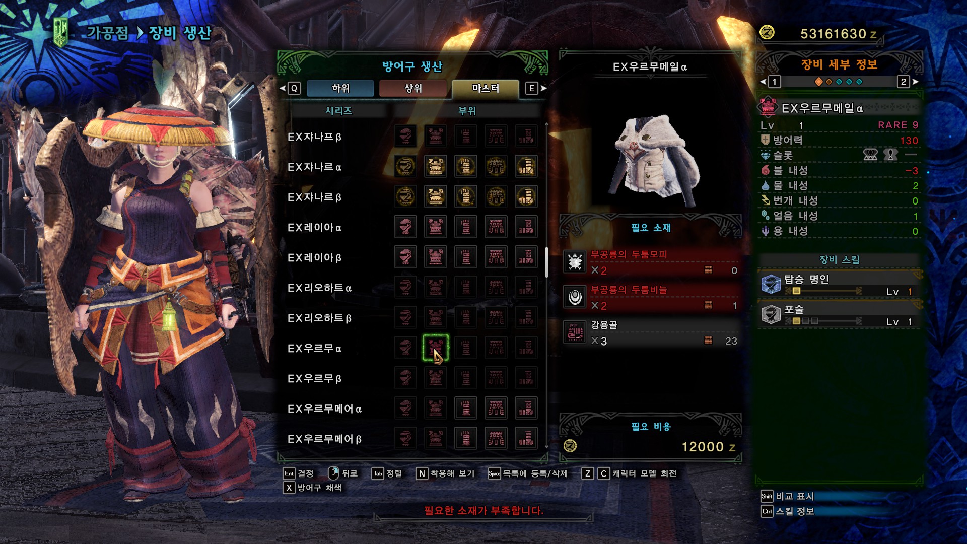 사견으로 가마루 허리, 바지나 우르므 가슴, 손으로 포술과 포탄장전수up을 챙기고 나머지는 장식주 상황+플레이 스타일에 따라서 커스텀을 짜는걸 추천드립니다. 왜냐하면 EX우르므나 EX가마루는 꽤 빨리 만들 수 있거든요.