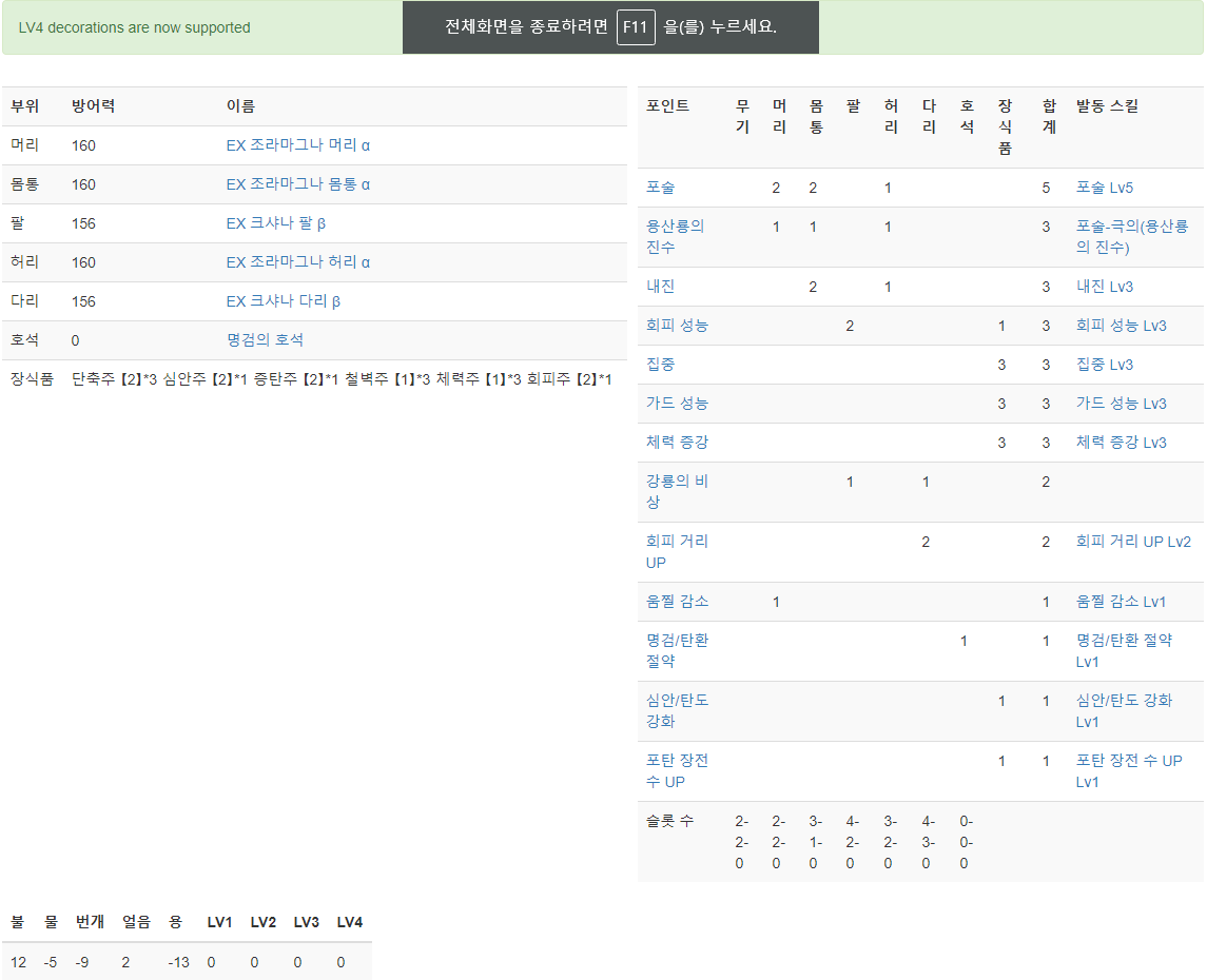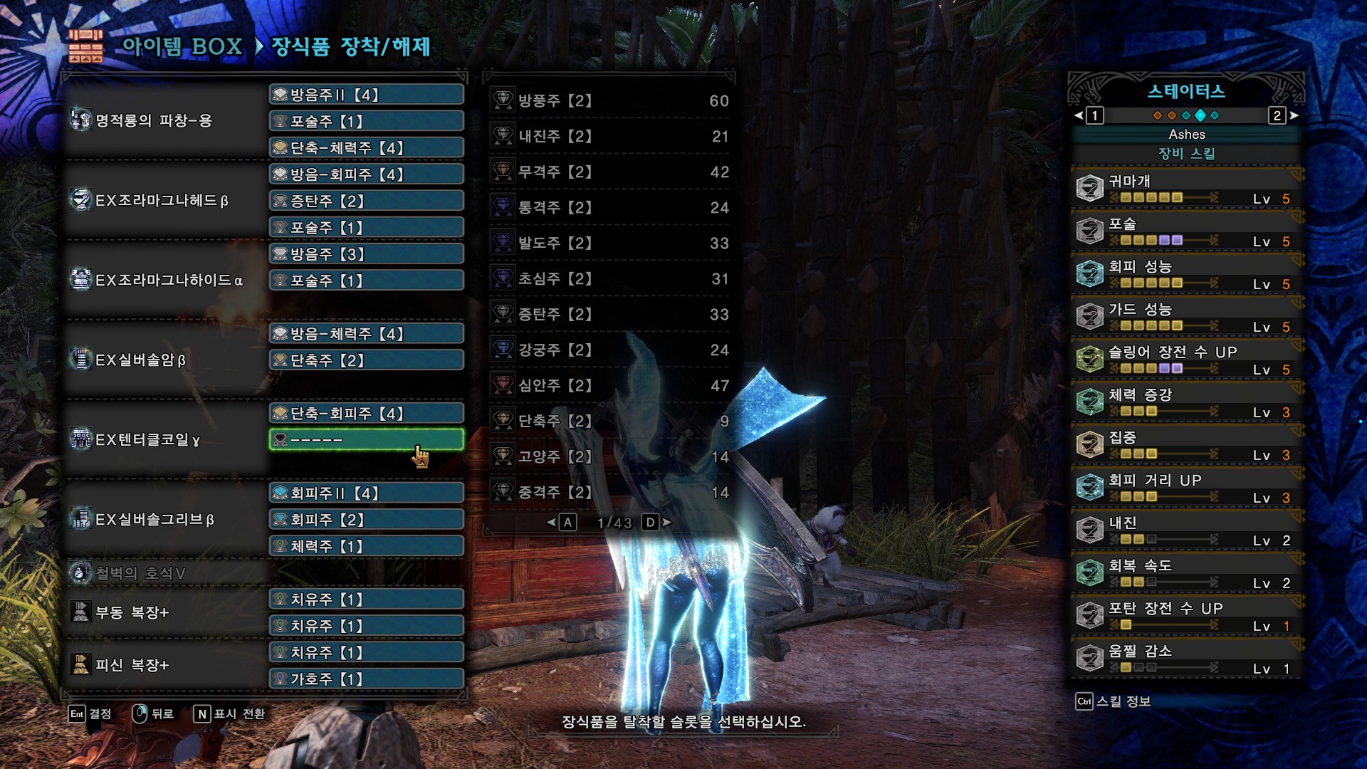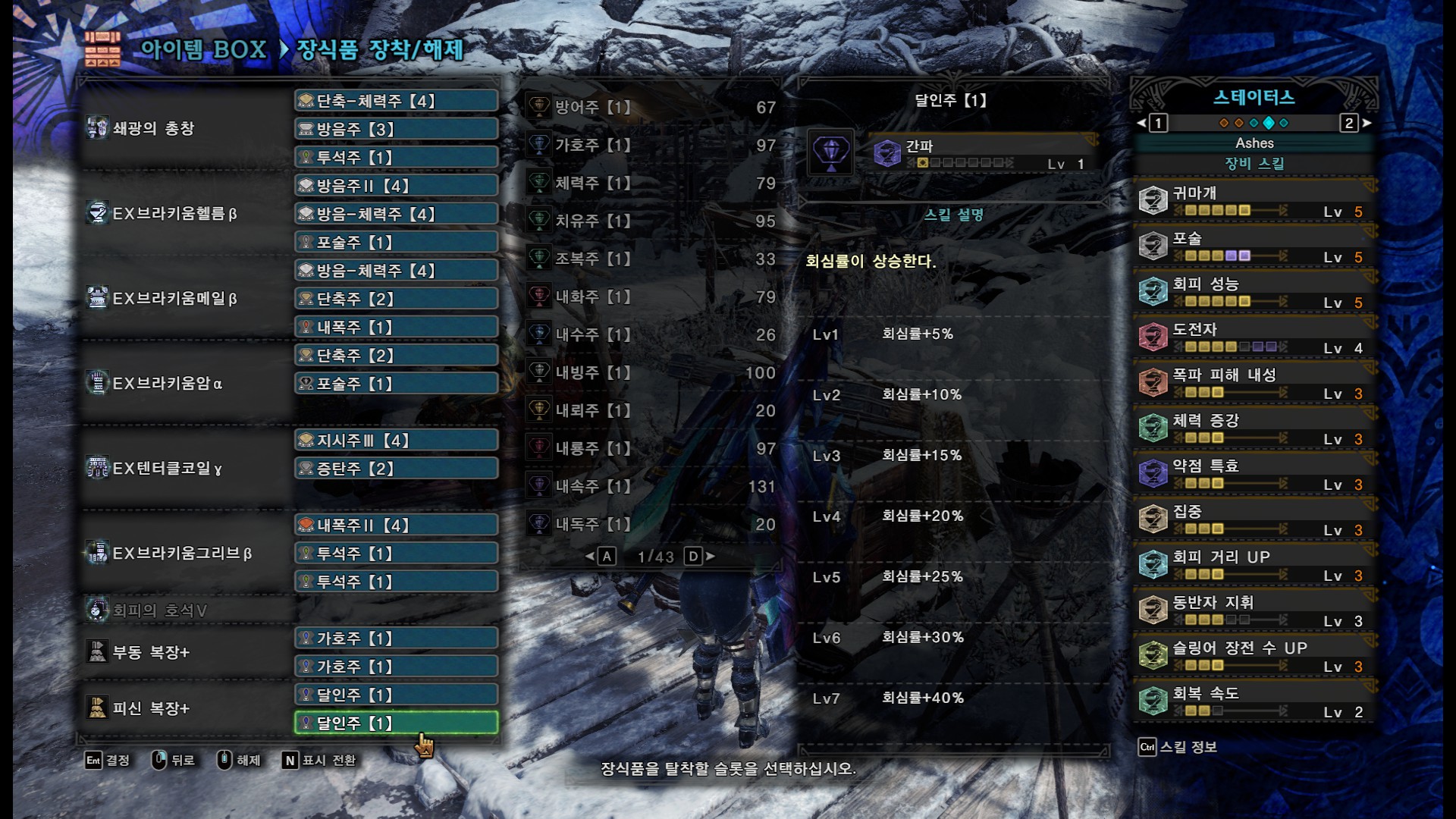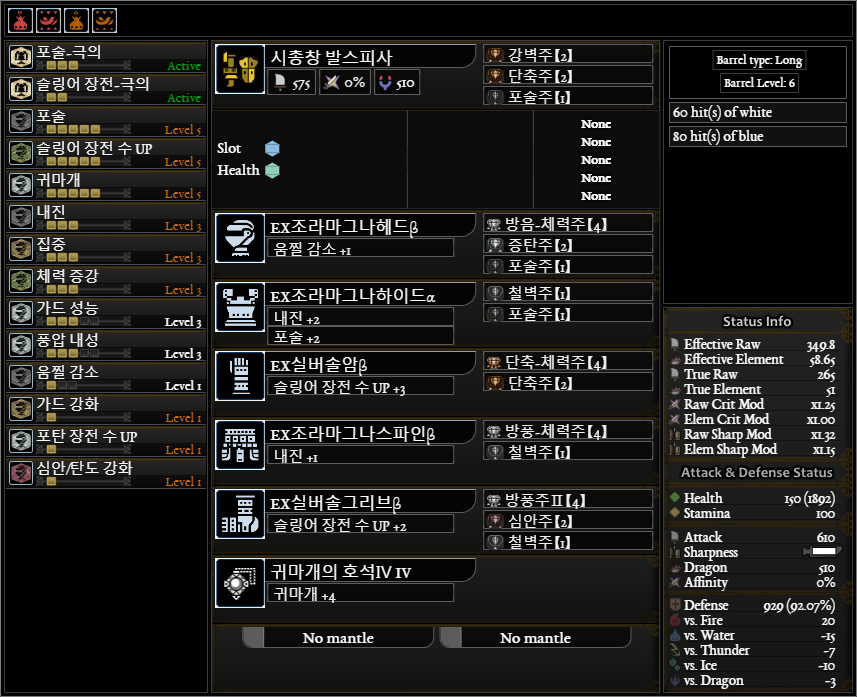 쓰다보니 가성5가 필요 없는 몹이 많고, 회성만으로는 피하기가 많이 어려운 몹들(티가렉스, 벨리오로스, 우라간킨, 라도발킨 등)이 있어서 범용으로 쓸려고 만든 커스텀입니다. 4레벨 장식주가 필요 없어서 좋은 것 같네요.
