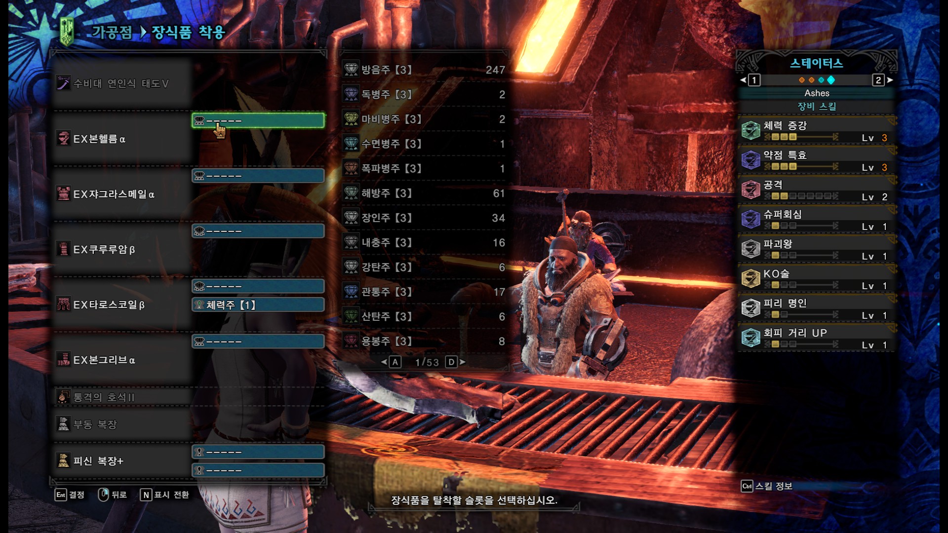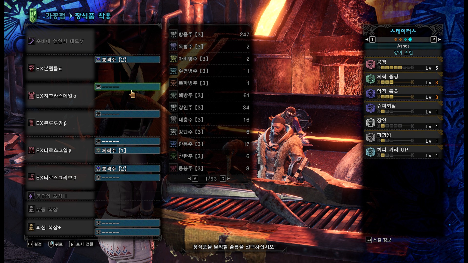 체력주1개와 통격주2개만 넣으면 위와 같은 스킬을 갖출 수 있습니다. 남은 장식주칸은 달인주, 가호주, 빨리먹기, 속납주, 초심주, 회피주, 심안주 등을 추천. 공격의 호석 대신 통격의 호석을 넣으면, 장식주 칸이 2개 더 비지만 공격스킬이 2레벨로 떨어집니다.