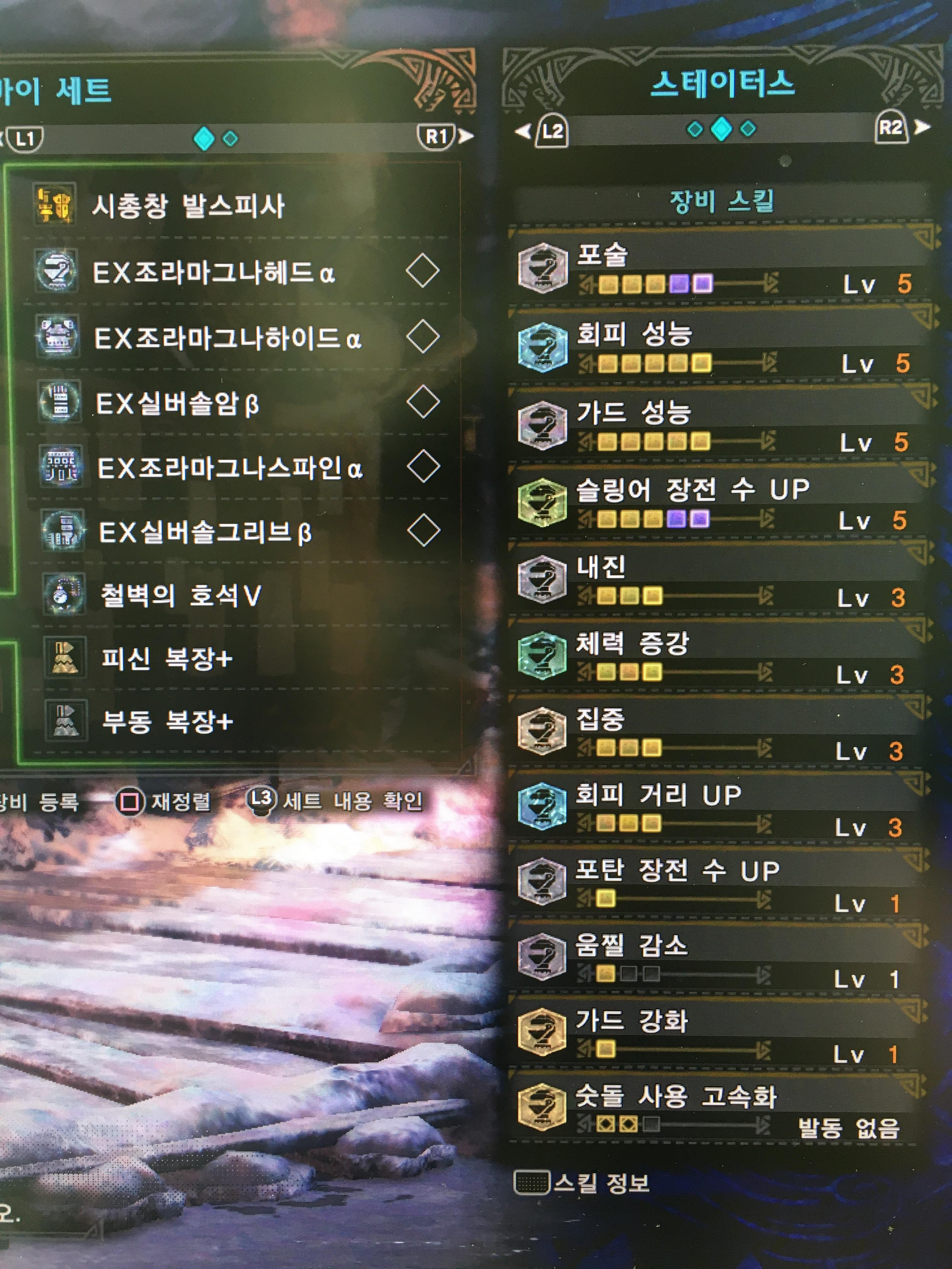 돌아다니다가 주은 커스텀입니다. 그런데 스킬 시뮬 세개를 돌려봐도 위와 동일한 스킬셋은 안나오네요..무기 커강을 슬롯으로 하진 않았을텐데 대체 무슨 수로 만든건지. 방어구도 보면 pc에 다 있는건데 플스판이라고 강화가 다를 리도 없고(...)