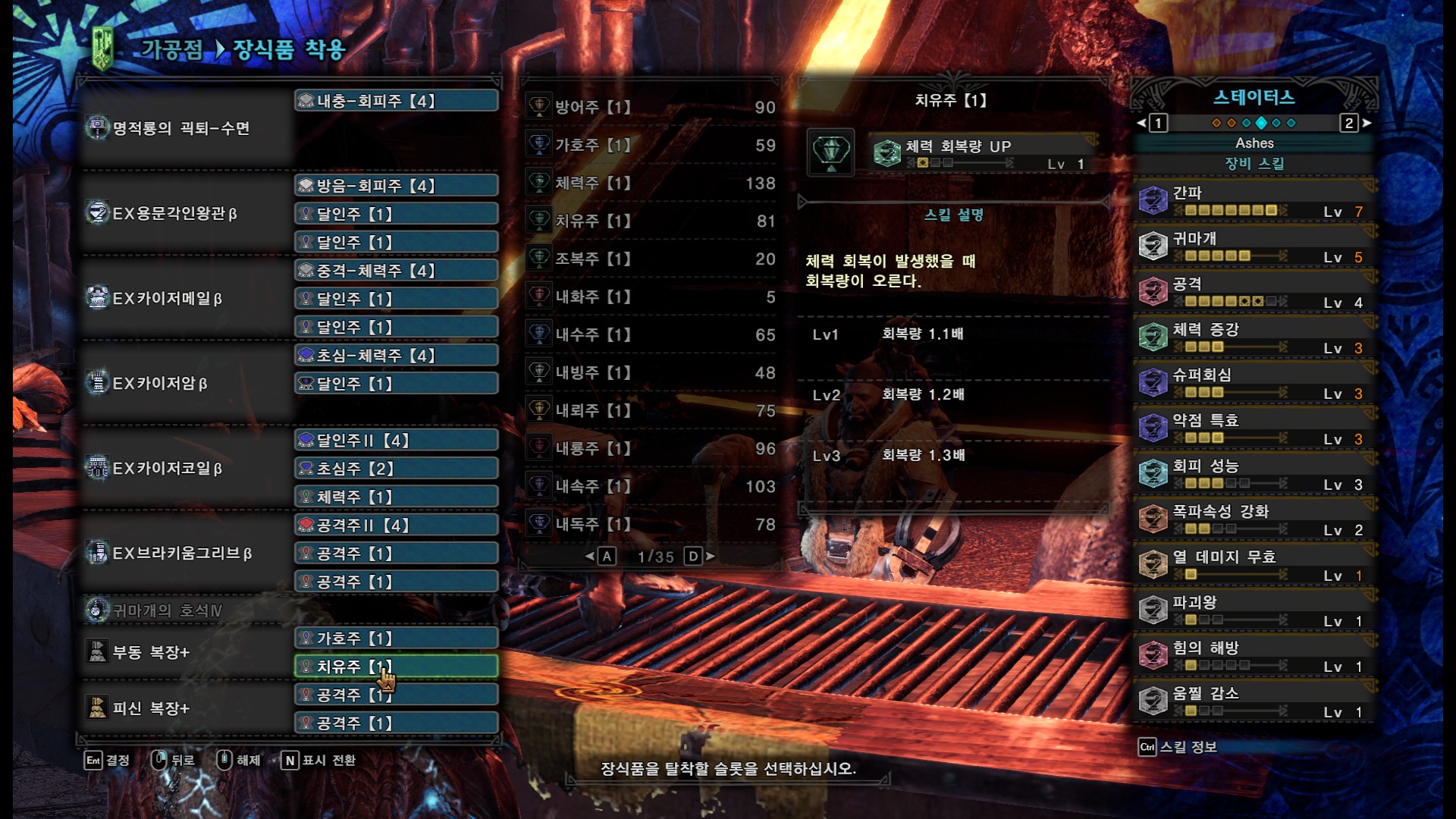 필요 장식주 : 초심주 1개, 달인주 2개, 초심-회피 2개, 내충주 1개(멀티용), 통격주 2개, 무결주 1개.
