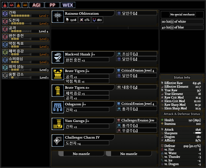 무기 각성은 예55공655로 하시거나, 공65555 둘중에 하나를 추천드립니다. 도전자5 커스텀입니다. 비연이 들어가 있어서 롤링썬더나 단차 공격을 할 때 딜뽕이 좋습니다. 약점기준 회심 : 5 40 5 30(상처 부위 2..