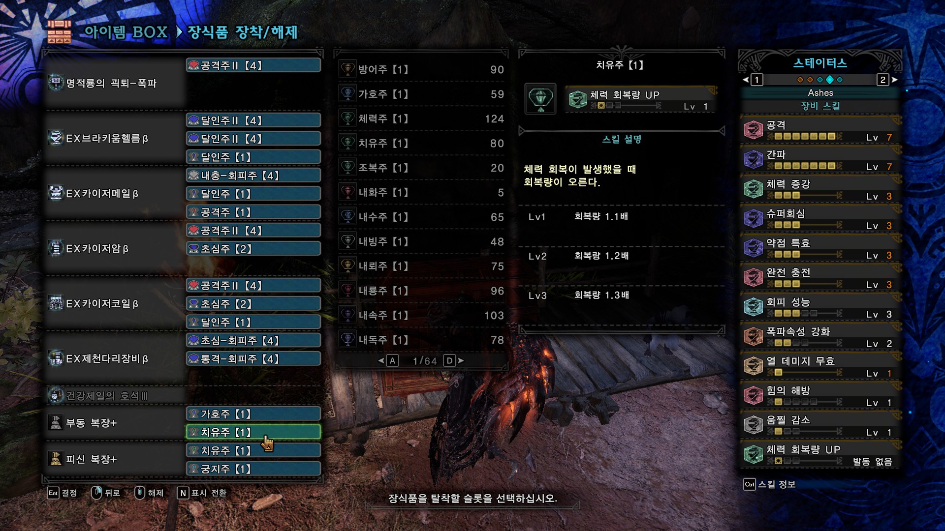 방어구는 죽발하 머리 알파, 렉스로어 베타, 렉스로어 알파, 가론 베타, 가루루가 베타입니다.