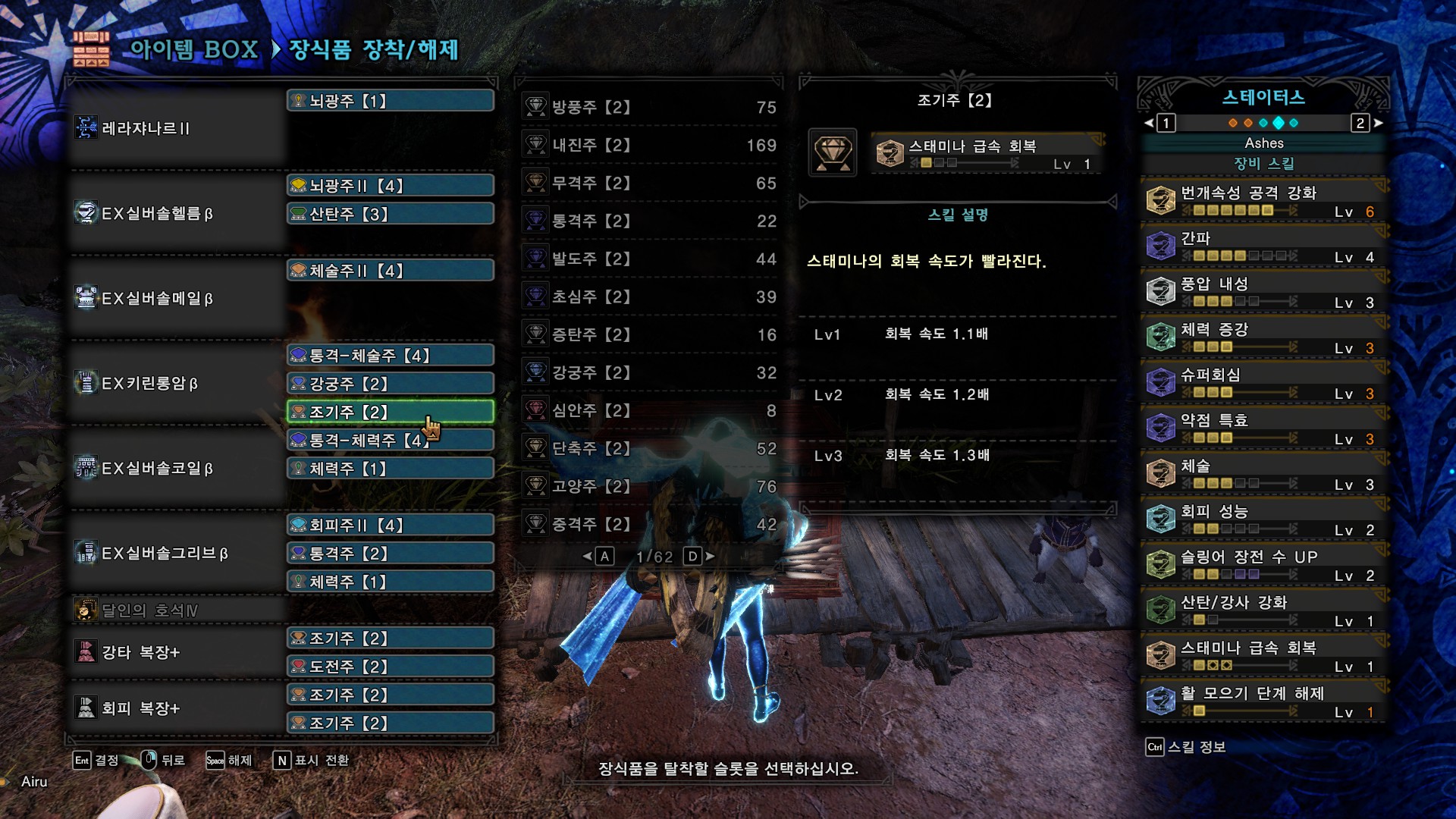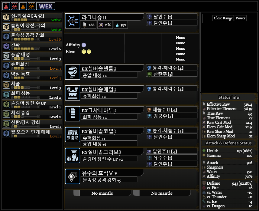 커스텀 강화 : 회심 1 속성상태이상1 방어1(추후에 라잔 업데이트 후에는 방어대신 속성강화를 더 하면 될듯)