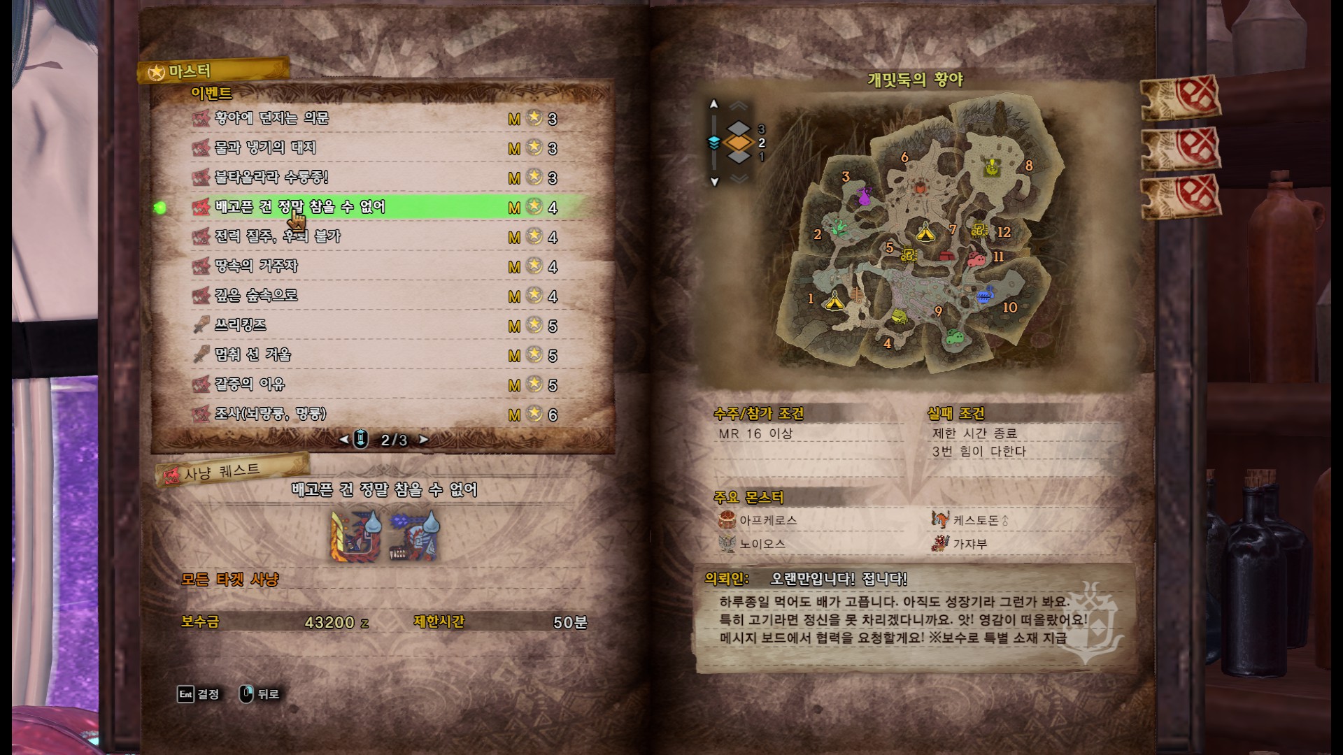 고기 해머를 만드는데 필요한 소재를 주는 퀘스트, "배고픈 건 정말 참을 수 없어"