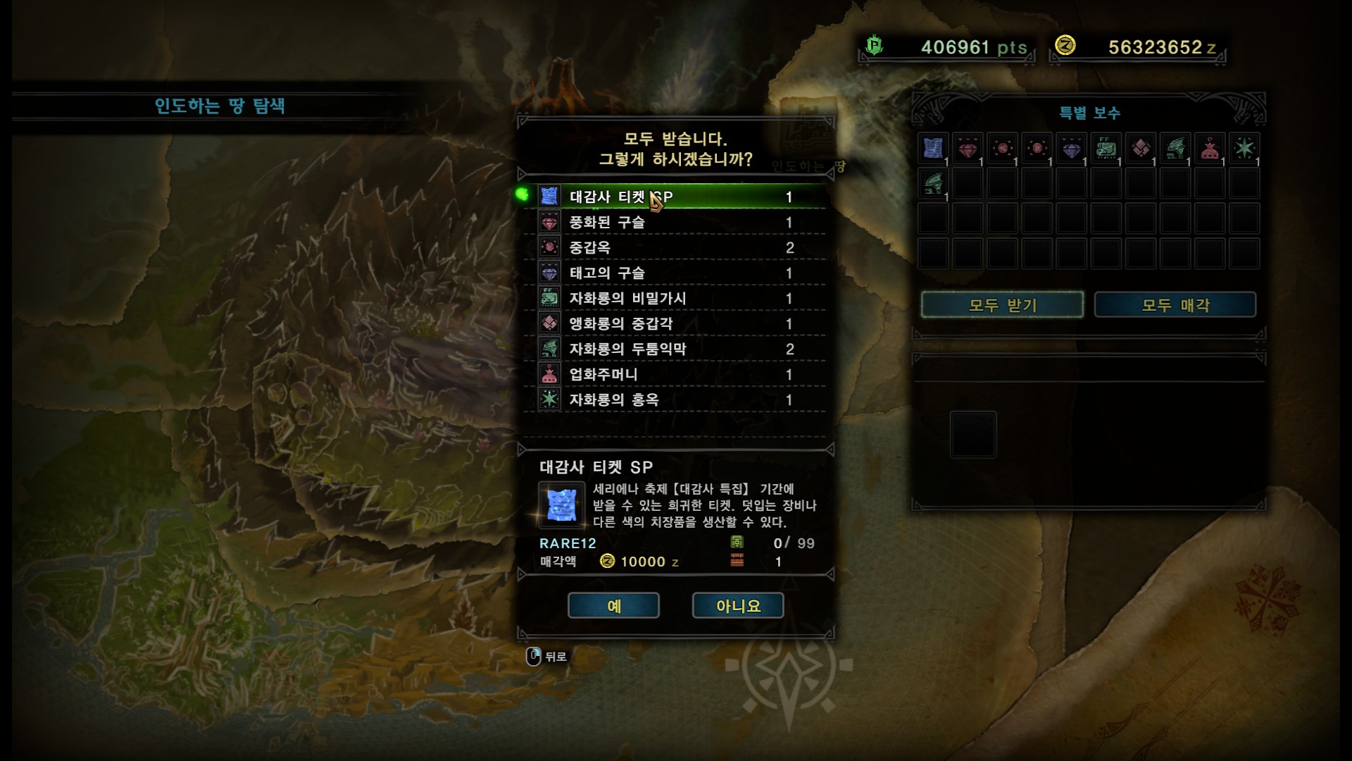 가장 중요한(?) 대감사 티켓은 조사퀘스트, 이벤트퀘스트 뿐만 아니라 인도하는 땅에서도 획득가능합니다. 물론 노리고 먹기에는 확률이 상당히 낮기 때문에(체감상 위험도3 이상의 퀘스트나 인땅 역전고룡 다합쳐서 10마리쯤 잡아야 한번 떨어지는 느낌) 이벤트 퀘스트 "그 아리따운 자태에는 주의를" 여러번 클리어 하시는걸 추천드립니다.