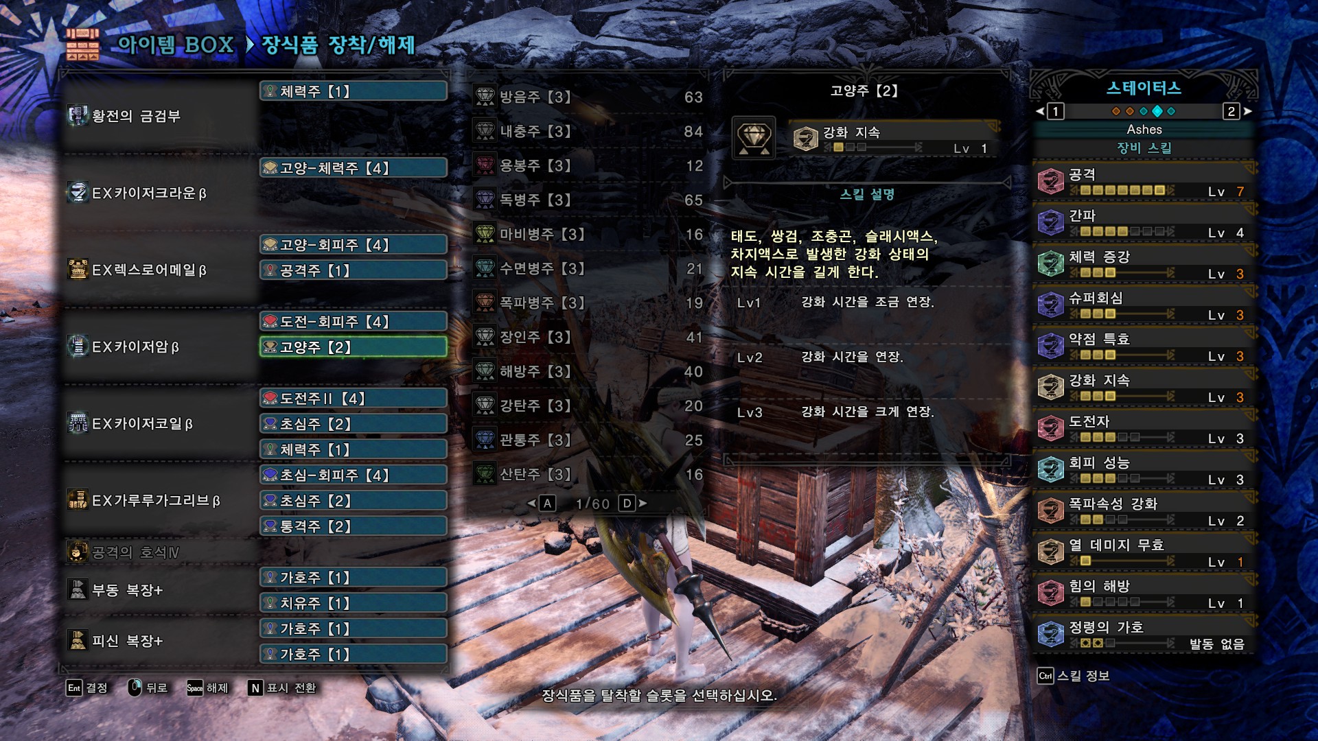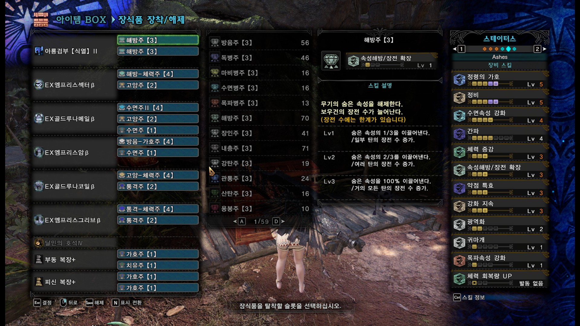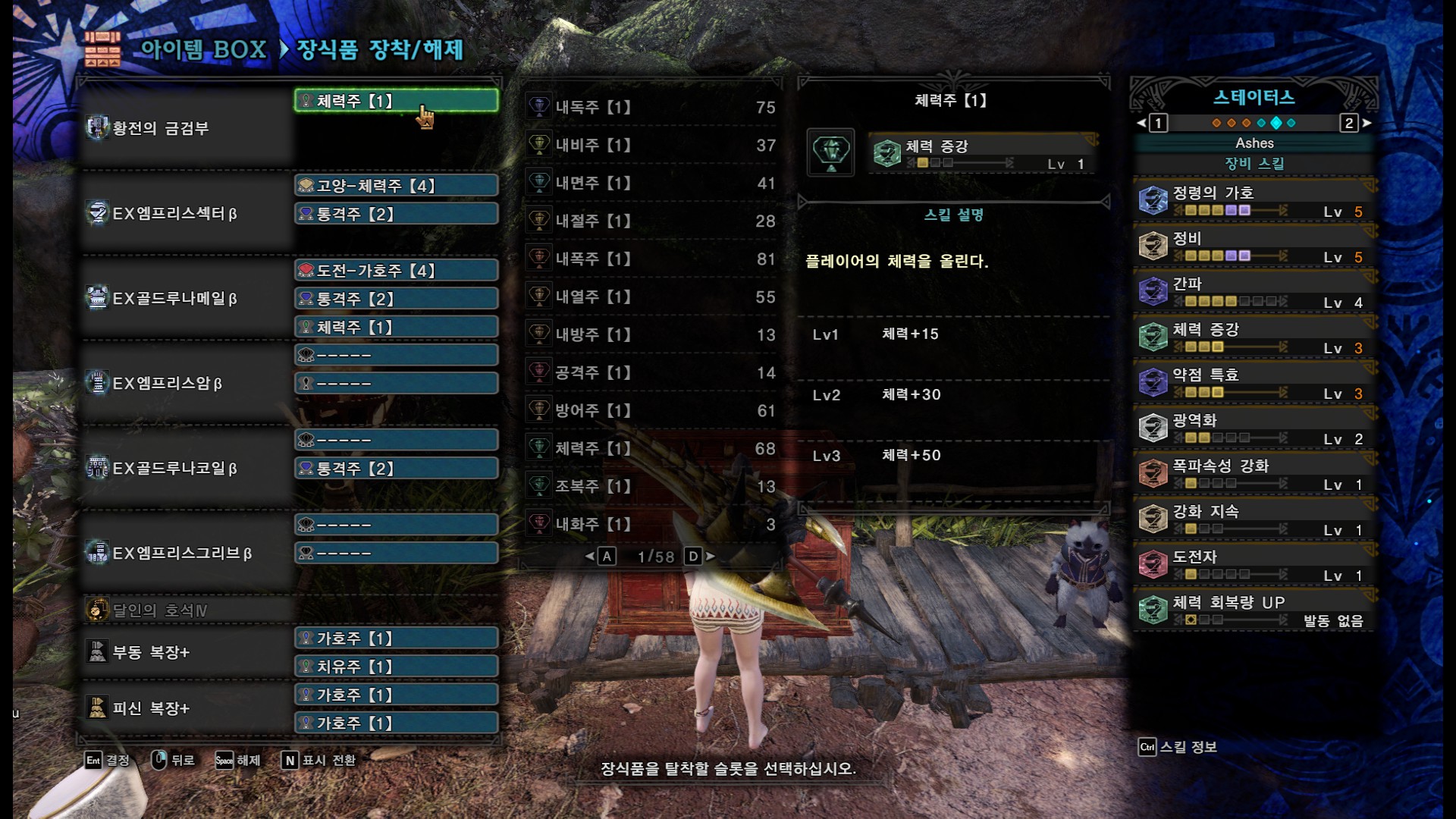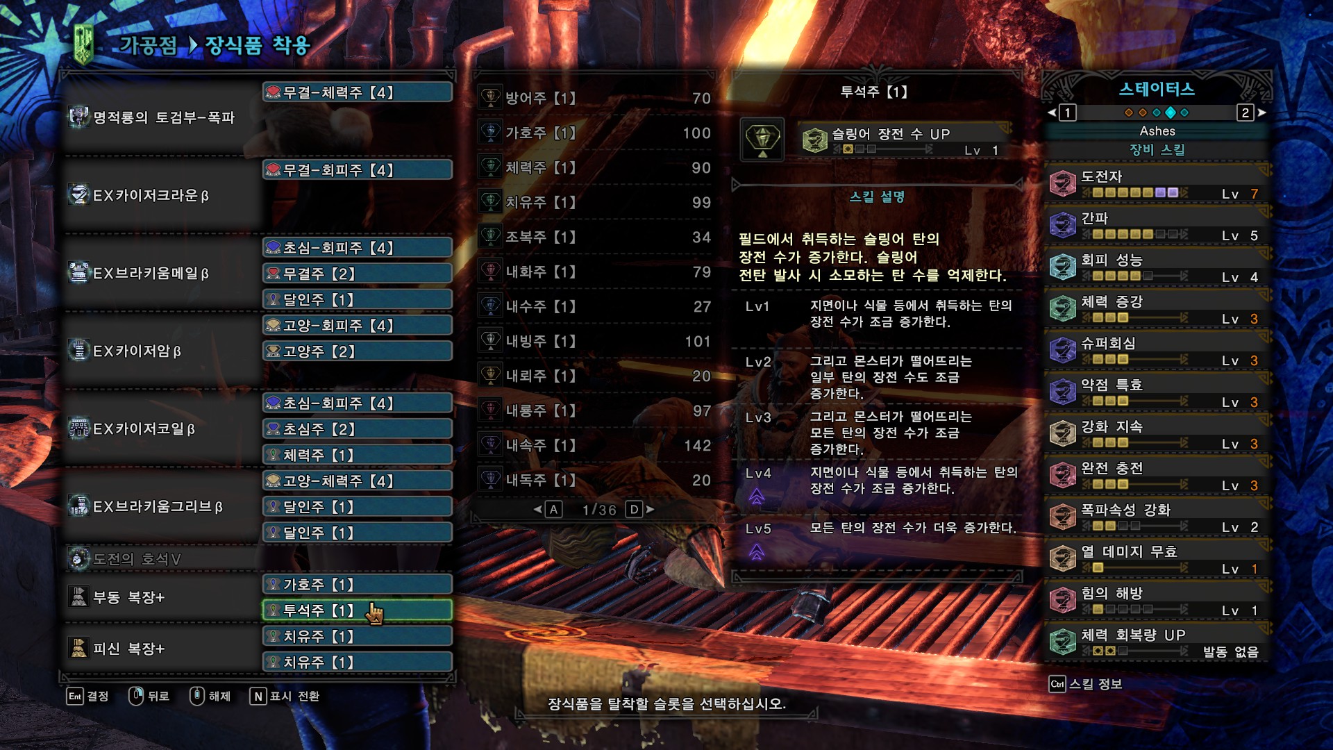 호석은 공격의 호석 대신 집중, 강화지속, 회피 호석 등을 추천(장인의 호석은 과투자). 귀마개1을 챙기면 포효를 씹으면서 영거리 속성해방을 쓸 수 있어서 좋습니다. 개인적으로 강격병 슬액은 집중보다는 강화지속이 좋다고 생각합니다. 고출력이 켜졌을때 강화지속3의 체감이 상당해서 한번 써보면 못빼는 수준..