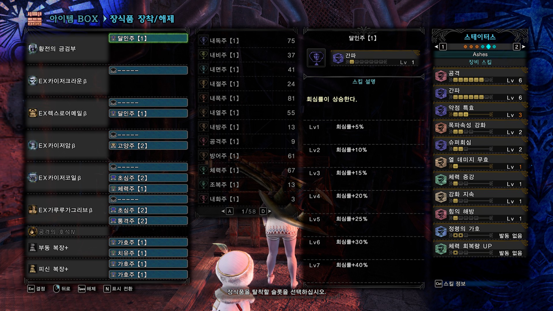 약점기준 회심 : 5 40 5 30(상처 부위 공격시 20%추가)=80%(100%) 범용으로 쓰는 딜딸 완충 슬액 커스텀입니다. 약점기준 회심 : 5 40 5 30(상처 부위 공격시 20%추가)=80%(100%) 회성4와 회거2가 들어간 커스텀..