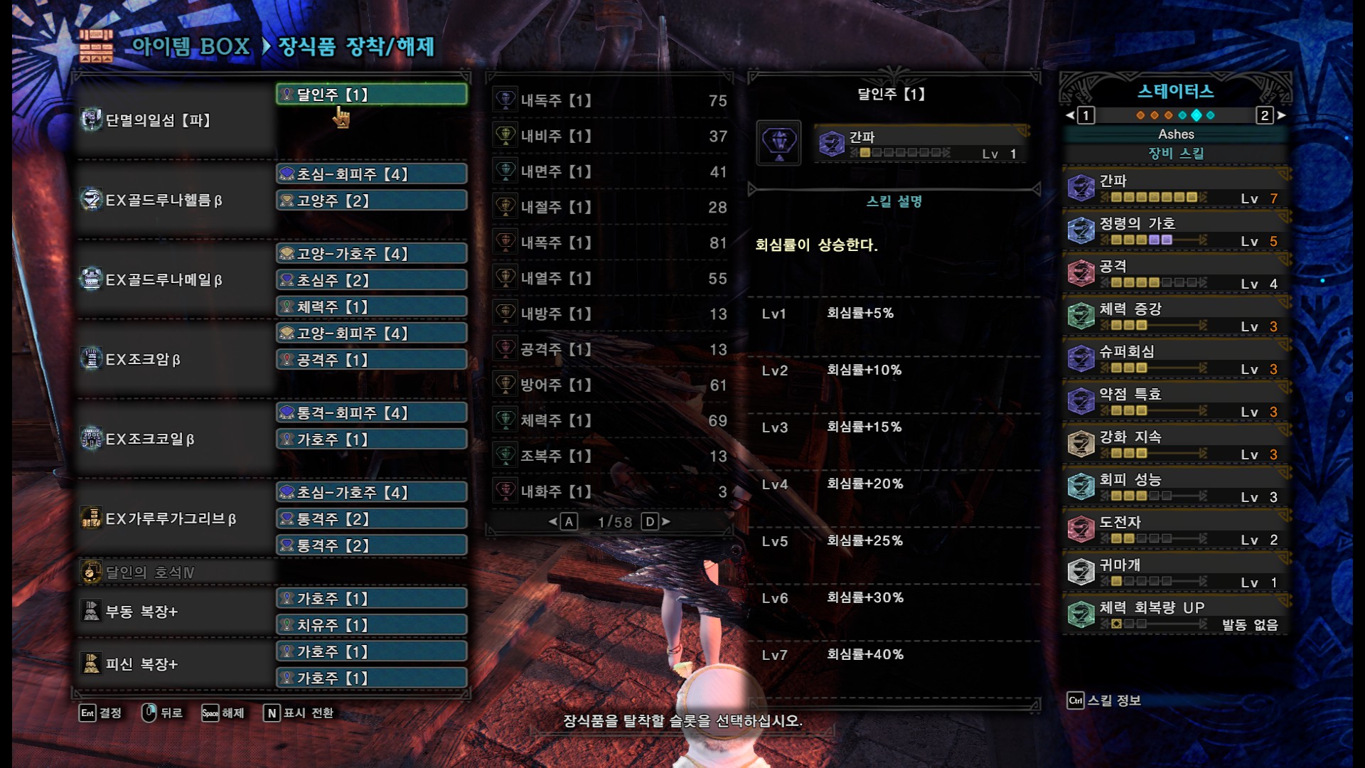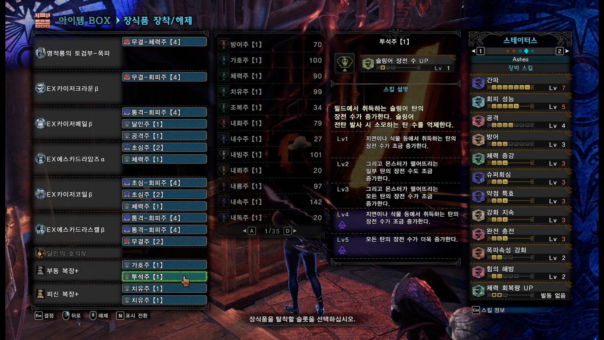 커스텀 강화 : 회복1 고정. 나머지는 슬롯, 회심 등을 추천. 회복커강2는 효율이 떨어져서 비추.