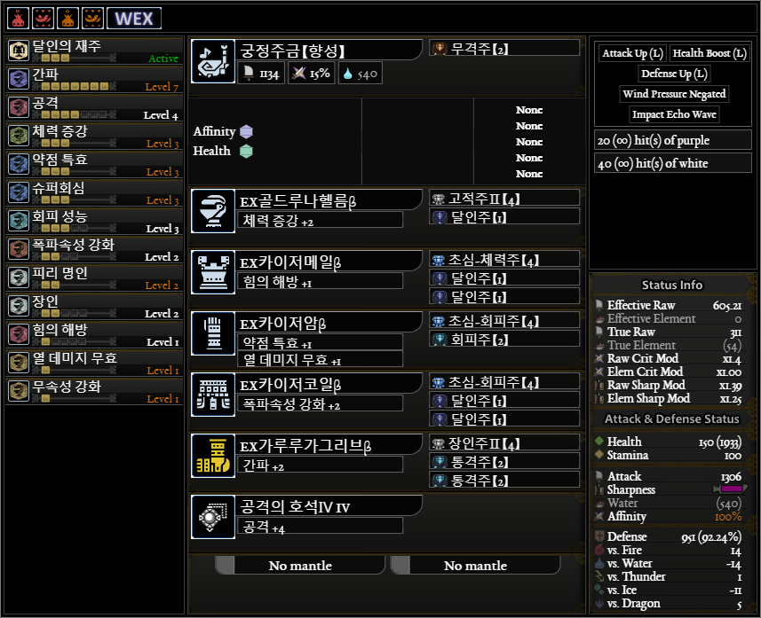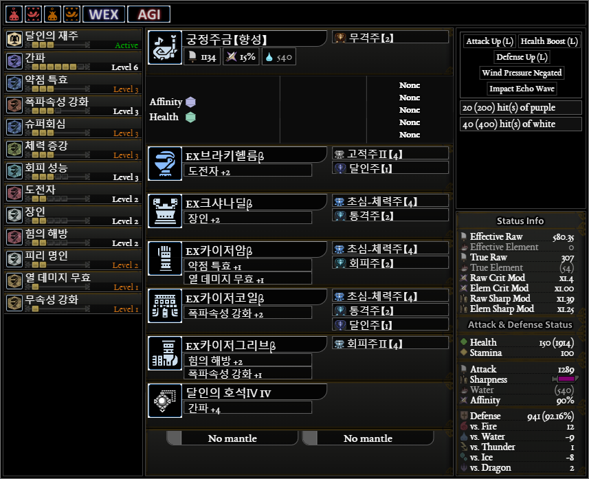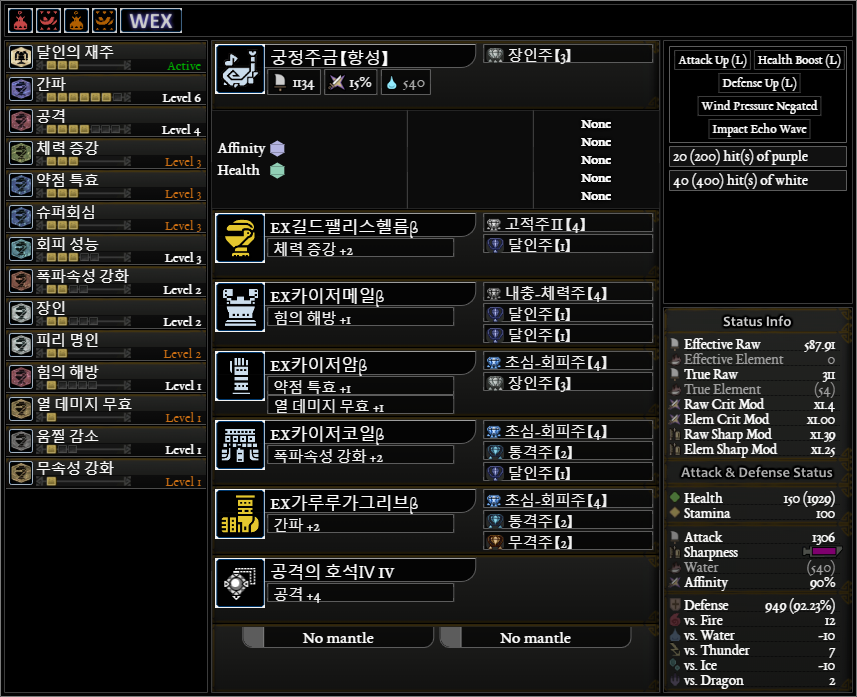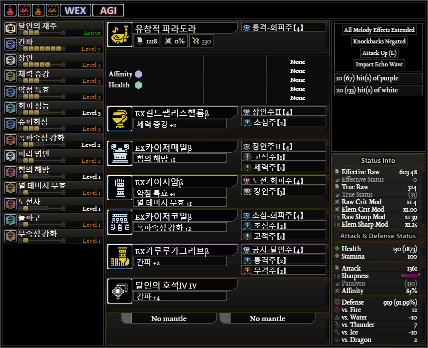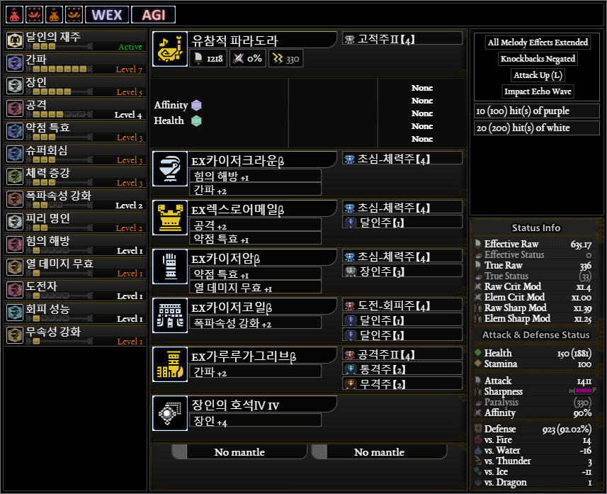 일반적인 공격용(?) 피리 커스텀입니다. 약점 기준 회심 : 5 40 5 30(상처 부위 공격시 20%추가)=80%(100%), 도전자 발동시 추가 회심 및 공격력 획득 회성3 대신에 회성2+회거1도 괜찮을 것 같네요. 귀마�