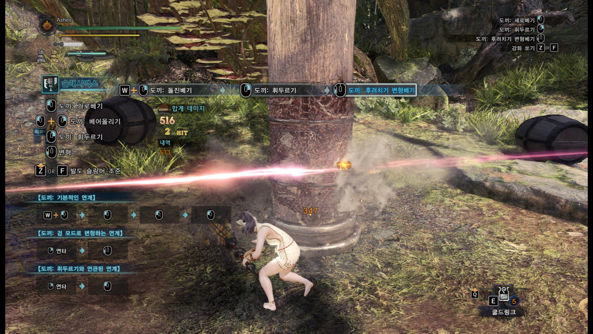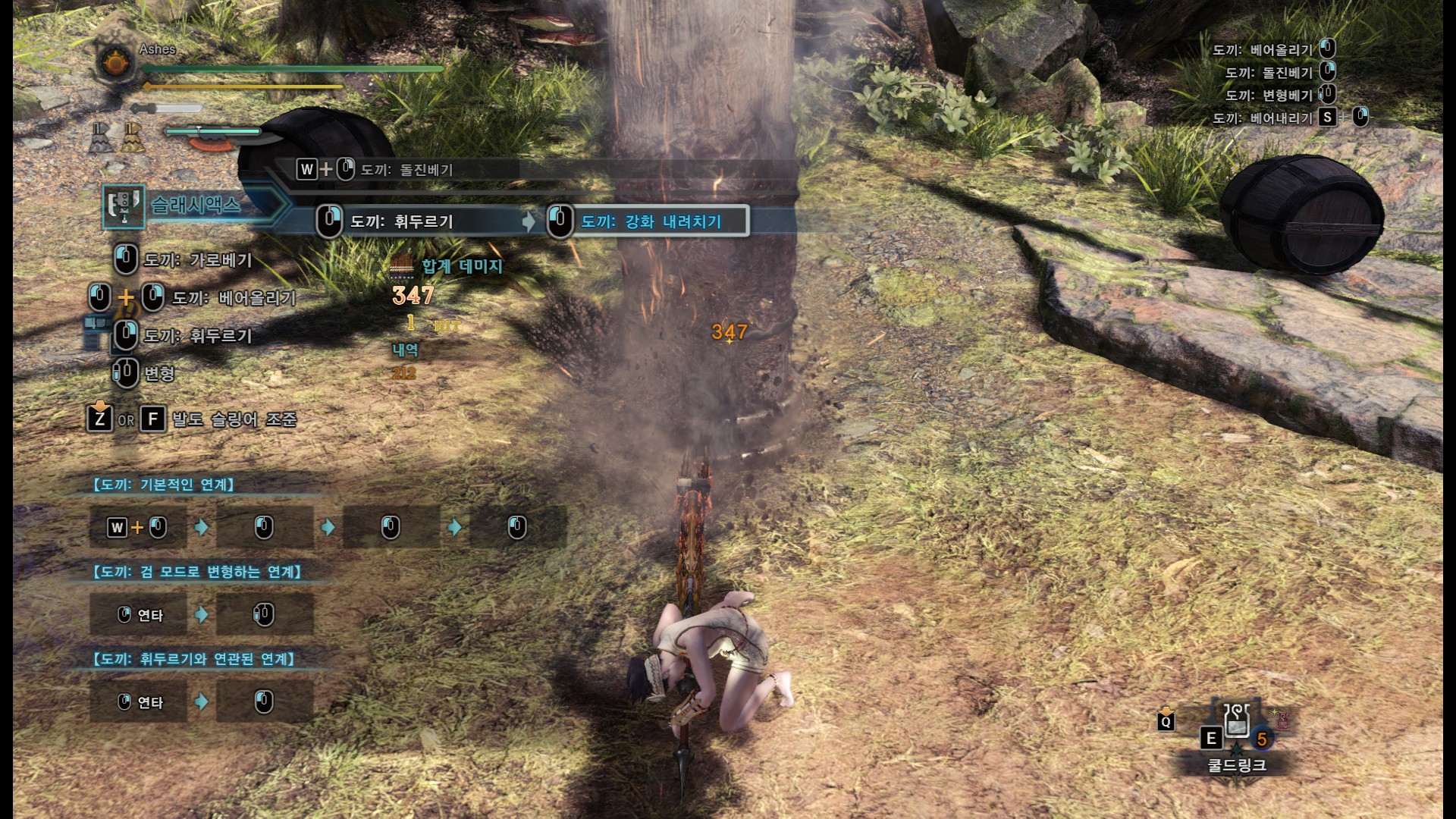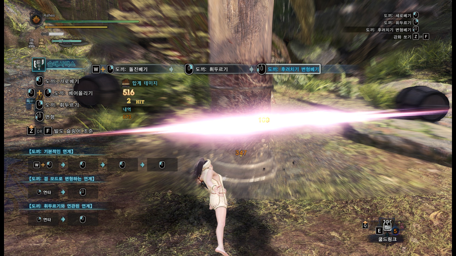 그 위치에서 그대로 붕붕이>도끼강화 막타를 넣습니다. 날보정때문인지 통나무가 튼튼해진건지 모르겠지만 347이 들어가네요. 실전에서는 약 700~800정도의 딜이 들어갈 것 같습니다. 쓸모없는 팁이지만, 도끼강화 막타는 커맨드 입력중에 A나 D를 누르면 좌나 우로 15도씩 틀어서 타격가능합니다.