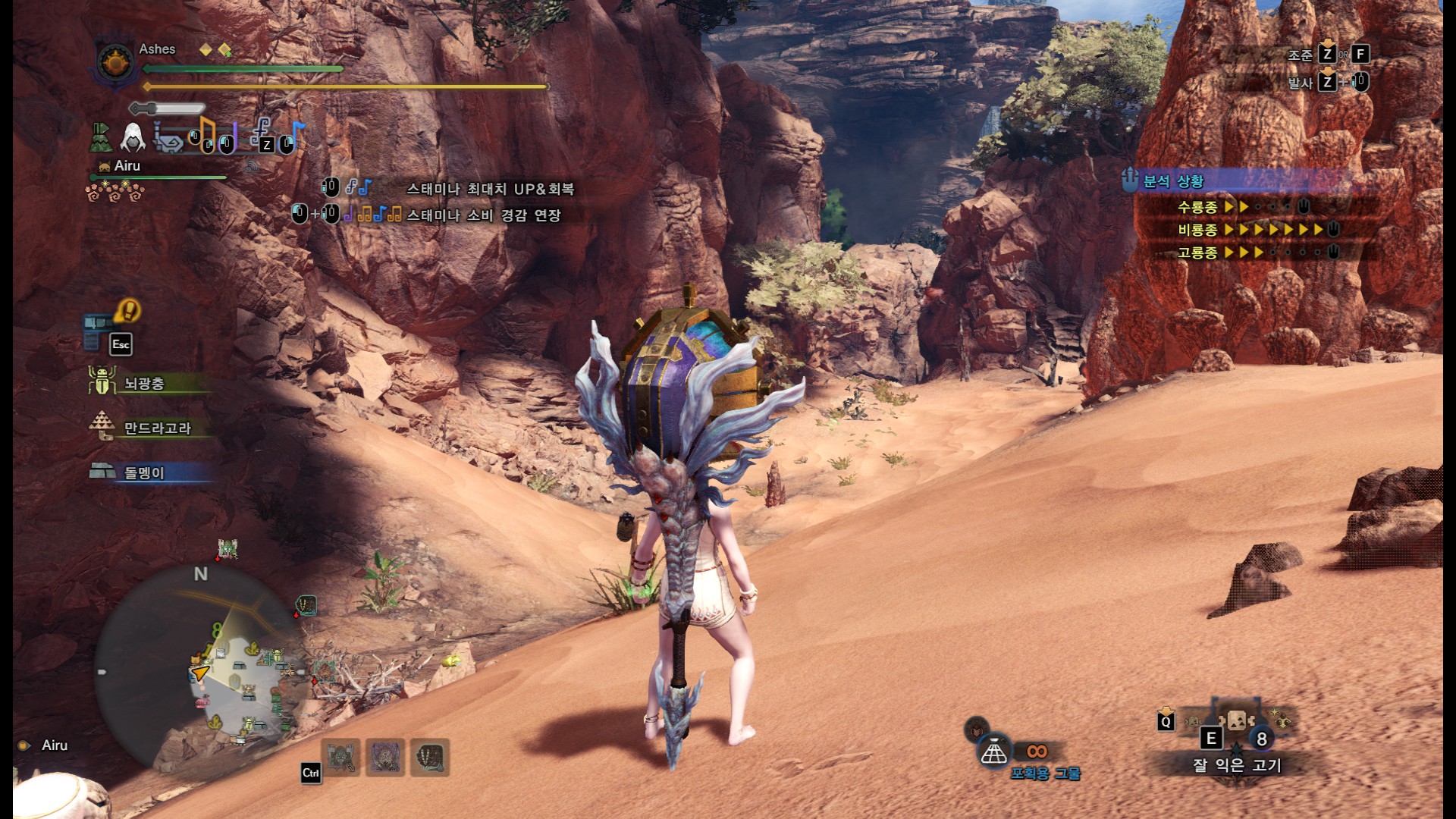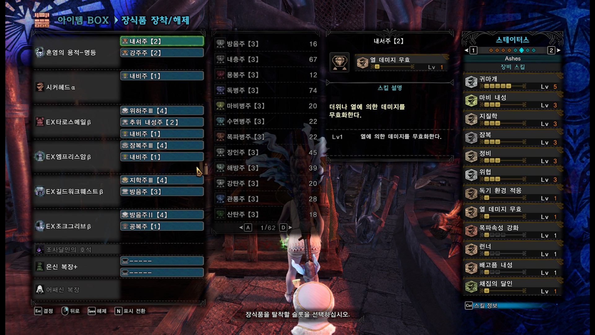 무기는 44슬롯 무기가 있으면 몇가지 스킬을 더 넣을 수 있지만, 무페토지바 업데이트 이후에나 추가되는 것 같아서 대충 33슬롯 무기로 장비했습니다. 명등피리에는 스태미너 관련 선율이 있기 때문에 뛰어다닐때 편해요.