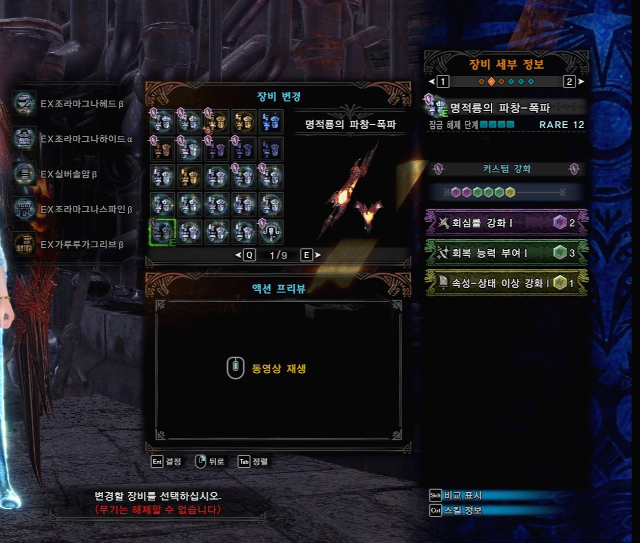 방사형 건랜스 각성은 아래와 같습니다. 커스텀 강화는 회복 고정, 나머지는 방어나 슬롯을 하시면 되는데 슬롯을 하면 무기 하나로만 4-4-1 슬롯이 확보되서 원하는 스킬을 많이 넣으실 수 있을겁니다.