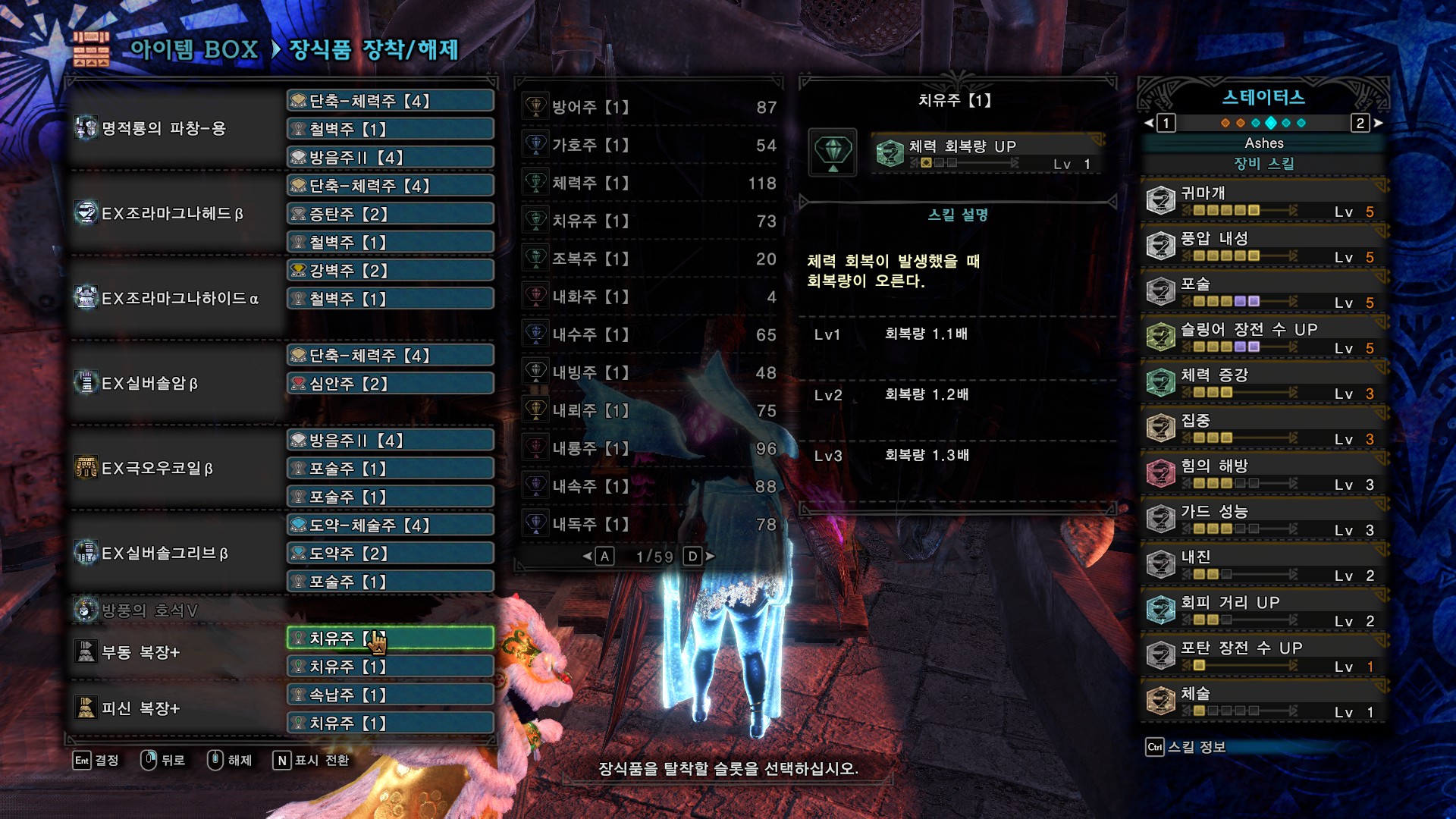 복장의 경우 부동에는 달인, 치유, 가호, 속납, 연마 같은게 쓸만하고, 피신도 동일한데 엉덩방아 찧게 만드는 공격을 많이 쓰는 몬스터 상대로는 가호주가 좋습니다. 그 외에 4레벨 장식주를 넣을 수 있는 복장을 입는다면-예를 들면, 활공에 복합 장식주를 섞어서 달인7 찍고, 약점+노상처 회심100%를 맞추는 것도 괜찮을 것 같네요.