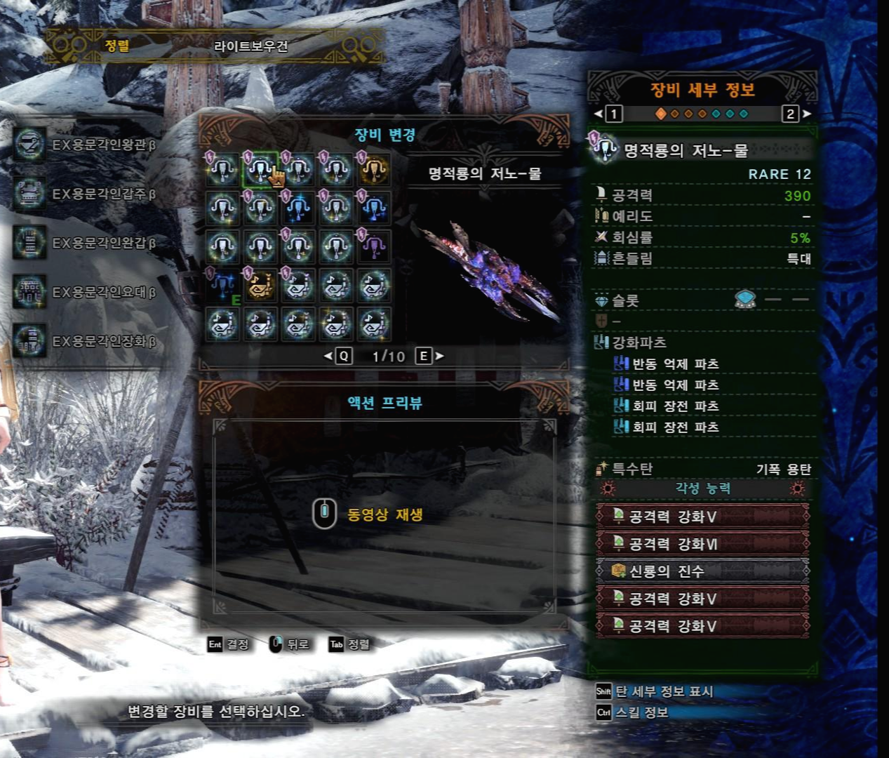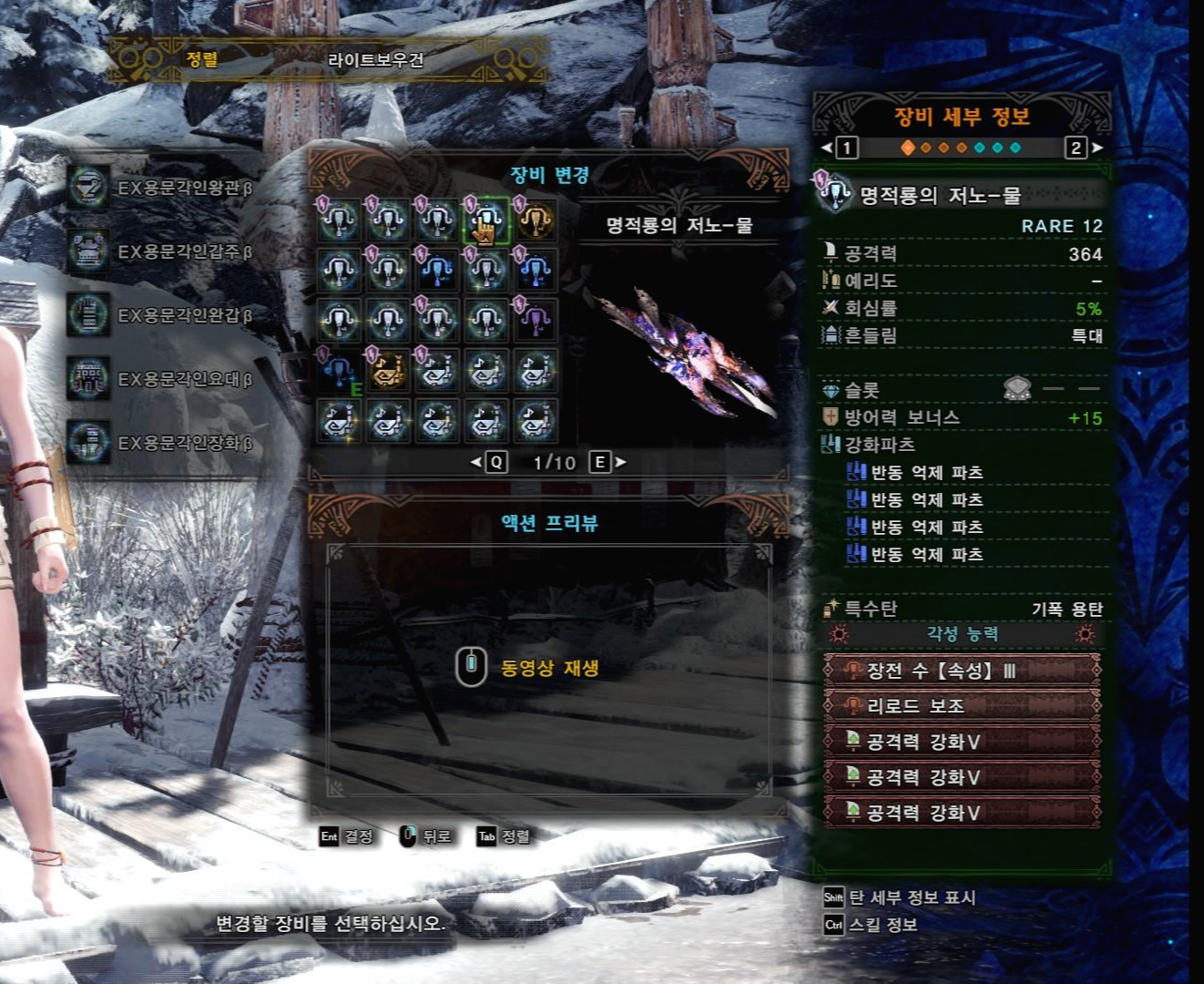 명적룡의 저노-물, 철갑탄용 각성과 커스텀 강화, 보우건 파츠는 위와 같습니다.