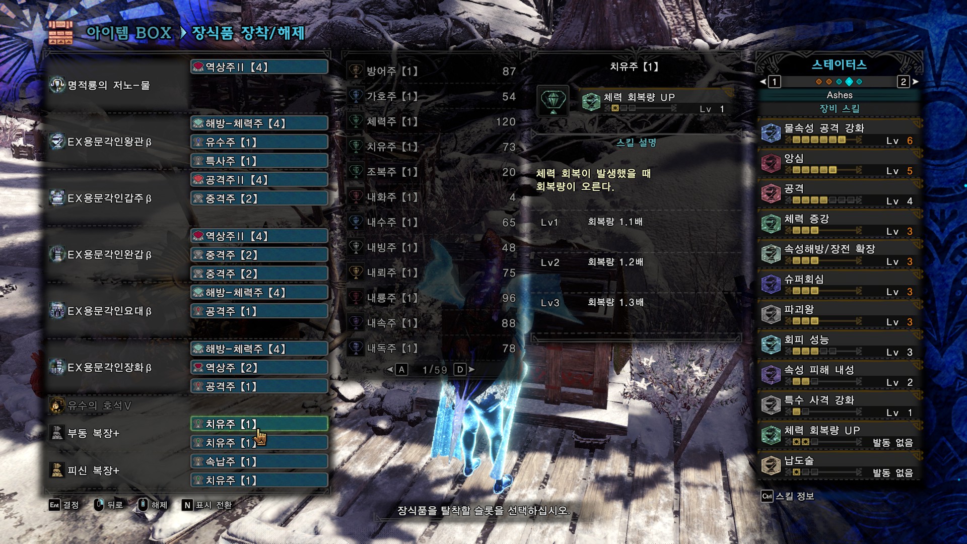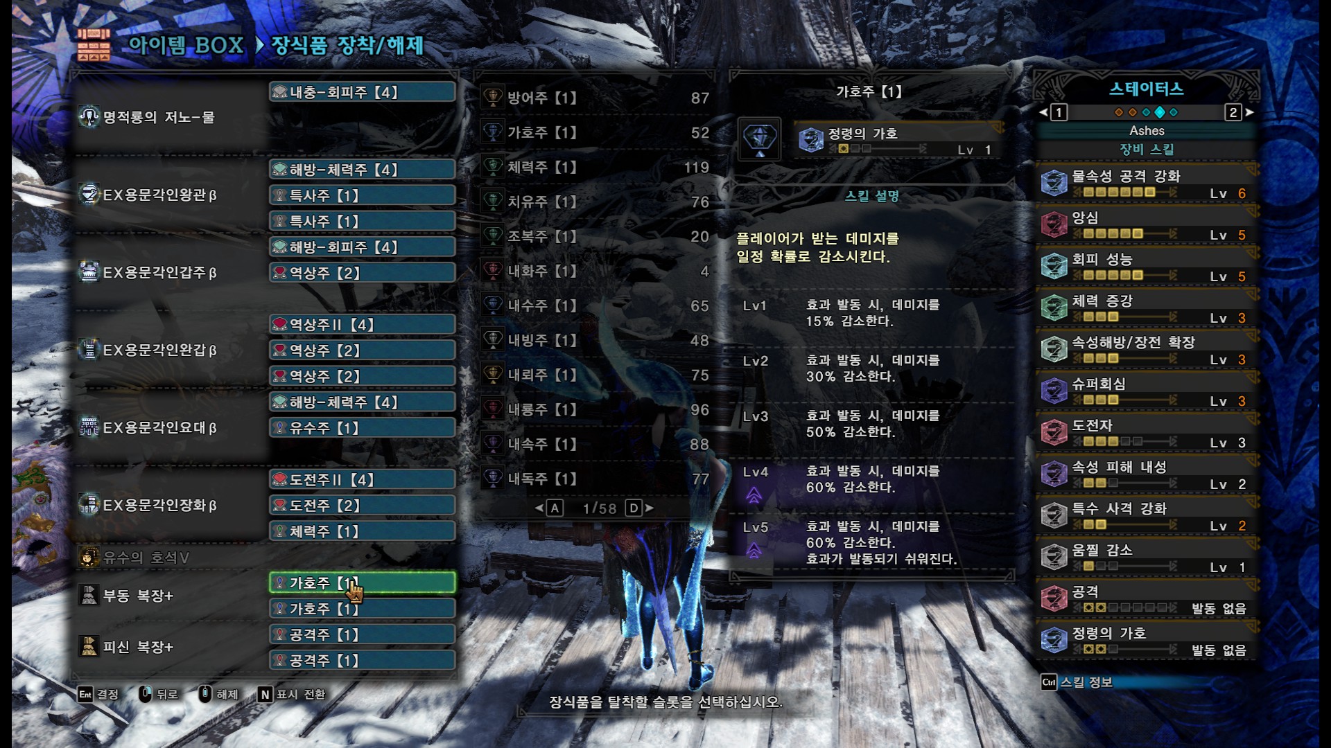 회피성능3은 용문3셋만으로 챙겨지고, 나머지 스킬을 더 챙길려고 해도 별로 챙길만한게 없어서 회피성능을 5까지 올렸습니다.