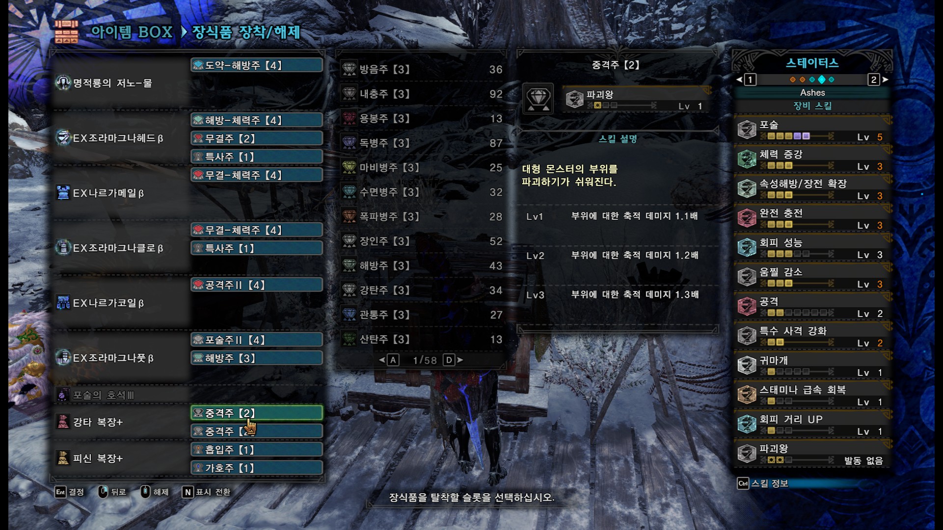 방어구와 스킬 커스텀입니다. 용문5셋을 넣고 난 후의 스킬셋은 대부분 비슷할 것 같습니다. 도전자 대신에 체술, 정령의 가호 등을 챙겨도 될 것 같고, 무페토 지바 부위파괴용으로 쓴다면 파괴왕을 넣으세요.